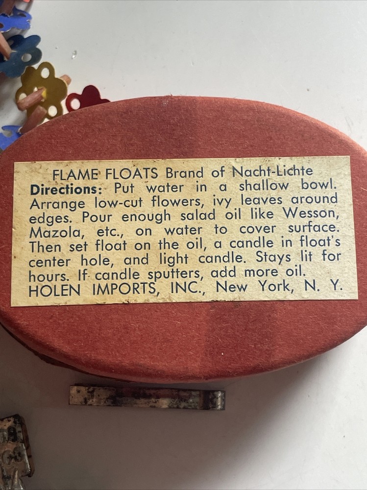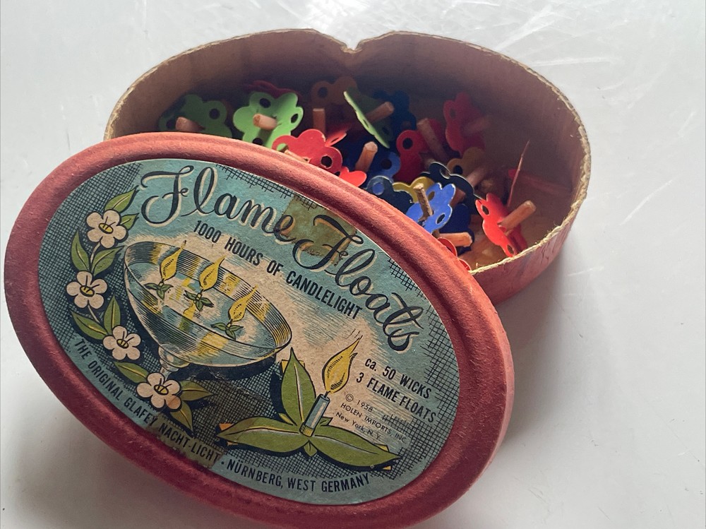 Flame Floats West Germany Vintage Holen Imports NY 2 Floaters 40 + Wicks Year 1958. More than 70 weeks, paper attached to most, two cork floats, with foil backs, made in Germany. Comes with miniature tweezers and original box. Seller claims no responsibility for damage due to neglect never leave unattended when lit. Condition is used