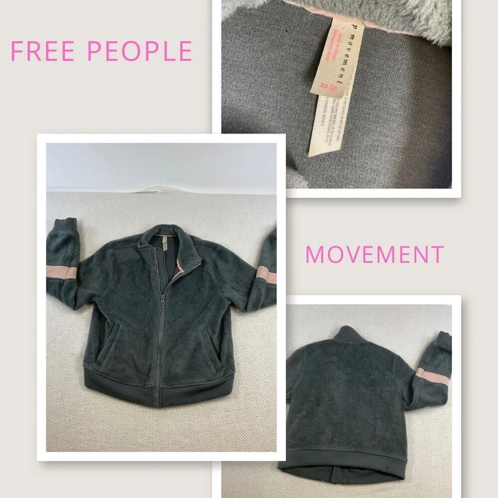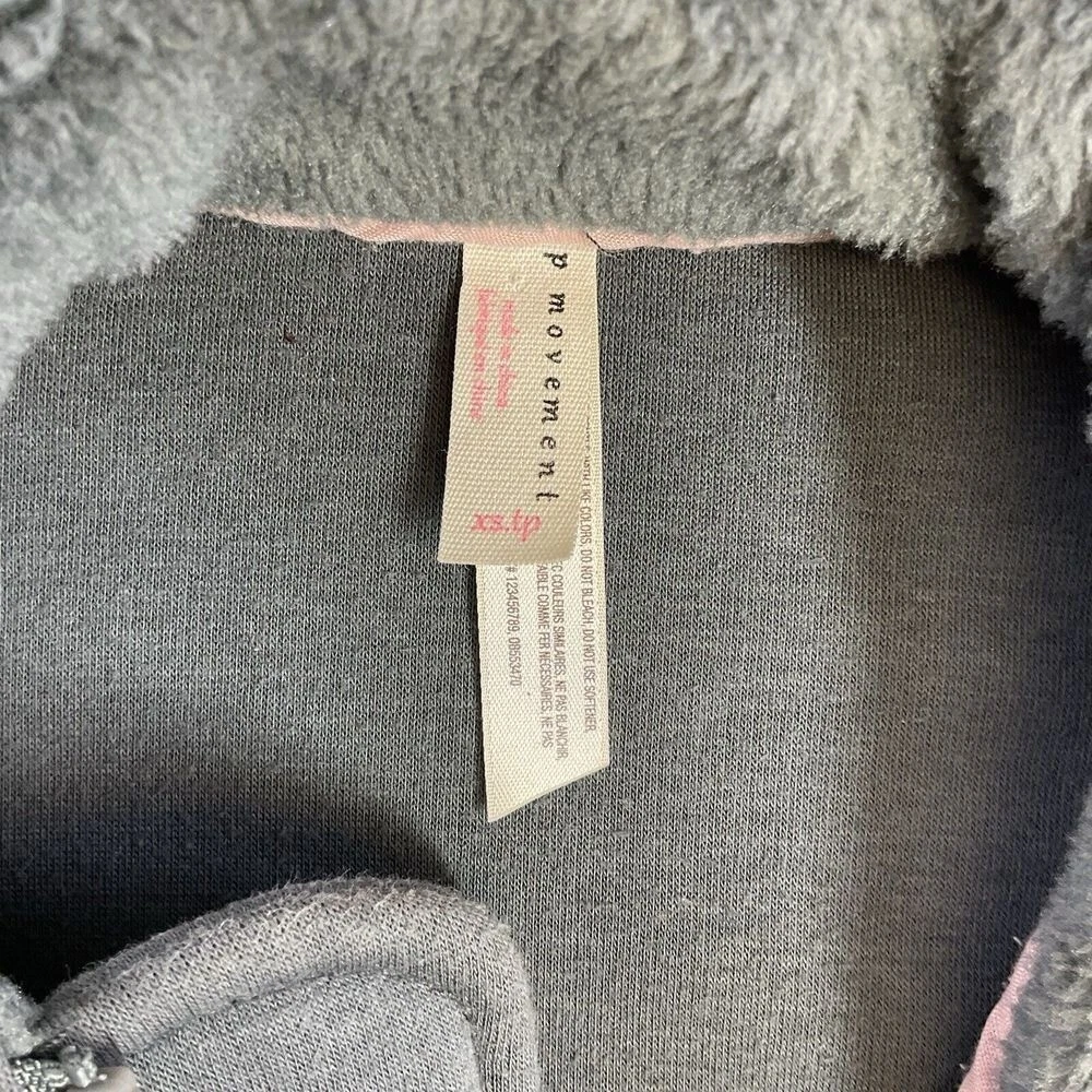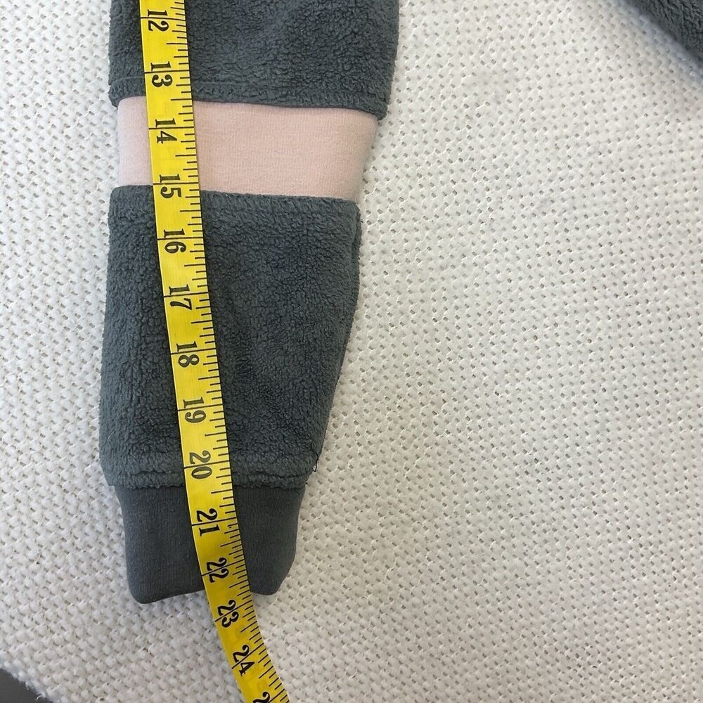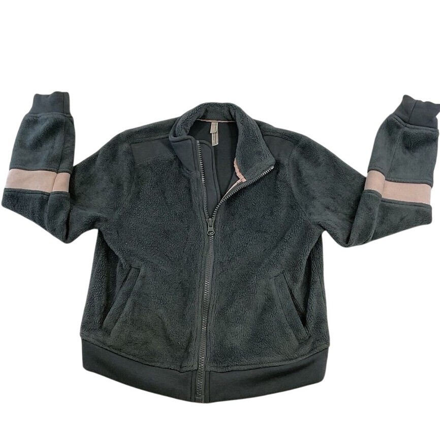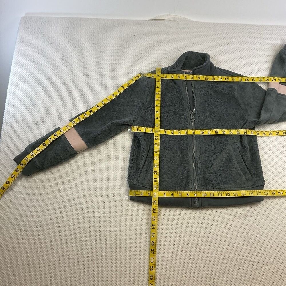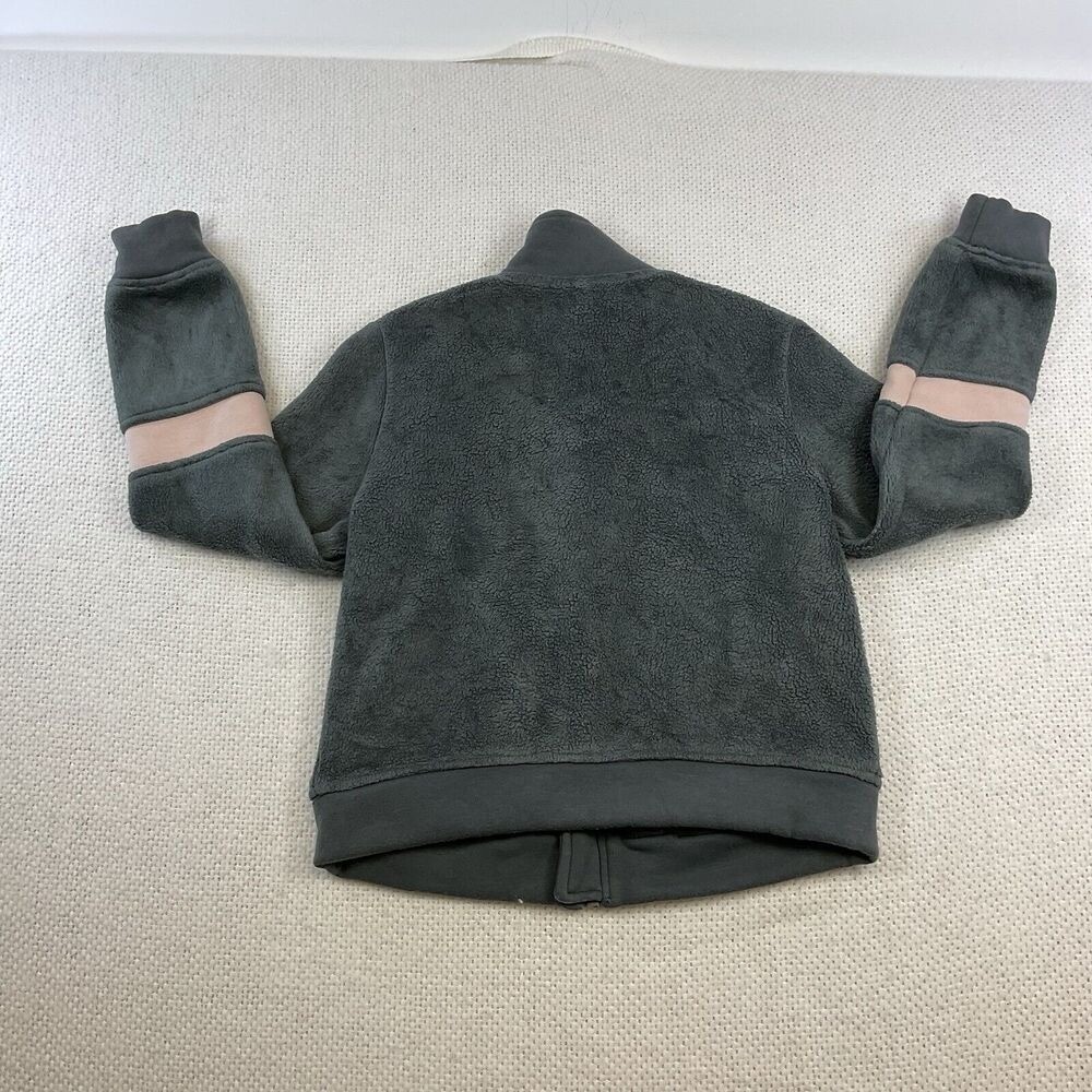 A cozy and stylish fleece jacket, perfect for layering and adding warmth to any outfit. This jacket features a full zip front for easy wear, complemented by a comfortable stand-up collar. The design includes practical front pockets and unique stripe detailing on the sleeves, adding a touch of visual interest to the soft fleece texture. The jacket's overall construction ensures a comfortable fit and a versatile look. Keywords: fleece jacket, full zip jacket, gray jacket, pink stripe, cozy jacket, warm jacket, casual jacket, fleece coat, womens jacket, athletic jacket, comfy jacket, outerwear, sportswear pre-owned condition No rips No holes No stains Measurements laid flat approx Measurements in pic
