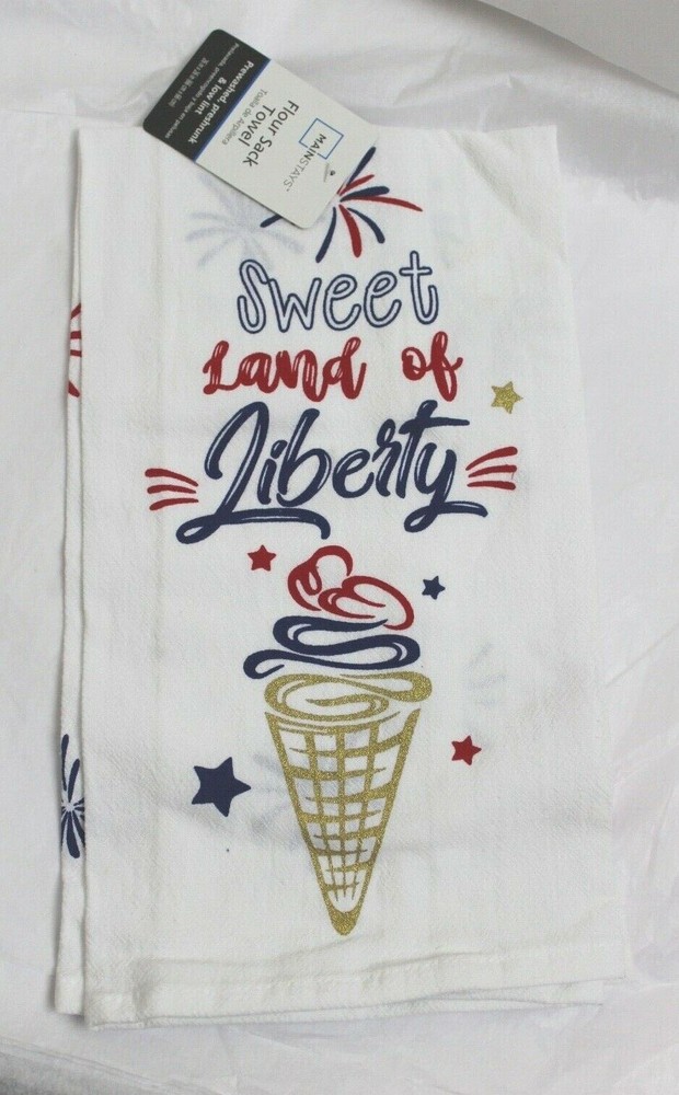 Mainstays ~ NWT Flour Sack Towel "Sweet Land of Liberty" Sz: 26" X 26" **** Machine Wash **** 100%Cotton Color may vary slightly due to the brightness & quality screen! * PLEASE READ CAREFULLY * We try our best to accurately describe all of the items in our shop, some of which are consignment. All measurements taken with item lying flat, no stretching, and are approximate. If you have a problem with an order, please message us. Please give us the chance to resolve the issue before leaving negative feedback. All payments are due within two days of purchase. We do not hold items for payment. *** As a policy, we do NOT accept returns *** If you believe a return is warranted contact us immediately (within 10 days of receiving the item) to discuss your concerns. IF a return is accepted, you MUST return the item (in it's entirety) along with the original packaging (including ALL packing materials & original box/envelope) Please make sure you want the item you are bidding on. We do not accept returns due to an item not fitting or you did not read the listing. We are happy to answer any questions you may have about the item. Check out our other items and add us to your favorites list - we add inventory daily!