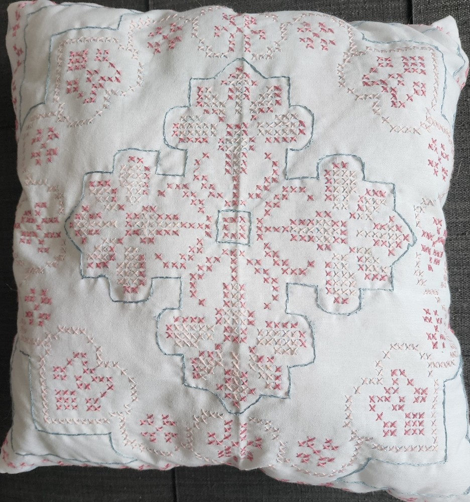 This handmade pillow features charming hand embroidery of flowers and hearts, adding decorative flair to your home. Perfect for creating a cozy and comfortable atmosphere, it's a lovely addition to bridal decor. Made in the United States, this pillow is a delightful accent for any room. this item also makes a thoughtful breverent or get well gift.