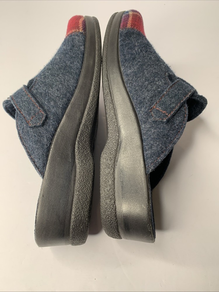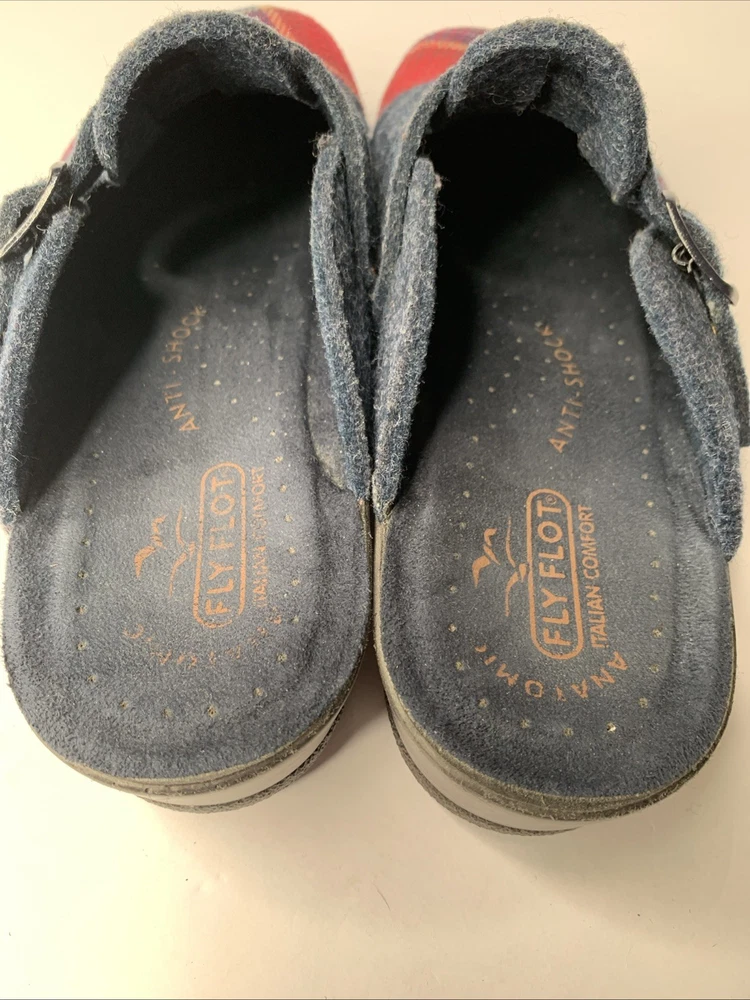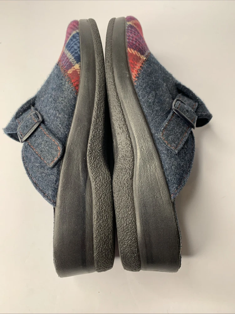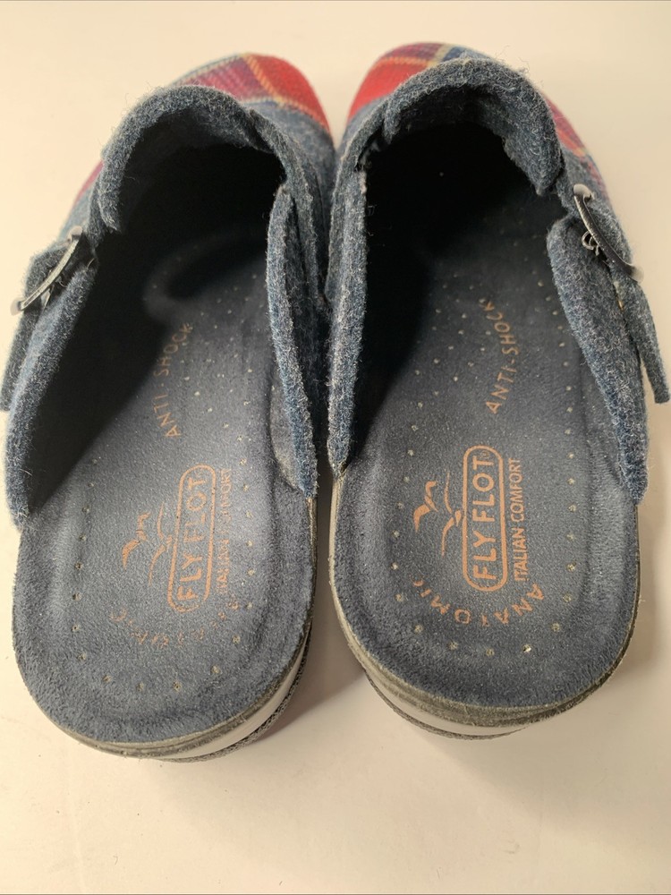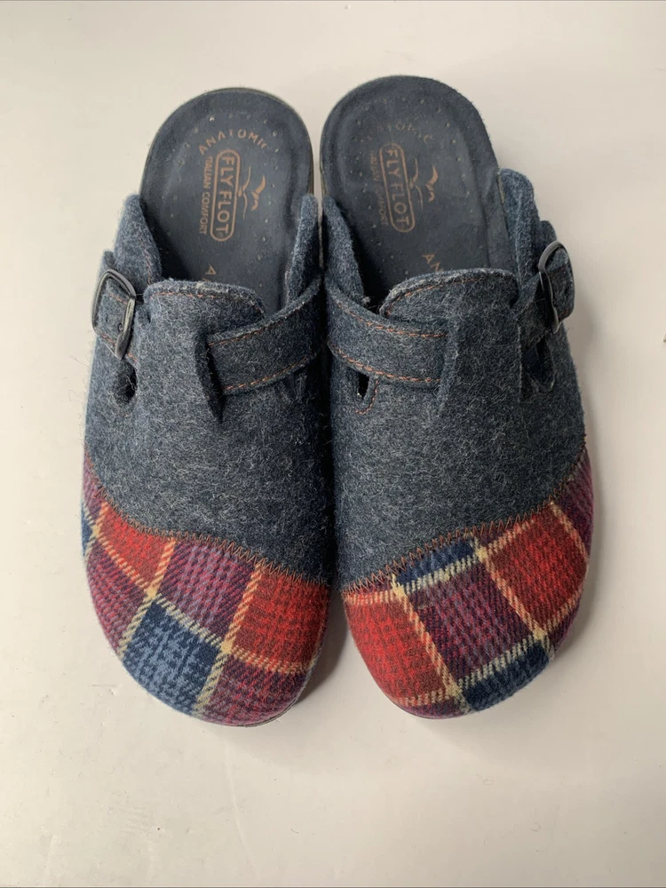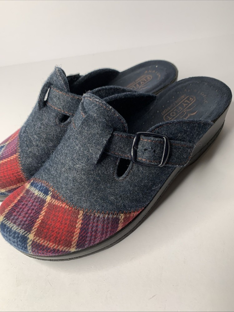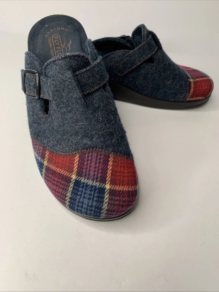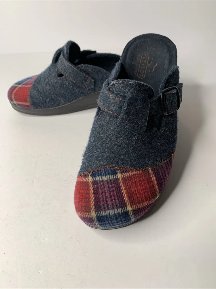 The Fly Flot Women's Slipper Slippers in solid Blue and Red Plaid are a comfortable and stylish option for women in size 38 (US 7.5). With a slip-on closure and low heel height, these slippers are perfect for casual, workwear, or travel occasions. Made with thick felt wool like fabric and a lightly cushioned insole, they offer both comfort and warmth, making them ideal for the winter, fall, and spring seasons. The rounded toe shape and lightweight design add to the overall cozy appeal of these slippers, making them a great choice for anyone looking for a cozy and casual footwear option.