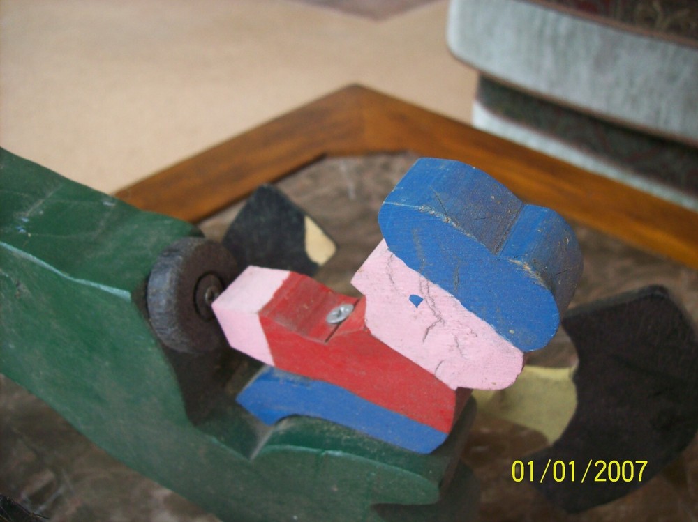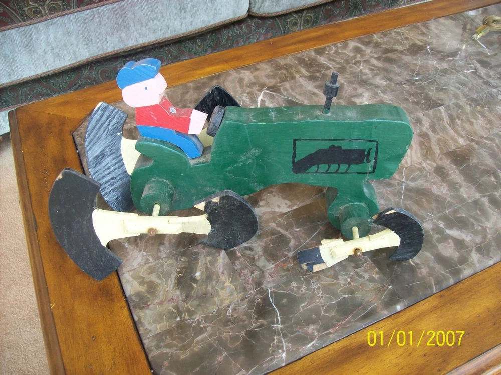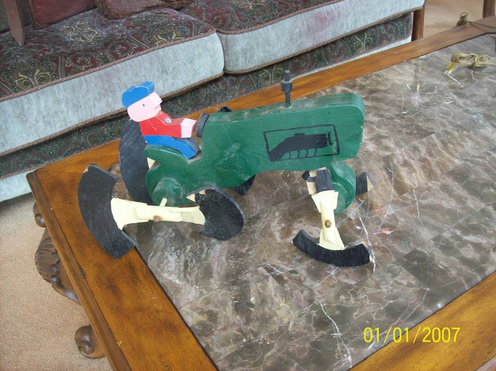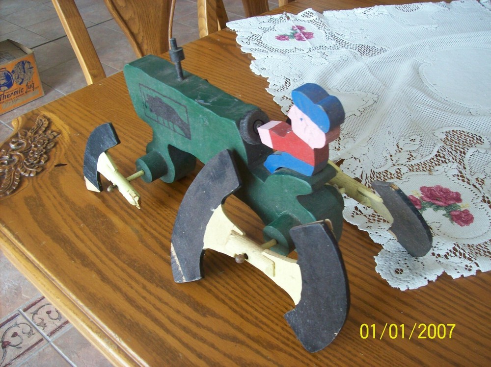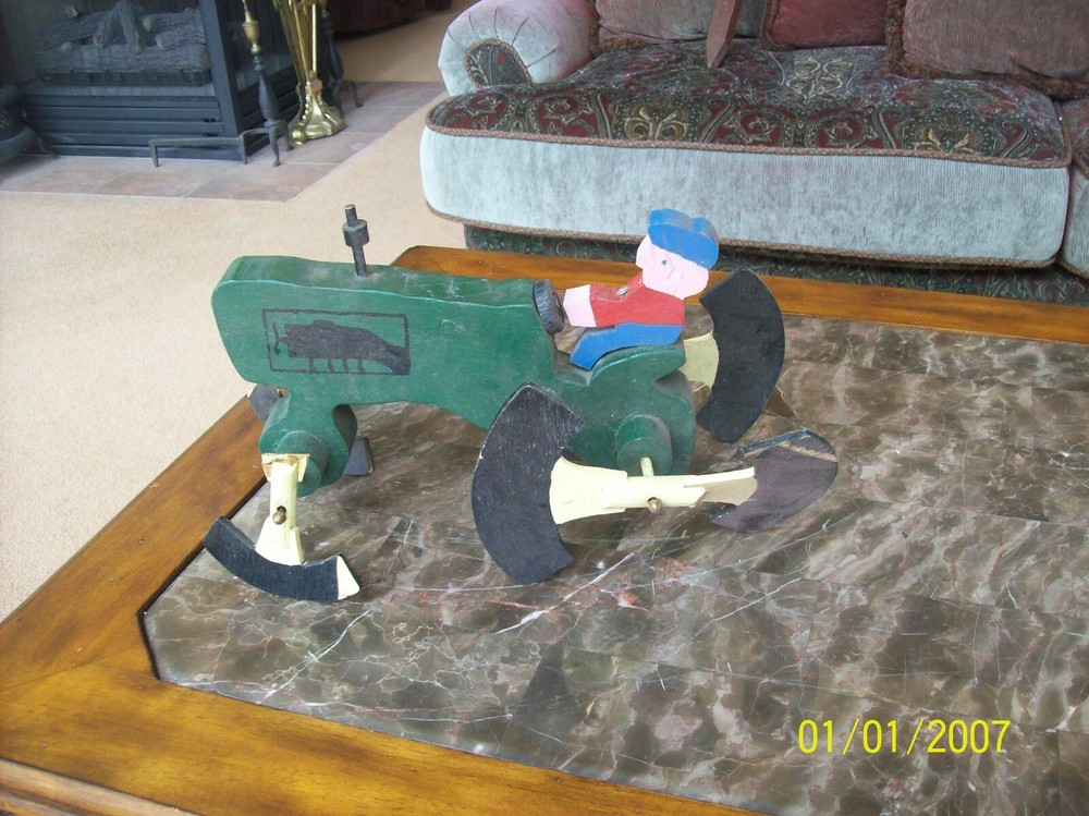 Up for your consideration is this older vintage handmade wooden folk lawn art. This is a farmer on his tractor and the wheels are the spinners...It has seen some wear over the years and needs it's front spinners repaired...The colors are great and the back spinners spin....the front spinners spin but need new paddles....this is and older whirligig.....great piece just the way it is.....measures 16" long x 10" tall x 8" wide....