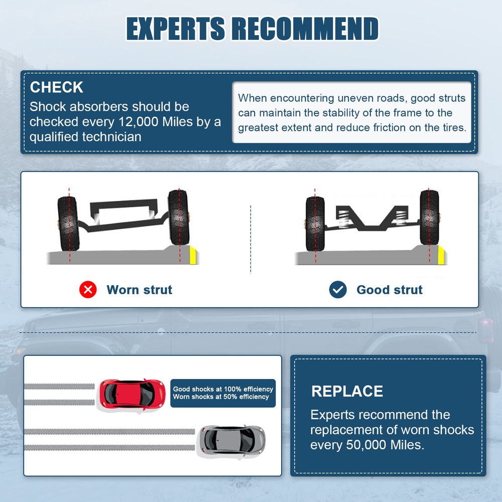 These strut assemblies are a perfect fit for my '05 Expedition—smooth ride, easy installation, and great value for the price! Noticed a big difference in handling right away, no more wobbling or noise. No leaks or issues so far, and they arrived well-packed. A must-have upgrade if your shocks are worn out—just check for oil leaks or excessive bounce to confirm it's time for a replacement. Highly recommend!