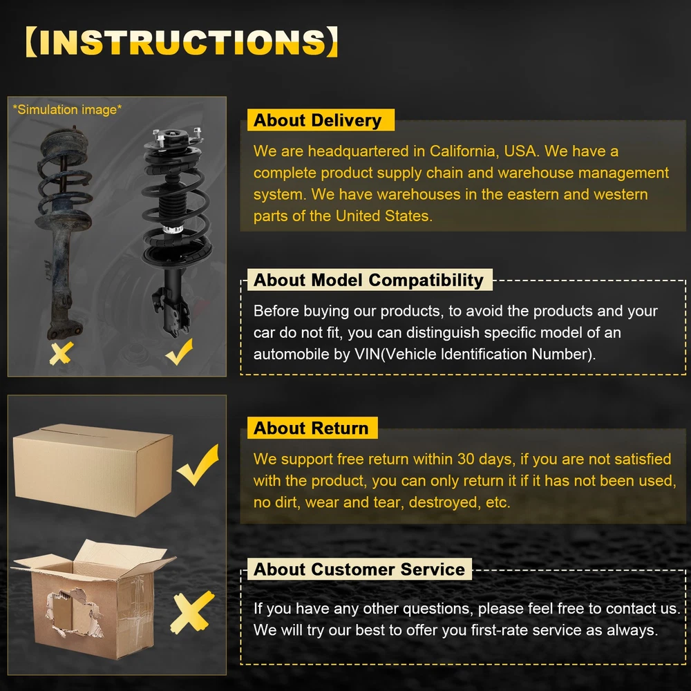 ★Fitment 2002-2003 Lexus ES300 2002-2003 Toyota Camry ★Description Packages: 2 Pcs Front Completely Struts Includes: Strut/Coil Spring/Boot/Bumper Kit/Spring Seat/Isolator Ships Within: 1 Business Day Fitment Type: Direct Replacement / Gas Charged Retrurn Policy: Free Return on damaged or defective items Shock absorbers, brakes and tyres are essential to your motoring safety. Shock absorbers keep your wheels in contact with the road. Without them your brakes and tyres simply can't do their job! For 2002-2003 Toyota Camry 2.4L Front Complete Struts Shocks W/ Coil Spring x2 ★Fitment 2002-2003 Lexus ES300 2002-2003 Toyota Camry ★Description Packages: 2 Pcs Front Completely Struts Includes: Strut/Coil Spring/Boot/Bumper Kit/Spring Seat/Isolator Ships Within: 1 Business Day Fitment Type: Direct Replacement / Gas Charged Retrurn Policy: Free Return on damaged or defective items Shock absorbers, brakes and tyres are essential to your motoring safety. Shock absorbers keep your wheels in contact with the road. Without them your brakes and tyres simply can't do their job! Stopping – At 50kmh, just one worn shock absorber can increase your stopping distance by up to 2 metres! Steering - Worn shock absorbers can cause your tyres to lose contact with the road, dramatically affecting steering. Stability – Worn shock absorbers cause excessive sway around corners, making the car a lot less stable. ★About us We are headquartered in California, USA, Our shop focuses on auto parts , Provide various parts suitable for a wide range of applications.We provide you with professional services with a professional attitude, hope to provide consumers with a better shopping experience. Fast: Our delivery speed is fast and the packaging is meticulous. After receiving the order, we will process it as soon as possible to ensure that you can receive the complete goods as quickly as possible. Flexible: We have a complete product supply chain and warehouse management system.We have warehouses in the southern, eastern and western parts of the United States. Generally speaking, we will ship the goods according to your geographic location. When it is determined that we have stock, we will ship from the closer warehouse to ensure that you can receive the goods faster. Sale warranty: We will provide customers with pre-sale and after-sale protection to solve your worries. Before buying, if you have more questions about the product, you can consult our professional customer service team. At the same time, after purchasing the goods, we provide a one-year product warranty. If the packaging is lost or damaged during transportation, if you keep the evidence, we will provide free return and exchange services within 60 days. If the courier does not arrive at the agreed time, we will make reasonable compensation to ensure consumer rights. Item Specifics Brand top-liftsupport Warranty 1 Year Manufacturer Part Number TL07092801S OE Spec or Performance OE Spec Platform Universal Product Type Complete Strut Assembly w/Springs Mounts Part Type Complete shock absorber assembly Fitment Type Direct installation Kit Parts Included Shock Aborber,Dust Cover,Spring,Bearing,Top Rubber,Nut Greasable or Sealed Sealed Placement on Vehicle Front, Left, Right Return Policy Free return or replacement within 60 days Shipping Policy Domestic orders are delivered via USPS,UPS,FedEx Payment Policy Only accept payment through PayPal preferred Custom Bundle Yes Gas Charged Shock Yes Included Hardware None Modified Item No Adjustable No Surface Finish Powder coating Interchange Part Number 171490,171491 Other Part Number 171490,171491,Struts Absorber,Coil Spring Assembly Superseded Part Number Quick Installation of Two-piece Strut Assembly With Spring Quantity 2 Pieces Single Dimension(in.) 24.8*16.54*8.27 Single Weight (Lb) 46.95 Body Length 14.375" Compressed Length 14.500" Extended Length 21.750" Travel Length 7.250" Feature ESCP Item Specifics Brand top-liftsupport Warranty 1 Year Manufacturer Part Number TL07092801S OE Spec or Performance OE Spec Platform Universal Product Type Complete Strut Assembly w/Springs Mounts Part Type Complete shock absorber assembly Fitment Type Direct installation Kit Parts Included Shock Aborber,Dust Cover,Spring,Bearing,Top Rubber,Nut Greasable or Sealed Sealed Placement on Vehicle Front, Left, Right Return Policy Free return or replacement within 60 days Shipping Policy Domestic orders are delivered via USPS,UPS,FedEx Payment Policy Only accept payment through PayPal preferred Custom Bundle Yes Gas Charged Shock Yes Included Hardware None Modified Item No Adjustable No Surface Finish Powder coating Interchange Part Number 171490,171491 Other Part Number 171490,171491,Struts Absorber,Coil Spring Assembly Superseded Part Number Quick Installation of Two-piece Strut Assembly With Spring Quantity 2 Pieces Single Dimension(in.) 24.8*16.54*8.27 Single Weight (Lb) 46.95 Body Length 14.375" Compressed Length 14.500" Extended Length 21.750" Travel Length 7.250" Feature ESCP 1. If you want to change the shipping address, please contact us by eBay messages. 2.(if you want cancel orders or change address pls contact us within 6 hours after payment,or we are not responsible for shipping a replacement.) 3.Payment must be received within 10 days as auction ended or order might be delayed. 1.We only accept PayPal. 2.Please do not use the PayPal note field to indicate us to ship to other address. The note there will NOT be read. If you want to change the shipping address, please contact us by eBay messages. 3.(if you want cancel orders or change address pls contact us within 6 hours after payment,or we are not responsible for shipping a replacement.) 4.Payment must be received within 10 days as auction ended or order might be delayed.1.We only accept PayPal. 2.Please do not use the PayPal note field to indicate us to ship to other address. The note there will NOT be read. If you want to change the shipping address, please cont