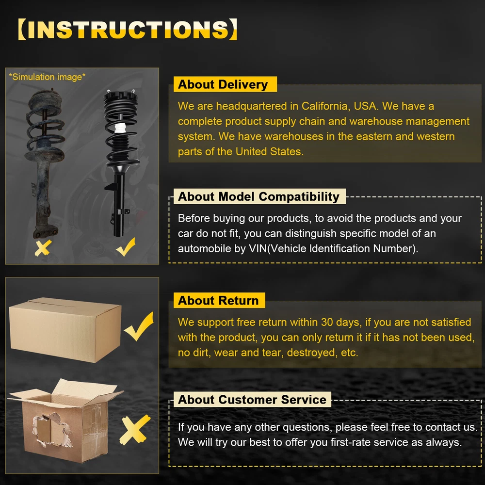 ★Fitment 2008-2010 Scion Xd ★Description Packages: 2 Pcs Front Completely Struts Includes: Strut/Coil Spring/Boot/Bumper Kit/Spring Seat/Isolator Ships Within: 1 Business Day Fitment Type: Direct Replacement / Gas Charged Retrurn Policy: Free Return on damaged or defective items Shock absorbers, brakes and tyres are essential to your motoring safety. Shock absorbers keep your wheels in contact with the road. Without them your brakes and tyres simply can't do their job! For 2008 2009 2010 Scion Xd Front Complete Struts Shocks Absorbers W/ Spring 2x ★Fitment 2008-2010 Scion Xd ★Description Packages: 2 Pcs Front Completely Struts Includes: Strut/Coil Spring/Boot/Bumper Kit/Spring Seat/Isolator Ships Within: 1 Business Day Fitment Type: Direct Replacement / Gas Charged Retrurn Policy: Free Return on damaged or defective items Shock absorbers, brakes and tyres are essential to your motoring safety. Shock absorbers keep your wheels in contact with the road. Without them your brakes and tyres simply can't do their job! Stopping – At 50kmh, just one worn shock absorber can increase your stopping distance by up to 2 metres! Steering - Worn shock absorbers can cause your tyres to lose contact with the road, dramatically affecting steering. Stability – Worn shock absorbers cause excessive sway around corners, making the car a lot less stable. ★About us We are headquartered in California, USA, Our shop focuses on auto parts , Provide various parts suitable for a wide range of applications.We provide you with professional services with a professional attitude, hope to provide consumers with a better shopping experience. Fast: Our delivery speed is fast and the packaging is meticulous. After receiving the order, we will process it as soon as possible to ensure that you can receive the complete goods as quickly as possible. Flexible: We have a complete product supply chain and warehouse management system.We have warehouses in the southern, eastern and western parts of the United States. Generally speaking, we will ship the goods according to your geographic location. When it is determined that we have stock, we will ship from the closer warehouse to ensure that you can receive the goods faster. Sale warranty: We will provide customers with pre-sale and after-sale protection to solve your worries. Before buying, if you have more questions about the product, you can consult our professional customer service team. At the same time, after purchasing the goods, we provide a one-year product warranty. If the packaging is lost or damaged during transportation, if you keep the evidence, we will provide free return and exchange services within 60 days. If the courier does not arrive at the agreed time, we will make reasonable compensation to ensure consumer rights. Item Specifics Brand top-liftsupport Warranty 1 Year Manufacturer Part Number TL11936101S OE Spec or Performance OE Spec Platform Universal Product Type Complete Strut Assembly w/Springs Mounts Part Type Complete shock absorber assembly Fitment Type Direct installation Kit Parts Included Shock Aborber,Dust Cover,Spring,Bearing,Top Rubber,Nut Greasable or Sealed Sealed Placement on Vehicle Front, Left, Right Return Policy Free return or replacement within 60 days Shipping Policy Domestic orders are delivered via USPS,UPS,FedEx Payment Policy Only accept payment through PayPal preferred Custom Bundle Yes Gas Charged Shock Yes Included Hardware None Modified Item No Adjustable No Surface Finish Powder coating Interchange Part Number 172442,172441 Other Part Number 172442,172441,Struts Absorber,Coil Spring Assembly Superseded Part Number Quick Installation of Two-piece Strut Assembly With Spring Quantity 2 Pieces Body Length 14.920" Compressed Length 15.420" Extended Length 21.540" Travel Length 6.120" Extended Length 21.540" Travel Length 6.120" Item Specifics Brand top-liftsupport Warranty 1 Year Manufacturer Part Number TL11936101S OE Spec or Performance OE Spec Platform Universal Product Type Complete Strut Assembly w/Springs Mounts Part Type Complete shock absorber assembly Fitment Type Direct installation Kit Parts Included Shock Aborber,Dust Cover,Spring,Bearing,Top Rubber,Nut Greasable or Sealed Sealed Placement on Vehicle Front, Left, Right Return Policy Free return or replacement within 60 days Shipping Policy Domestic orders are delivered via USPS,UPS,FedEx Payment Policy Only accept payment through PayPal preferred Custom Bundle Yes Gas Charged Shock Yes Included Hardware None Modified Item No Adjustable No Surface Finish Powder coating Interchange Part Number 172442,172441 Other Part Number 172442,172441,Struts Absorber,Coil Spring Assembly Superseded Part Number Quick Installation of Two-piece Strut Assembly With Spring Quantity 2 Pieces Body Length 14.920" Compressed Length 15.420" Extended Length 21.540" Travel Length 6.120" Extended Length 21.540" Travel Length 6.120" WARNING: Cancer and Reproductive Harm - www.P65Warnings.ca.gov. 1.We only accept PayPal. 2.Please do not use the PayPal note field to indicate us to ship to other address. The note there will NOT be read. If you want to change the shipping address, please contact us by eBay messages. 3.(if you want cancel orders or change address pls contact us within 6 hours after payment,or we are not responsible for shipping a replacement.) 4.Payment must be received within 10 days as auction ended or order might be delayed. 1.We only accept PayPal. 2.Please do not use the PayPal note field to indicate us to ship to other address. The note there will NOT be read. If you want to change the shipping address, please contact us by eBay messages. 3.(if you want cancel orders or change address pls contact us within 6 hours after payment,or we are not responsible for shipping a replacement.) 4.Payment must be received within 10 days as auction ended or order might be delayed.1.We only accept PayPal. 2.Please do not use the PayPal note field to indicate us to ship to other address.