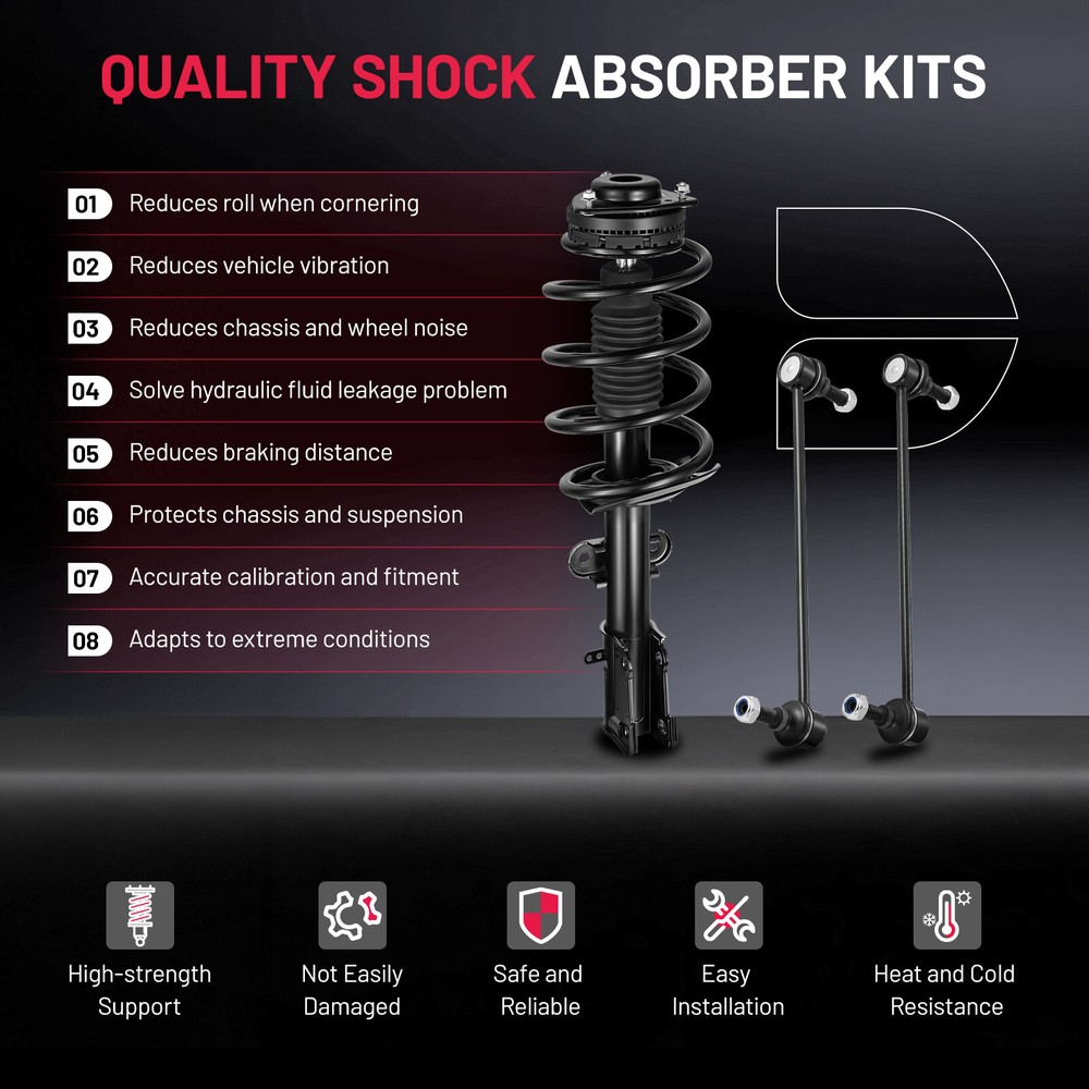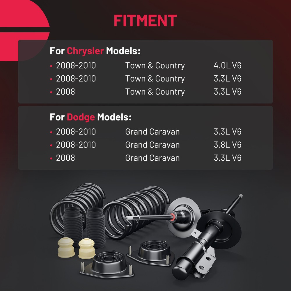 Front Struts w/Spring Sway Bars for Dodge Grand Caravan Town & Country 2008-2020 4pc Front Struts & Coil Spring Assembly + Sway Bar Links Kit Fits Driver and Passenger Sides Kit Includes: 2x Front Strut & Coil Spring Assembly - Driver & Passenger Side - 171128 2x Front Stabilizer / Sway Bar End Link - Driver & Passenger Side - K7258 Pre-assembled and ready to install! No special tools required! Each Assembly includes: Strut Coil Spring Boot Bumper Kit Spring Seat Isolator **DOES NOT FIT MODELS WITH NIVOMAT REAR SUSPENSION** FITS: MAKE MODEL YEAR RANGE SPECIFIC DETAILS CHRYSLER TOWN & COUNTRY 2008 - 2016 Not for Vehicles with Nivomat Rear Suspension DODGE GRAND CARAVAN 2008 - 2020 Not for Vehicles with Nivomat Rear Suspension Fitment: Fits for 2008-2020 Dodge Grand Caravan (Not fit for 2011-2016 RT & 2017-2020 GT) Fits for 2008-2016 Chrysler Town & Country (Not fit for 2013-2016 S) Replace for Number: 171128 K7258 Package Include: 2x Front Stabilizer / Sway Bar End Links 2x Front Strut & Coil Spring Shock Assemblies Placement on Vehicle: Front Left & Right Upper Strut Mount Superior premium-style bearings. SAE-grade nuts and bolts. Superior rubber-to-steel bonding. Oil Seal Piston rod imported oil combined with advanced manufacturing technology, more stable, more durable Coil Spring Manufactured with high-quality steel, each coil spring is precisely calibrated to support the vehicle's weight and help ensure correct ride height Piston Rod Adopting advanced TRIP imported material and special process to ensure both wear resistant and metal fatigue resistance of piston rod Indication Of Worn or Damaged Shocks Need To Be Replaced Functions After Installation ILONPA Shock Assembly Payment Delivery details Terms of sales About us Contact us Payment 1.We only accept PayPal. PayPal is the only online payment method we accept. Please make sure you have a valid/confirmed PayPal account prior bidding. 2.All Paypal Payments must be Confirmed. Payment must be made within 48hrs of the auction end time. Non-Paying bidders will be reported. 3.When you get your package,maybe you will pay some charges, it's taxes for local customs,not pay to us, and the fees are depends on the customs, all buyer are same. Delivery details 1.Items will be shipped within 2 business days after payment is received. 2.We ship to your eBay address. Please make sure your eBay address is correct. Buyer takes responsibility if eBay address is wrong. 3.Import duties, taxes and charges are not included in the item price or shipping charges. Please check with your country customs office for these additional charges. 4.We shipping using UPS or USPS from our nearest warehouse to you. Tracking numbers will be emailed upon shipment. Terms of sales 1.Please feel free to email us if you have any question. 2.We appreciate you contact us via eBay message when you are not satisfied rather than open case or leave negative feedback directly. We'll try our best to solve the issue. 3.Refund will be issued once we receive your returned items. Buyer is responsible for all return shipping charges. 4.Please contact us for return process before you return the item. 5.All items for exchange or refund must be returned in "as new" condition. About us We are the responsible seller ,always provide high-quality products and best service .If you have any questions, please contact us, and will try our best to help you. Please contact us by eBay Message, and we will reply you within 24 hours. Thank you very much! Contact us We are the professional auto parts manufacturer , and provide line lock, AN hose end fittings , fuel line , fuel filter , fuel regulator , exhaust cutout , exhaust tips , exhaust muffler and so on .The quality of the product to be secured. If you have any questions or any needs , please contact us , and will try our best to help you.