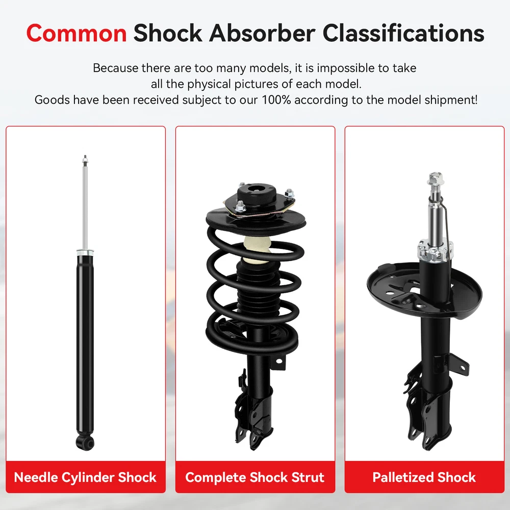 Fittment: Ford Fiesta 2010-2013 Description: Complete struts with spring & mounts assembly, including Strut, Coil spring (when applicable), Strut mount, Boot, Bumper Kit, Spring seat and Isolator. Manufactured from top quality components Direct fit , no special tools requir. Fast Shipping. Warehouses in the East and West. Professional for you to answer the very common problems of shock absorbers; Welcome to collect money after sale consultation!? The hazard of a broken complete strut/shock absorber: For 2010 2011 2012 2013 Ford Fiesta Front Rear Complete Gas Shocks Struts Set Fittment: Ford Fiesta 2010-2013 Description: Complete struts with spring & mounts assembly, including Strut, Coil spring (when applicable), Strut mount, Boot, Bumper Kit, Spring seat and Isolator. Manufactured from top quality components Direct fit , no special tools requir. Fast Shipping . Warehouses in the East and West. Professional for you to answer the very common problems of shock absorbers; Welcome to collect money after sale consultation! ? The hazard of a broken complete strut/shock absorber: When driving, if the shock absorber assembly of the car wears out, the car may vibrate up and down , bump back and forth , shake left and right , and the front of the car will sway. As a result, the car will deviate to the outside of the curve when the car is making a sharp turn. Trend: When the turning radius of the car is large, the sense of direction is inaccurate, and the car has a tendency to sway; when the car passes on a bad road, the steering wheel can clearly perceive the front suspension vibration significantly increased; when the road is convex, the driver and passengers can feel dull The impact noise; the beating of the wheels when accelerating, resulting in slow acceleration and other problems. How to check if the shock absorber is damaged: Oil leakage : Check the shock absorber through the wheel arch with a flashlight. When oil leakage is found outside the shock absorber, it indicates that the shock absorber has been damaged. Abnormal noise : If the shock absorber makes an abnormal noise when the vehicle is driving on a bumpy road section, it is most likely that the shock absorber has been damaged. Uneven tire wear : When the shock absorber is broken, the wheel will vibrate unevenly during driving. This will cause the wheels to tilt, which will cause serious wear on the part of the tire that touches the ground, while the untouched tires will not be affected, resulting in uneven wear over time. Press the bumper firmly and then release it. If the car jumps 2 or 3 times, it means that the shock absorber is working well. If you keep nodding your head up and down and bow your waist, it will be broken if it looks very elastic. How to Change: Installation Steps: First step 1. Remove the tire, and place the removed tire on the ground steadily, with the outside side facing up, and put the tire screw on the tool c art 2. Gradually remove the connecting rod screws, brake hose screws, and brake ABS cable. After removing the screws, arrange them and place them on the tool cart (Note: Be careful not to damage the oil pipe and ABS cable) 3. Remove the half shaft nut and remove the automatic system. (Note: Fix the calipers reasonably and do not damage the tubing) 4. Remove the direction lever (note: use a special tool to remove the ball head 5. Remove the vehicle height sensor (note: remove carefully, do not damage) 6. Remove the ball head of the lower control arm 7. Remove the upper connecting bolts, and take out the shock absorber assembly and steering knuckle assembly together. (Note: Two people are required to cooperate to avoid damage to related parts after replacement) Second step 1. The shock absorber assembly of the original car has been disassembled, and the new shock absorber assembly has been replaced. 2. Take out the new shock absorber assembly and compare it with the old one before installing it. 3. Install the new shock absorber assembly on the steering knuckle assembly 4. Assemble the shock absorber assembly and steering knuckle assembly back to the vehicle together. Third Step 1. Restore the ABS cable, tubing, and tie rod to their original positions. 2. Restore all the automatic systems, and carefully check the oil pipes and other lines for interference. 3. Assemble the tire to the car (Note: carefully tighten the tire bolts) Frequently Asked Questions: What shocks and struts do? They keep the tires from bouncing which causes loss of road contact and they also keep the vehicle body weight from shifting and rolling which causes a loss of vehicle control and handling. You could say then, that their main job is to resist both tire and vehicle body motion. When shocks and struts are working well, the vehicle maintains traction on the road and has the optimum stability in every driving condition: stopping, turning, swerving, over bumps and potholes. How do they do that? A shock or a strut operate the same but mount differently. Each of the four tires has either a shock or strut connected to that corner’s suspension and vehicle body or frame. They are hydraulic cylinders that provide motion damping by restricting fluid flow through a series of internal valves. As the wheel and body moves up and down, the shock valving slows and stabilizes the movements. How many miles do shocks and struts last? The life of shocks and struts depend on the road conditions the vehicle drives on, the weight of the vehicle and environmental conditions. Some vehicles; such as SUVs and Vans, are very heavy in the front and can wear out suspension components in 50,000 t0 75,000 miles . Vehicles driven in northern climates will wear out quickly due to road salt and potholes created from icy conditions. Delivery vehicles carrying heavy loads will wear out springs and suspension components quickly. So, mileage is not always the best way to estimate how long your shocks and struts will last. Consider the type of vehicle, your normal road
