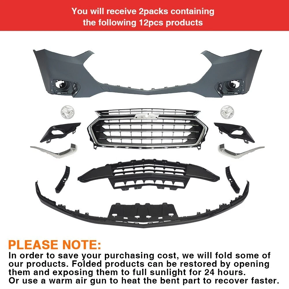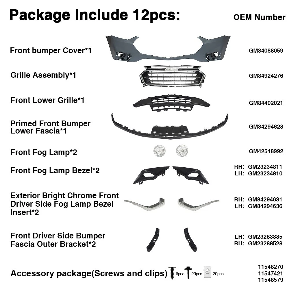 Specifications · Color: As pictures show · Placement on Vehicle: Front Type · Front Bumper Cover Grille Assembly Kit Complete Condition · 100% Brand New Fitment · Fit For Chevy Traverse 2018 2019 2020 2021 Package Content 12 Pcs as 1 Set Complete Front Bumper Grille Cover (As picture shows) Front Bumper Cover OEM CODE:GM84088059 Grille Assembly*1 OEM CODE:GM84924276 Front Lower Grille*1 OEM CODE:GM84402021 Primed Front Bumper Lower Fascia*1 OEM CODE:GM84294628 Front Fog Lamp*2 OEM CODE:GM42548992 Front Fog Lamp Harness*2 Front Passenger Side Fog Lamp Opening Cover*2 OEM CODE:RH:GM23234923 Front Fog Lamp Bezel*2 OEM CODE: LH:GM23234810 RH:GM23234811 Exterior Bright Chrome Front Driver Side Fog Lamp Bezel Insert*2 OEM CODE: LH:GM84294636 RH:GM84294631 Front Driver Side Bumper Fascia Outer Bracket*2 OEM CODE: LH:GM23283885 RH:GM23288528 Accessory Package(Screws and Clips) Buyer can paint the bumper cover different color to match the car Feature High Durability · Made of ABS material with high durability to extend its long service life and a better shopping experience for you. Attractive Decoration The design of the front bumper cover grille assembly complete is in harmony with your vehicle's exterior and enhances its overall aesthetics. Perfect Fit · Manufactured according to originals for a perfect match with your car. Simple Installation · Easy installation with direct replacement, other modifications are not required. Stable Performance · The front bumper cover grille assembly complete with stable performance provides you a better shopping experience. Note · If you have any questions or concerns, please contact us via eBay messages before leaving negative feedback♥