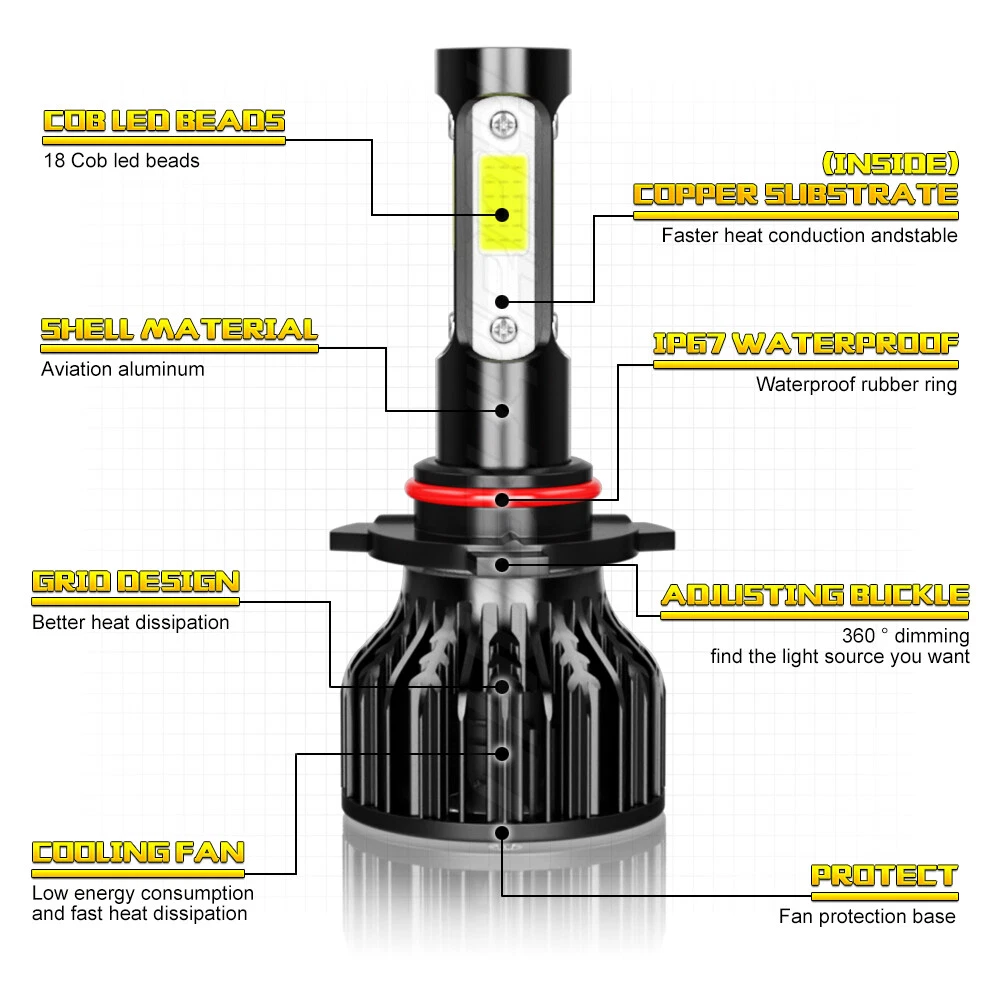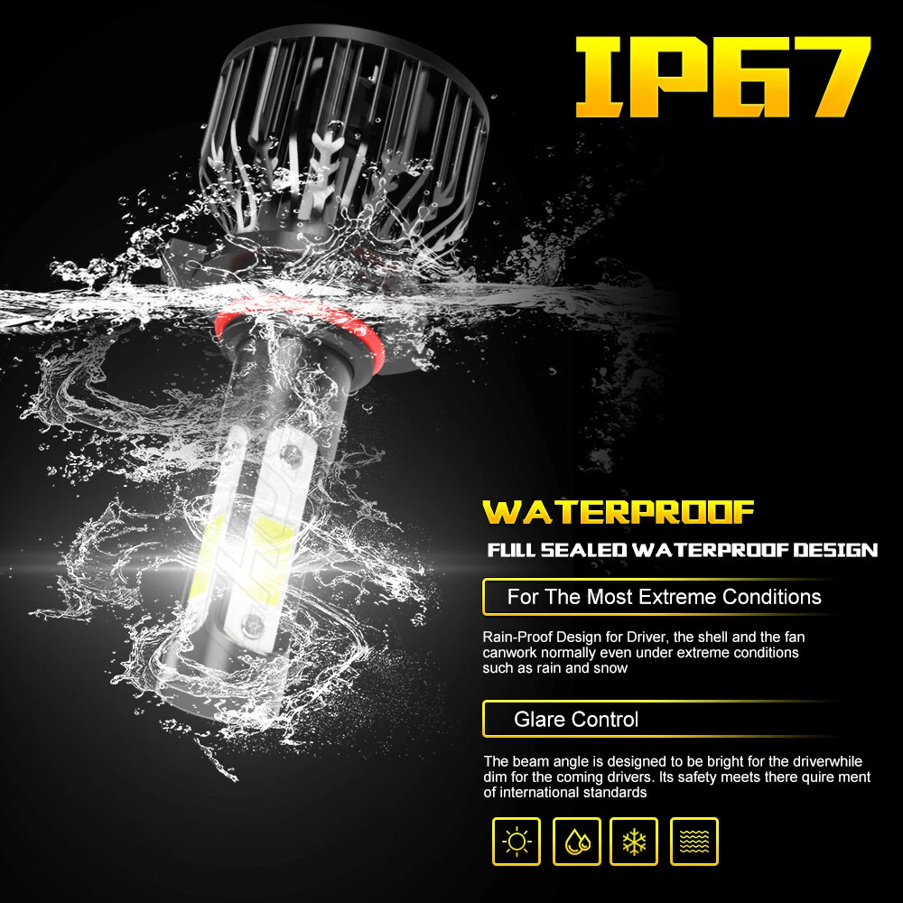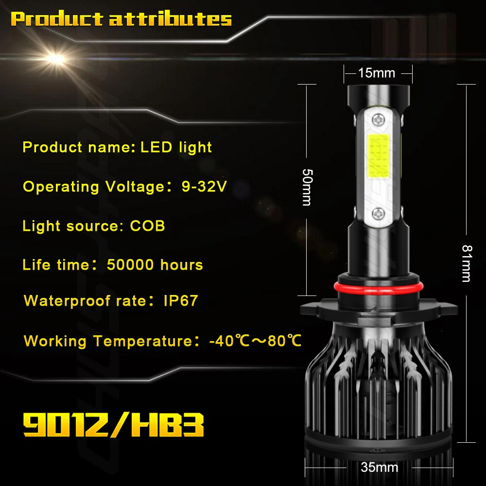 Note: ● Compatible List can not show up all Car model. Please confirm whether the item matches your car before you purchase. ● You also can send us your car informations (Maker, Model, Year), so we can find the right bulb size for you. There may be two or more bulb models for the same car, please check your bulb model before placing your order. Information: If you are unsure about the suitability of an item, please remember to send us a message with the make, model, year and other information about your car that will help to check the suitability of the item. For example Fits 2004 Ford F150, high beam/low beam Fits 2015 RAM 1500 with projector model, high beams For 2019 Ford F150 , XL 4-Door 2.7L Wagon Pickup Truck Specifications: 1. Light Type : 9012(Headlight) + H11 H8 H9 (Fog light ) 2. Input Power : 160W/set (80W/bulb) 3. CHIPS Type : 9012(Headlight) :CSP LED Chips H11 (Fog light ):COB LED Chips 4. Luminous Flux : approx..16000lm/set (8000lm/bulb) 5. Operating Voltage : DC 9V-32V (fits 12V/24V vehicle) 6. Color Temperature : 9012(Headlight) :Cool White 6000K H11 (Fog light ):Cool White 6000K 7. IP Rate : IP68 8. Operating Temperature : (-40C) to (+176C) 9. Material : Aviation 6063 Aluminum Profile 10. Life-Span : 50,000Hrs+ 11. Installation : Plug and Play 12. Beam Angle : 360° 13. Warranty: 5 Years Warranty Package Included 2pcs 9012 Headlight Bulbs 2pcs H11 Fog Light Bulbs Note: The box is randomly shipped *WORKLING GREATUNDER ALL WEATHER Foggy、Rainy、Snowy、Haze Weather is no longer a reason to restrict travel *Smaller,More Mini Adapt to 98% of vehicles without worrying about installation problems Compatible with your vehicle better,plug and play, no modification required