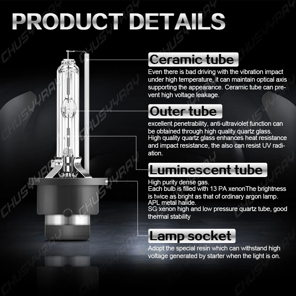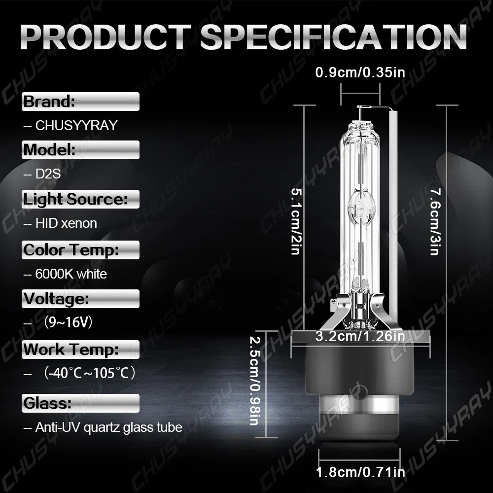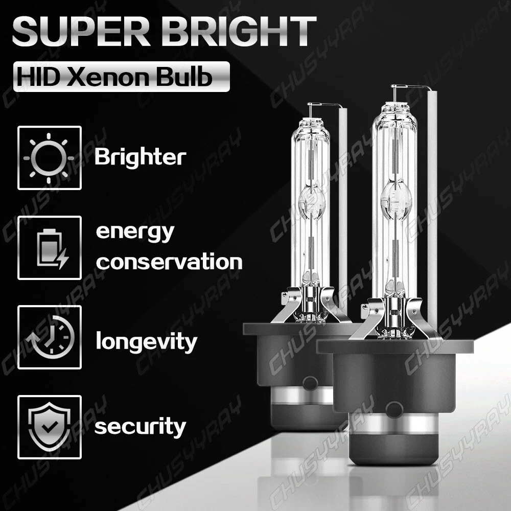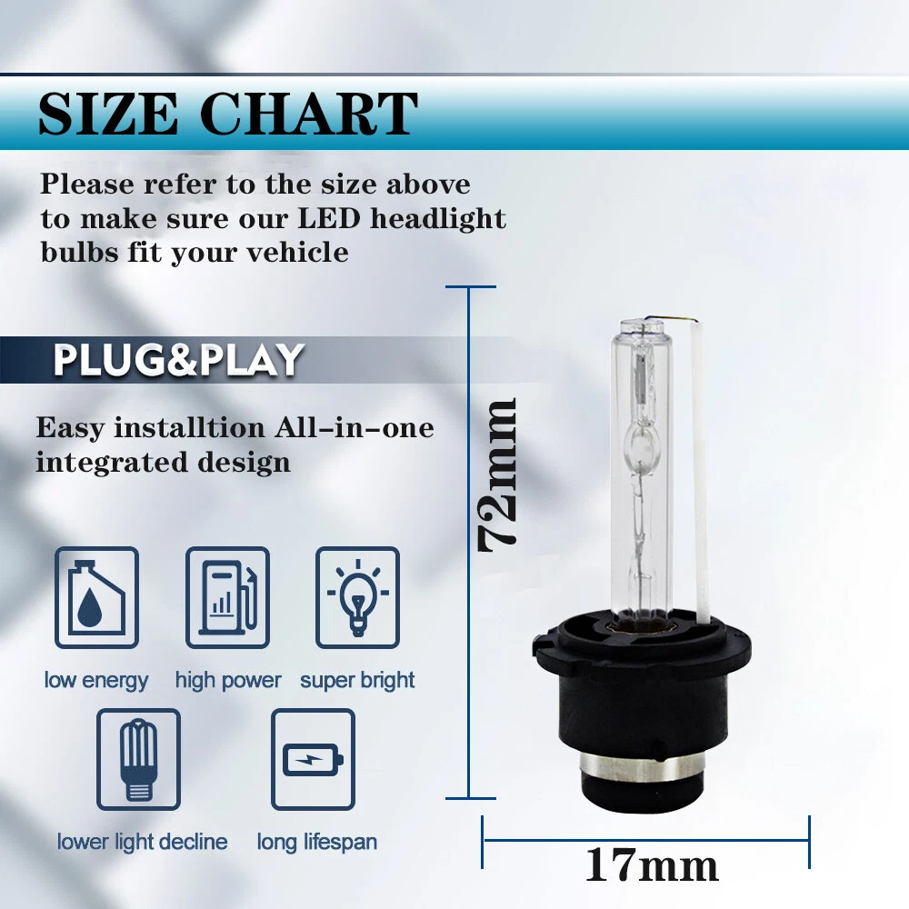 Features: These upgraded bulbs will give your factory HID (High Intensity Discharge) System a nicer color output compared the standard factory HID bulbs. They are 300% brighter than halogen lamps. High brightness and low power consumption You can see things more clearly in bad weather and at night. Easy to install.These bulbs are a direct replacement and will fit perfectly into your factory headlight and will require no additional modifications. Suitable for motorbikes and cars. Specification: Bulb Size : D2S/D2R/D2C Type:HID Conversion Kit Color temperture:6000K White Power Consumption: 35 Watt / bulb, 70 Watt / pair bulbs. Voltage: 12V. Lifespan: 5,000+hrs. Waterproof Rating : IP67 Waterproof Package Included: A pair of D2S 6000K HID Xenon Bulbs NOTICE: If you have any questions when purchasing,please contact us first,we will help you with it.We will reply you within 24 hours in working days.I'm a new seller, thanks a lot for your trust and convince! I will serve you with all my heart . On Sep 24, 2023 at 20:47:24 PDT, seller added the following information: