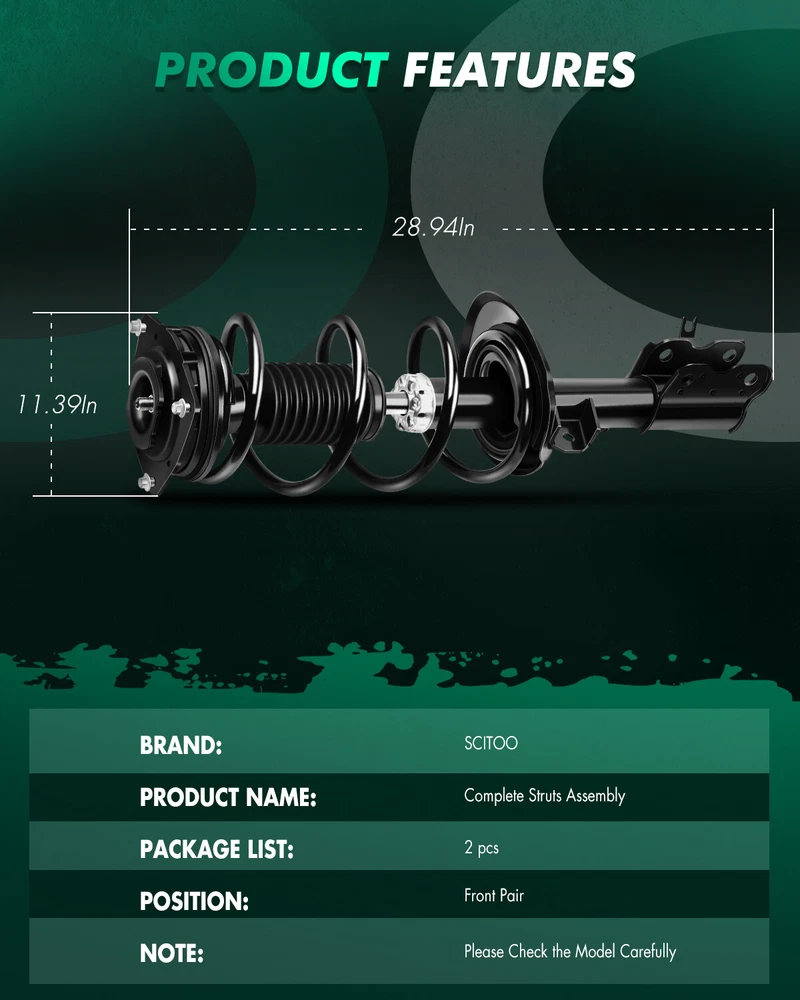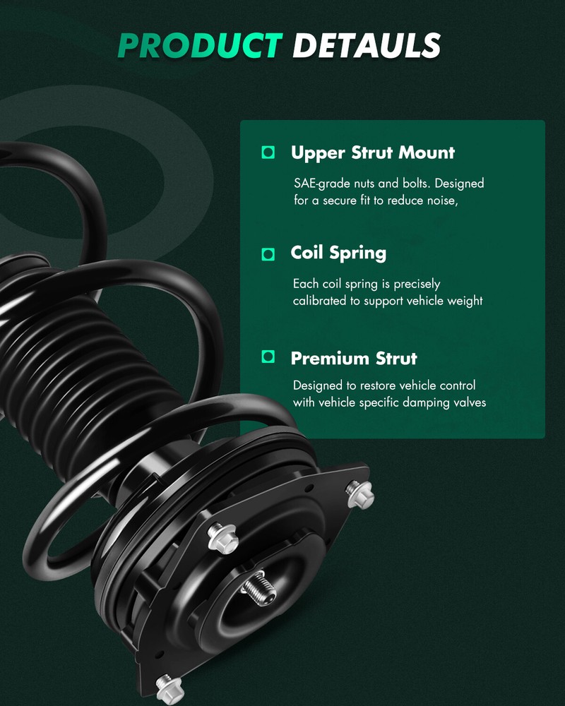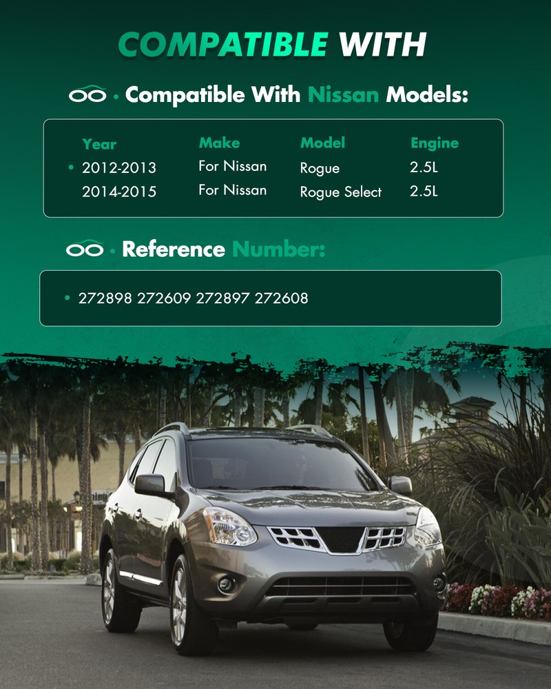 * ITEM FEATURES: 1. Fits Vehicles of the Following Years and Make : 2013 Nissan Rogue All Wheel Drive Front Driver & Passenger Side Strut & Spring Assembly Set 2012 Nissan Rogue All Wheel Drive (Built After 1/12 Production Date) Front Driver & Passenger Side Strut & Spring Assembly Set 2014-15 Nissan Rogue Select All Wheel Drive Front Driver & Passenger Side Strut & Spring Assembly Set 2. Guaranteed Exact Fit for easy installation 3. 100% BRAND NEW and tested to meet or exceed OEM specifications For Nissan Rogue Select 2014-2015 Front Pair Shocks Struts & Coil Spring Set * ITEM FEATURES: 1. Fits Vehicles of the Following Years and Make : 2013 Nissan Rogue All Wheel Drive Front Driver & Passenger Side Strut & Spring Assembly Set 2012 Nissan Rogue All Wheel Drive (Built After 1/12 Production Date) Front Driver & Passenger Side Strut & Spring Assembly Set 2014-15 Nissan Rogue Select All Wheel Drive Front Driver & Passenger Side Strut & Spring Assembly Set 2. Guaranteed Exact Fit for easy installation 3. 100% BRAND NEW and tested to meet or exceed OEM specifications 4. Premium ISO/TS 16949 quality - guaranteed highest quality available 5. Engineered for superior durability, backed by industry leading warranty 6. These are brand new, not used or junkyard parts. 7. Each complete assembly is built to meet or exceed exact OEM specifications. 8. High corrosion resistance and long service life. Steel rod is mirco-polished with double chrome plate. 9. Newer Valving technology operates in stages based on the velocity of the car. 10. Use Teflon bonded piston seal to keep friction down and temperature cooler so that valving stays firmer. 11. All-around welding on the spring seat. 12. Includes all of the following (where applicable): strut/shock, coil spring, strut/shock mount, boot, bumper kit, spring seat and isolator. These are guaranteed exact fit and don't require the use of a dangerous spring compressor to swap springs, so they are very easy to install! The struts/shocks are nitrogen gas charged and tuned for each specific vehicle application. They will greatly improve the ride, handling, and safety of your vehicle! * PRODUCT DESCRIPTION : * HOW TO INSTALL : Step 1: Before you lift the vehicle, loosen lug nuts one full turn. Step 2: Jack up vehicle and use jack stands for safety & remove the tire from the rotor. Step 3: (Wheel alignment is necessary after strut replacement.) Marking the position of all the bolts will help keep the alignment close to original and save time aligning. Use a colored pencil to mark the old strut on the bolt. Step 4: Use penetrating oil (such as WD40) to coat any rusted fasteners, let soak for approximately 1 hour. Step 5: (Optional) While waiting for oil to soak, take this time to inspect all other components that may need replacement (brake pads, rotors, brake hoses, ball joints, CV boots, tie rod ends, bushings, sway bars, etc). Step 6: Remove any brake line or wire attachments from the strut body. Do not disconnect brake lines (if possible)! Opening brake lines will require bleeding of the brake system. Use extreme caution when removing brake lines from your struts, as any damage to your brake line can result in expensive and time consuming repairs. Step 7: Remove sway bar attached to the strut assembly or control arm. Step 8: Remove the tie rod (only if it attached to the body of the strut, if not leave it attached to the steering knuckle). Step 9: Remove the strut to knuckle bolts at the bottom of the strut. On some vehicles, the brake caliper and rotor may need to be removed to gain access. Step 10: Remove the upper mounting plate bolts located in the engine or trunk compartment. Do not remove the center retaining nut! It is not safe to unload the spring from the assembly in this position. Step 11: Carefully remove the old strut assembly from the vehicle. Be very cautious not to let the strut "drop" down on your brake line, rotor or drum. Step 12: Install the new Complete Strut Assembly in the reverse order as above (steps 11-6). Using an anti-seize compound on all fasteners is suggested. Step 13: Carefully double check your work and make sure everything is tightened to manufacturers torque specifications. Step 14: Replace the tire the rotor and tighten to manufacturers torque specifications. Step 15: Slowly lower the vehicle down after removing the jack stands. Pay very close attention to any odd sounds when the vehicle is lowered onto the new Complete Strut Assemblies. Step 16: It is very important that you immediately "road test" your vehicle right away to ensure that installation was done properly. Listen and feel for common signs of incorrect installation while driving slowly over speed bumps, rough road or potholes. * INSTALLATION PRECAUTIONS : 1. When the original car shock absorber is removed, the corresponding positions of the top rubber and spring should be marked first. When replacing the shock absorber, ensure that the top rubber and the original mark points of the spring are aligned. Failure to follow this operation may cause abnormal noise in the suspension system ! 2. Installing the top rubber should use special tools to manually install, remember not to use any tool to clamp the shock absorber piston rod (bright rod part), so as not to scratch the shock absorber piston rod, causing oil leakage . 3. Do not use pneumatic or electric wrenches for the top glue installation to avoid slippage or damage to the shock absorber piston rod bolts . 4. Please carefully check the model compatibility list provided by our shop to avoid buying mistakes. For Nissan Rogue Select 2014-2015 Front Pair Shocks Struts & Coil Spring Set * ITEM FEATURES: 1. Fits Vehicles of the Following Years and Make : 2013 Nissan Rogue All Wheel Drive Front Driver & Passenger Side Strut & Spring Assembly Set 2012 Nissan Rogue All Wheel Drive (Built After 1/12 Production Date) Front Driver & Passenger Side Strut & Spring Assembly Set 2014-15 Nissan Rogue Select All Wheel Drive Front Dri