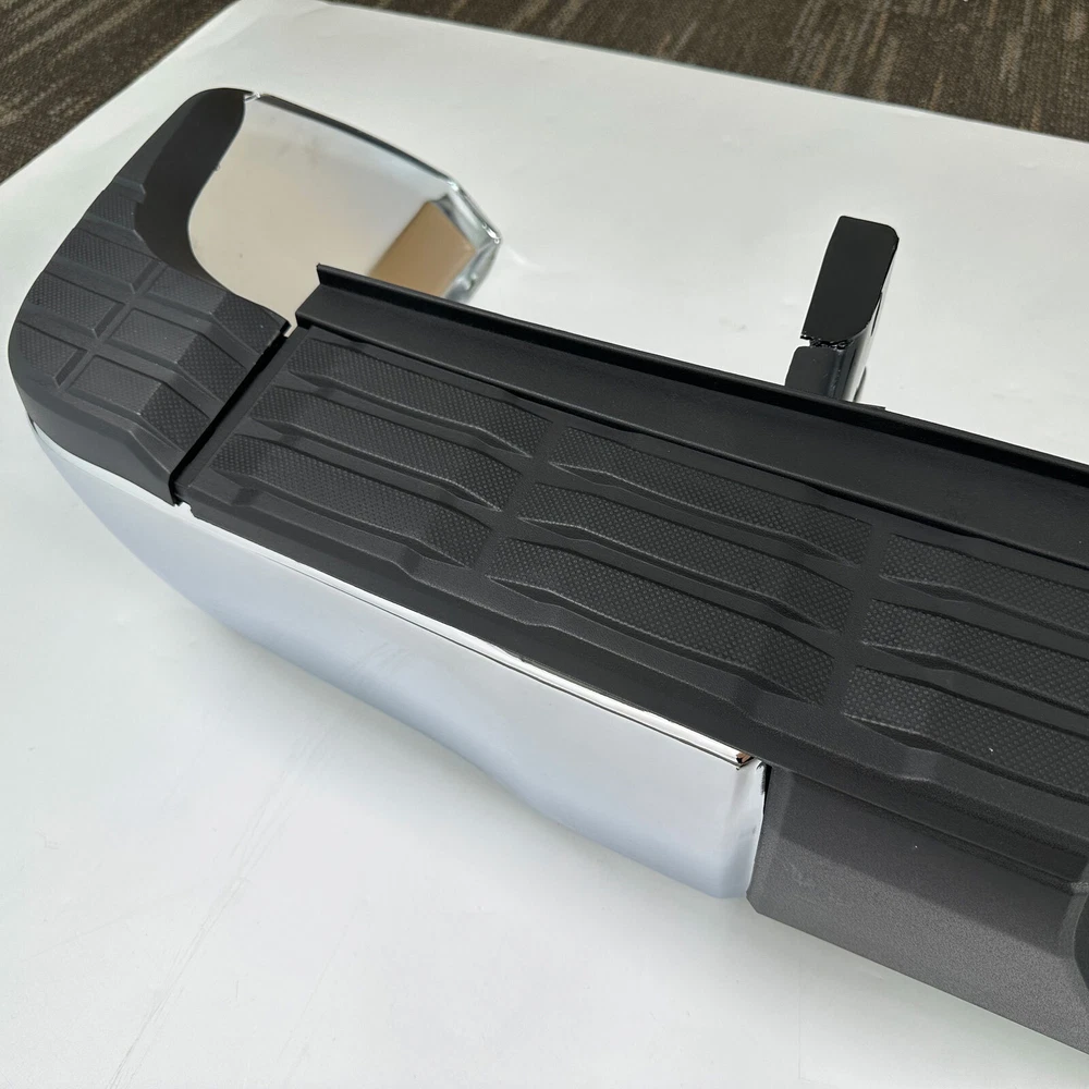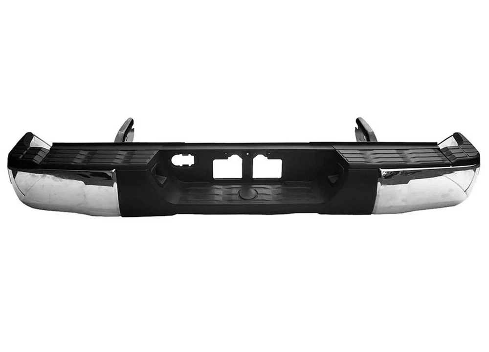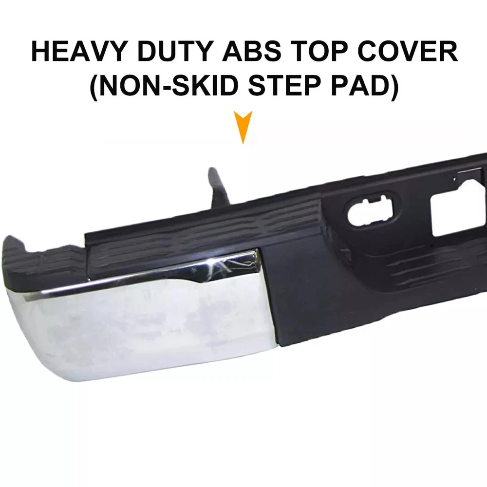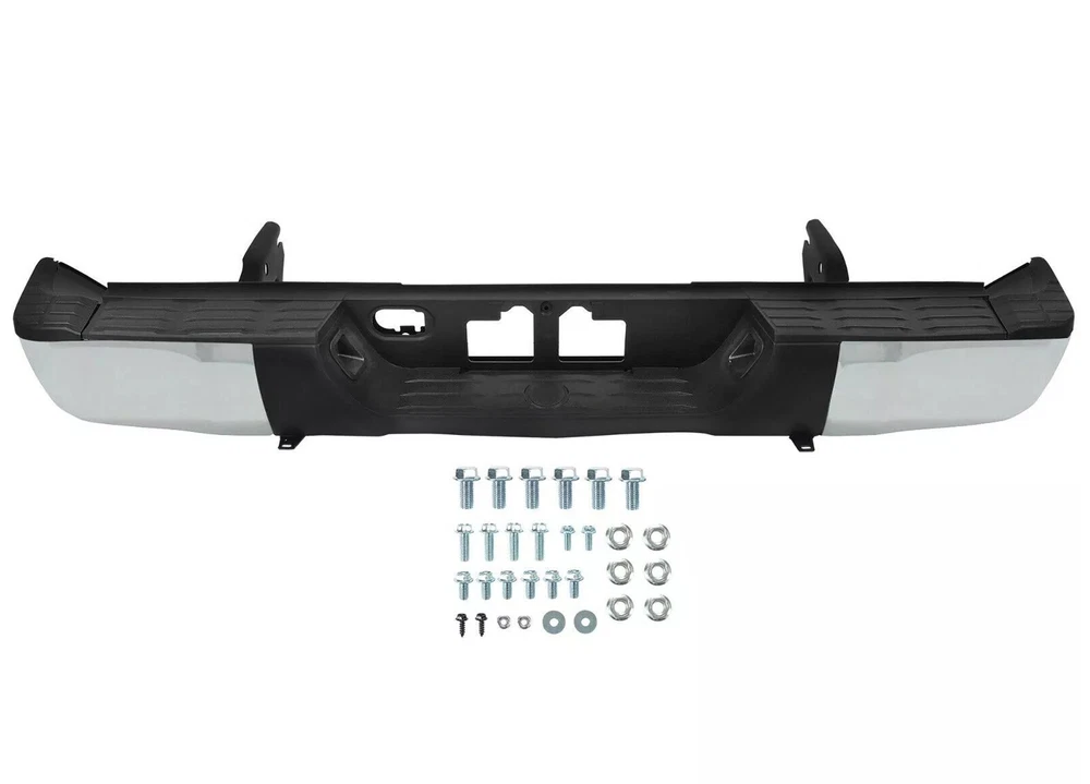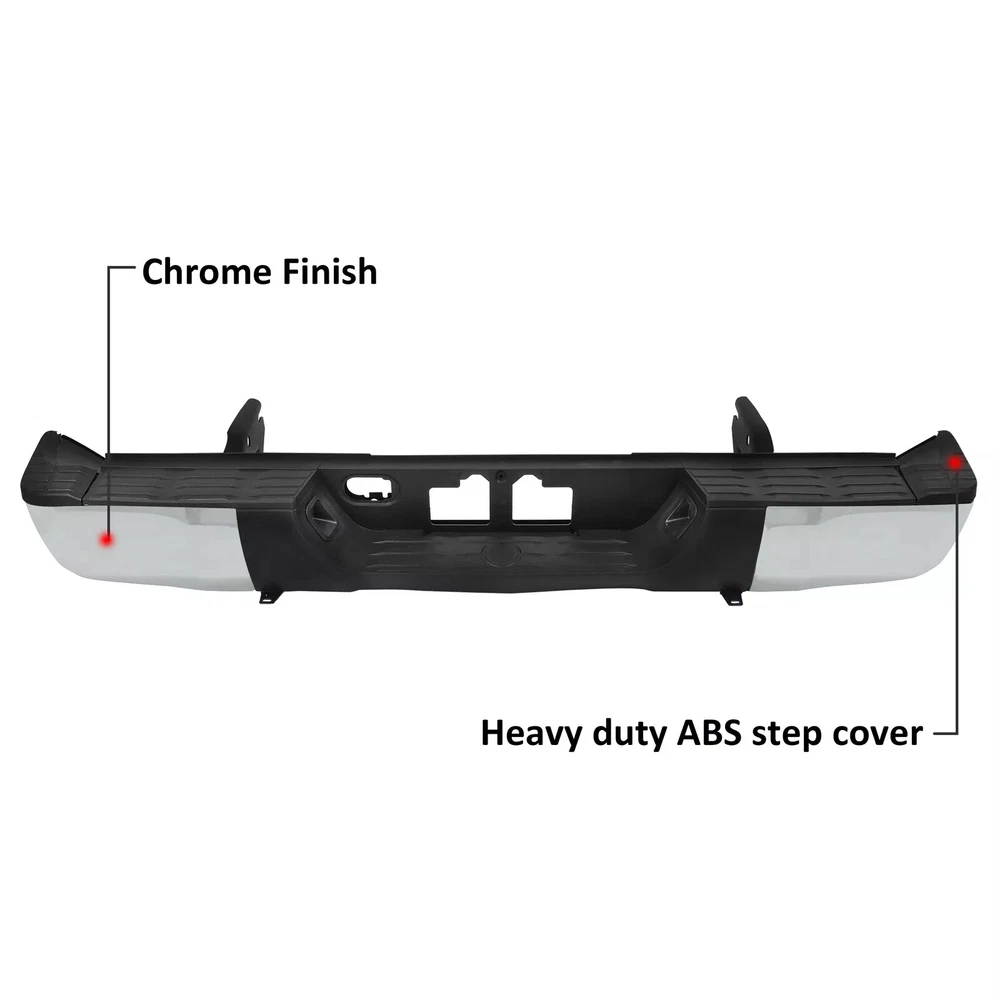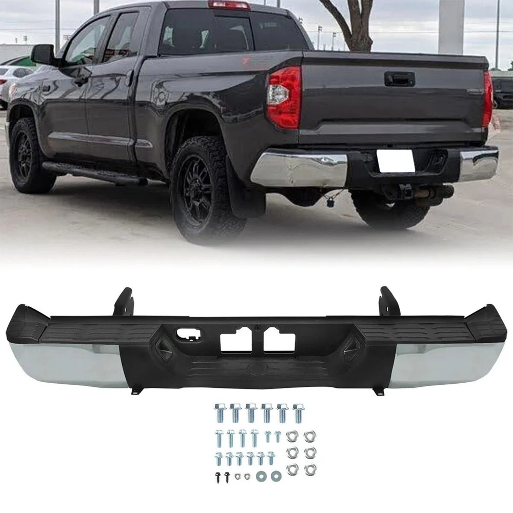 Color:Chrome + Black Surface Finish:Chrome Material:Steel + Plastic Placement on Vehicle:Rear Aftermarket Replace Number for TO1103119, TO1104123, TO1105123, TO1191104, TO1196102, TO1197102, TO1190103, TO1162103, TO1126100, TO1127100 Fits: For Toyota Tundra 2014-2021 Fit Models Without Sensor Hole Only Package: 1 set of Rear Step Bumper
