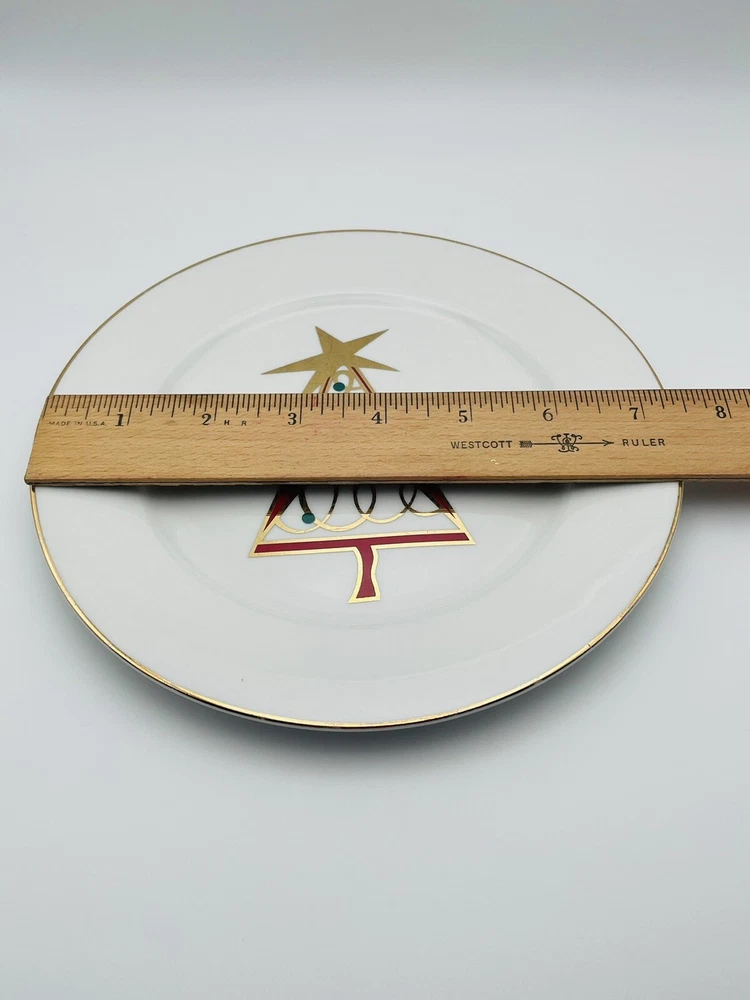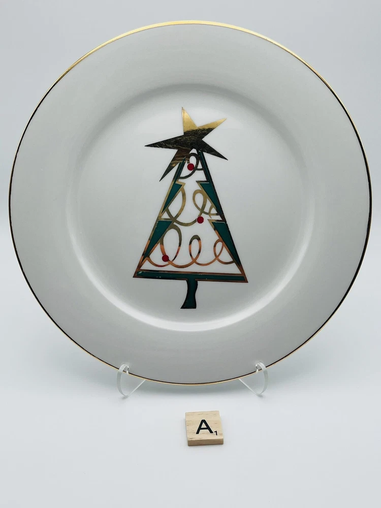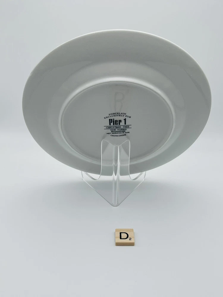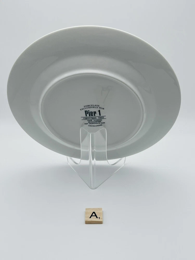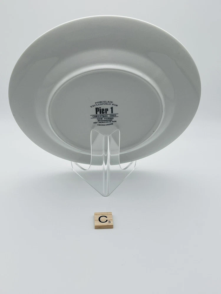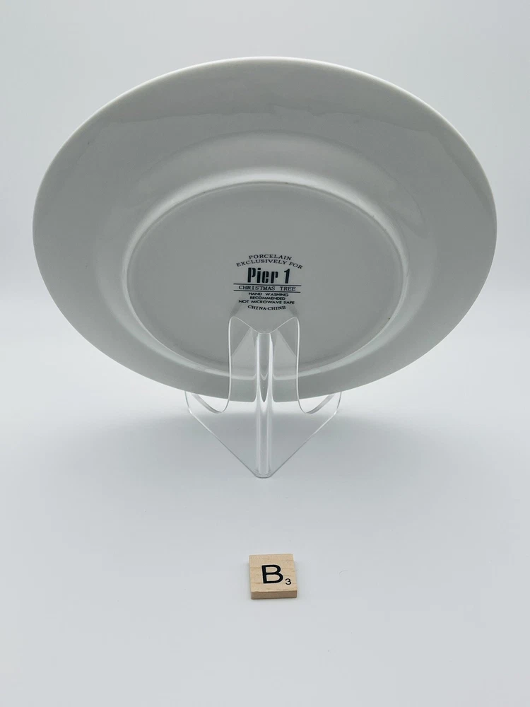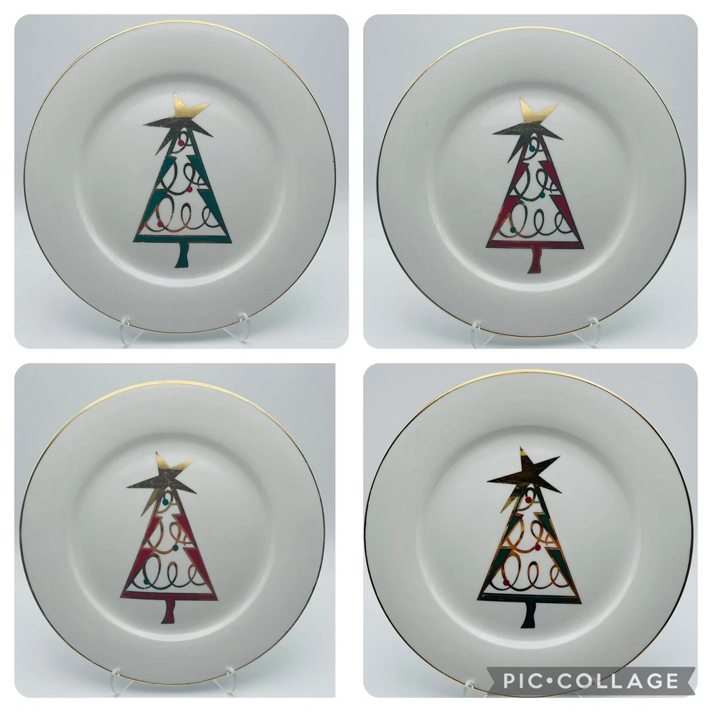Set of 4 Pier 1 porcelain salad or dessert plates featuring a Christmas tree design and gold rim. 2 of the plates have a red Christmas tree design and 2 have a green Christmas tree design. These plates have no chips or cracks but do have some mild surface design wear from use. Each plate has been individually photographed. Please note that the easels are for photography purposes only and are not included in the listing. Plates will be carefully packed and shipped within one business day. Please reach out with any questions and thank you for shopping Cajun Girl Collectibles!