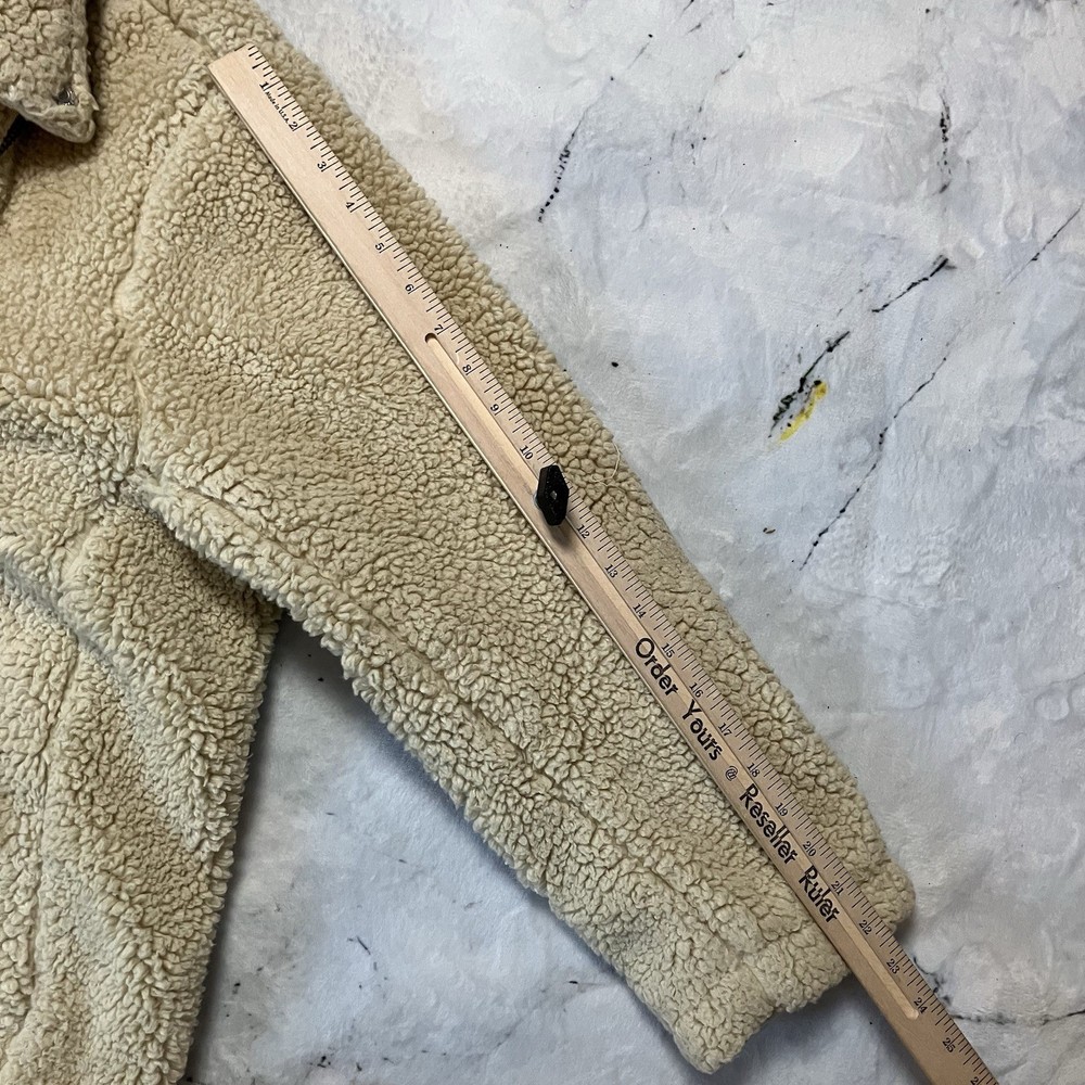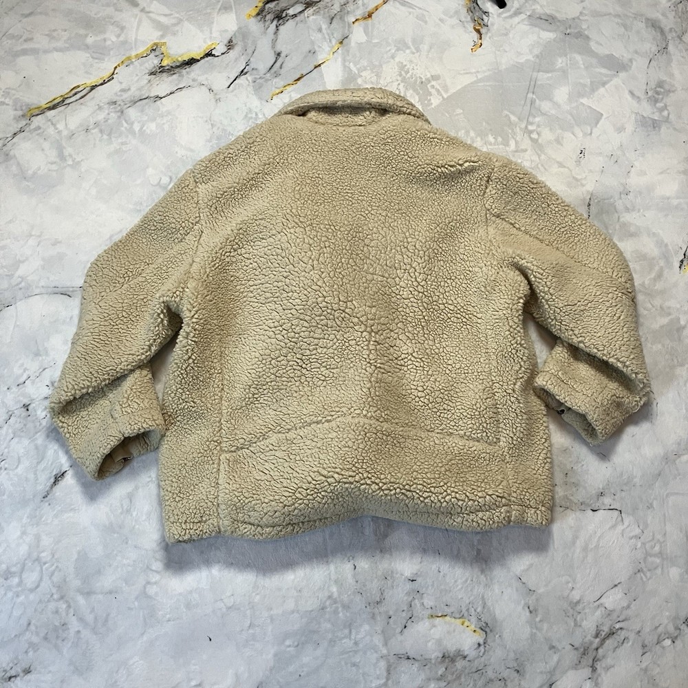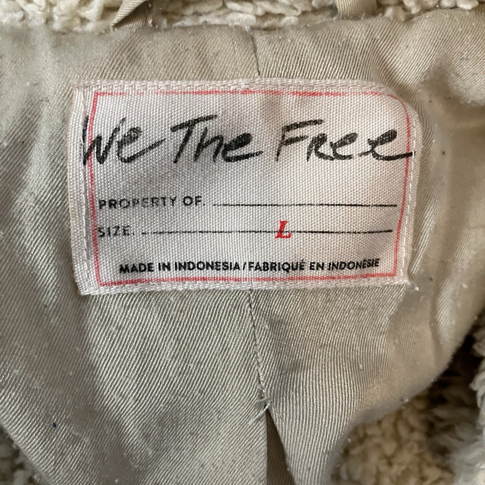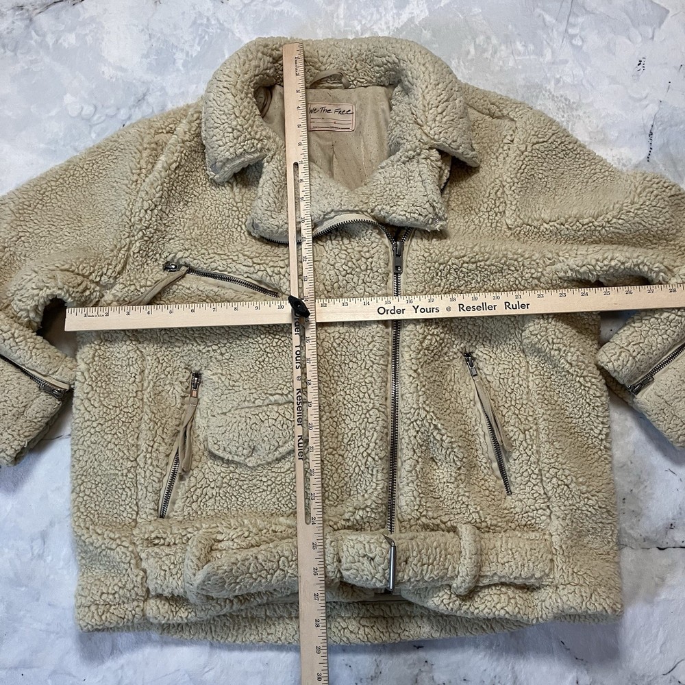 The Free People So Cozy Sloucky Moto Faux Fur Cream Jacket in size Large is a stylish and cozy outerwear option for women. Made from polyester with a knit fabric type, this short-length jacket features long sleeves, a zip and buckle closure, and a relaxed fit. The ivory color and solid pattern give it a versatile look suitable for casual occasions or travel. Perfect for the winter, fall, or spring seasons, this bohemian-inspired motorcycle jacket from Free People is a trendy and comfortable addition to any wardrobe. Good condition, light wear on inside of jacket