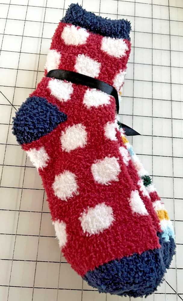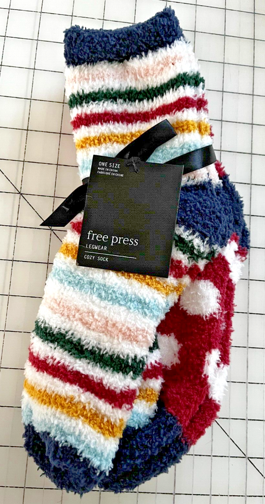 Women's Free Press Cozy Socks Soft and Fuzzy 2 Pair 1- White with Multicolor Stripes 1- Burgundy with White Dots One Size Fits Most Polyester Blend **tag back not in perfect condition** Smoke free home Thanks for looking