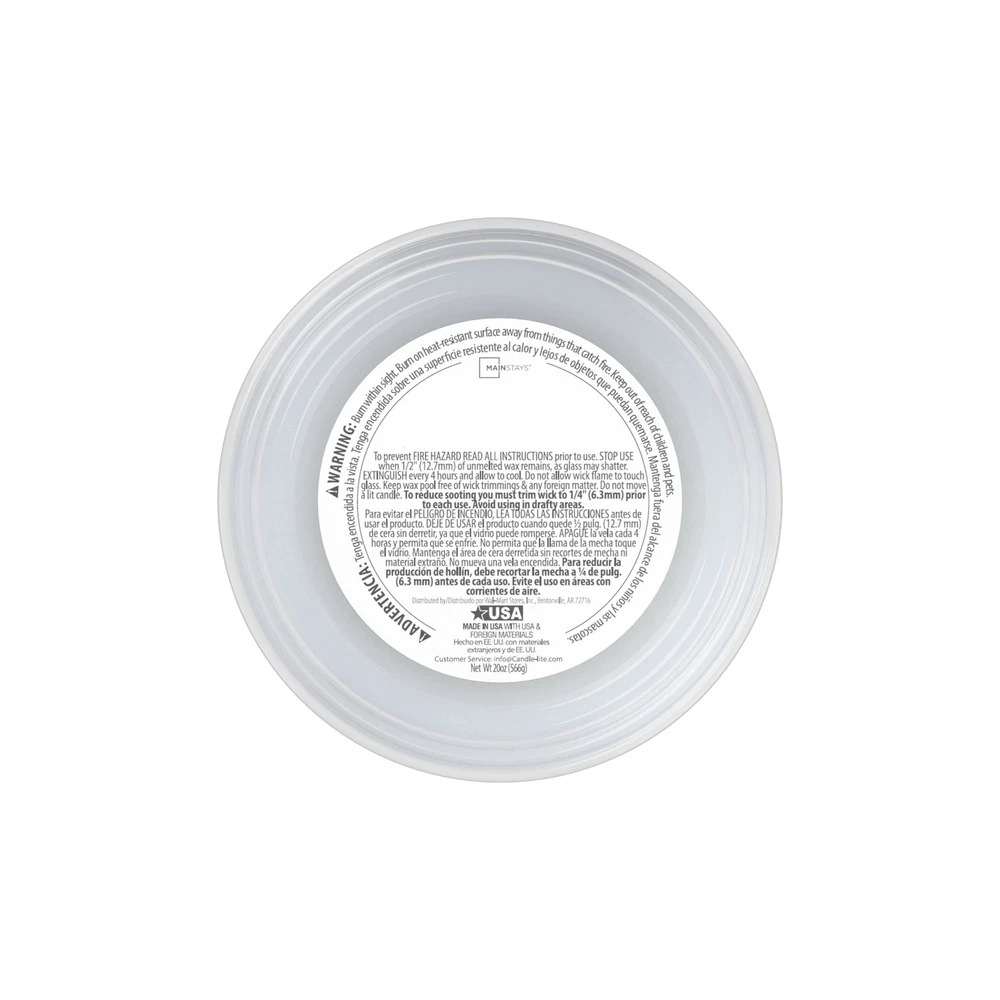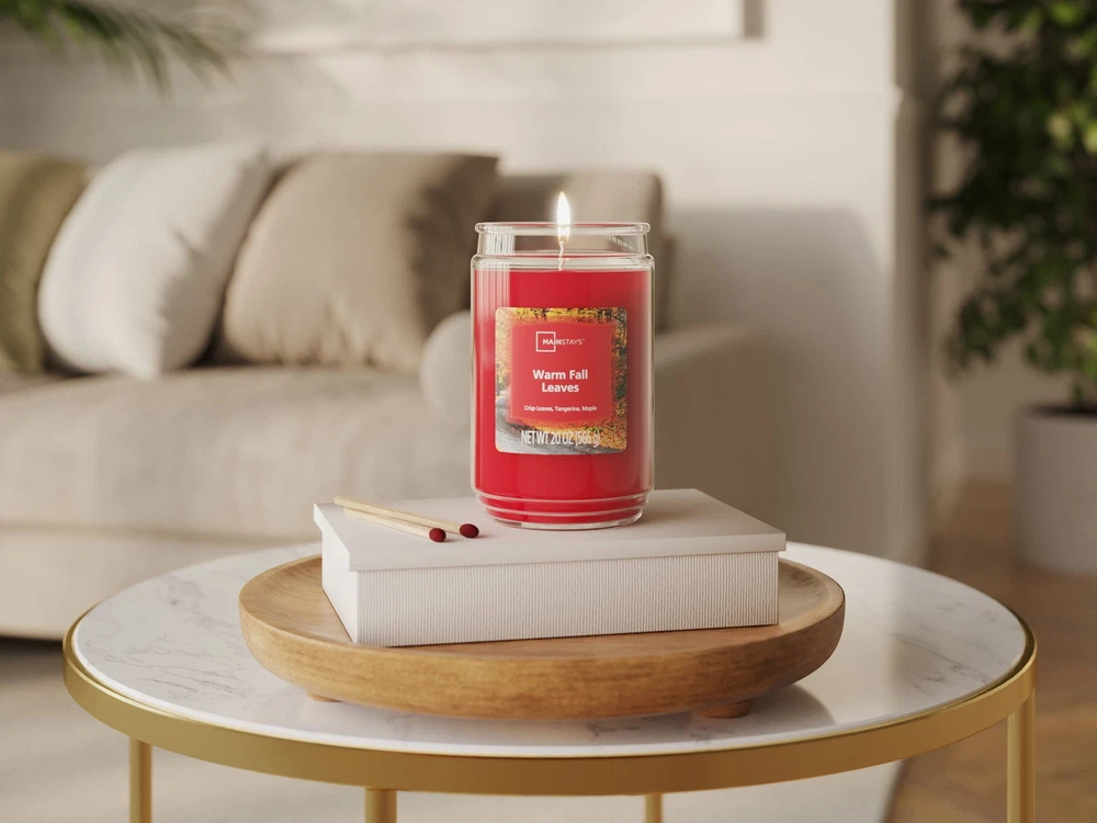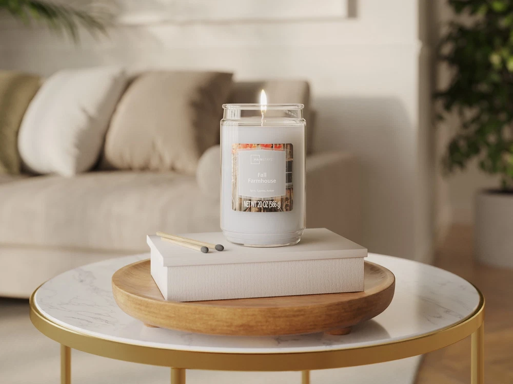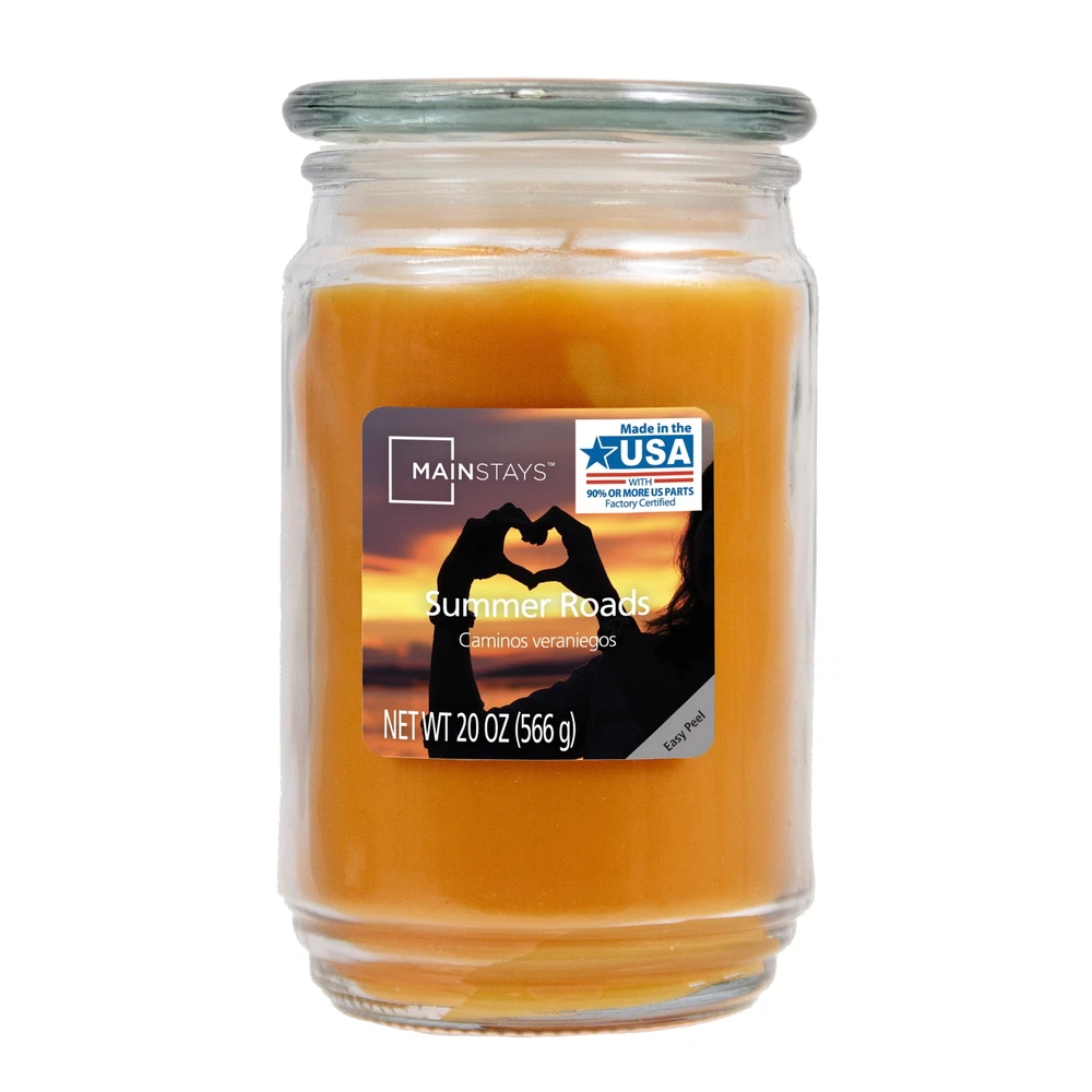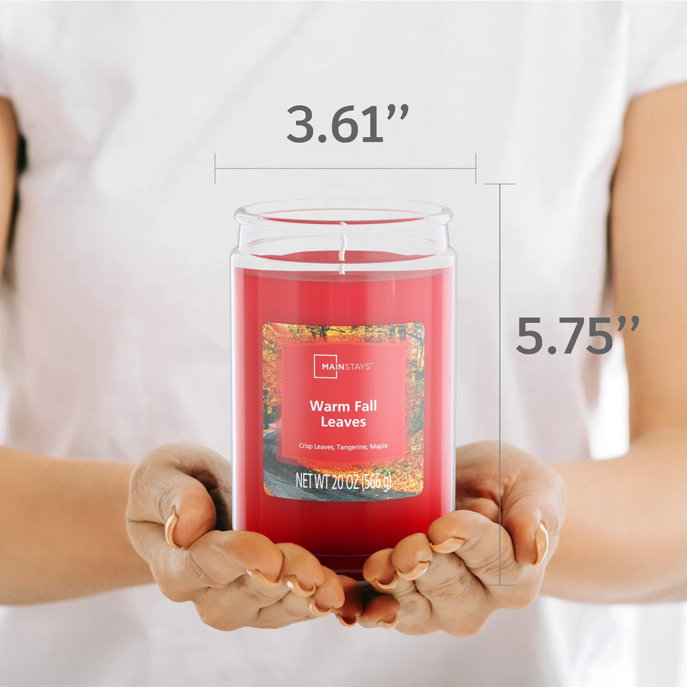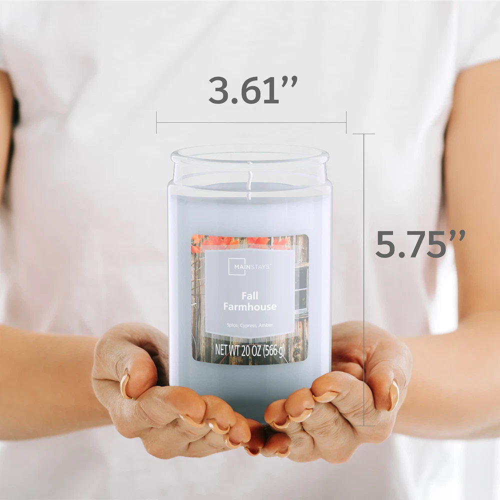 Introduce a soothing aroma into your living space with Mainstays candles. Mainstays scented candles are highly fragranced, and provide a clean and even burn that will fill your home with beautiful and enticing seasonal aromas. Place this candle in the kitchen, living room or dining room where you can enjoy it when entertaining guests or anytime you want to relax. Trim the wick periodically to promote even burning. Mainstays offers a wide selection of candle scents to explore and enjoy. Shop all of our Mainstays scents online and in-store. Mainstays Single Wick Jar Candle, 20 oz Mainstays Fall Farmhouse fragrance, contains red , oak wood and ambered incense fused with gently spiced birch, soft hickory and woodland herbs amid aromatic cypress and rich fir balsam Complements virtually any room decor 20 oz. single-wick candle burns for approximately 100-120 hours Features a decorative beveled edge glass vessel Mainstays single-wick scented candles are highly fragranced, and provide a clean and even burn that will fill your home with beautiful and enticing aromas Our candles are made from high quality, non-toxic, clean-burning wax that is specifically developed to hold optimal fragrance loads Our Mainstays 20oz candle is available in a variety of scents