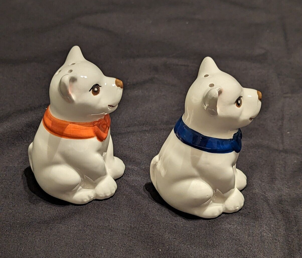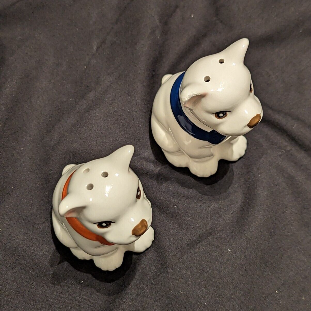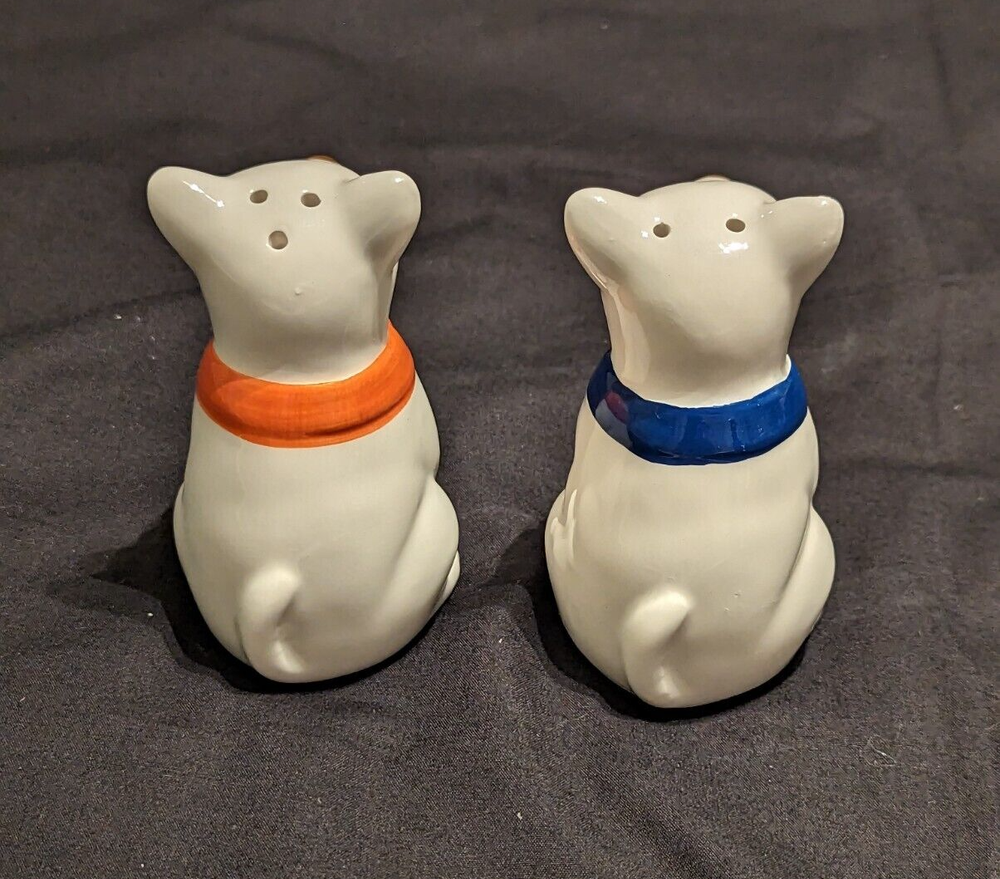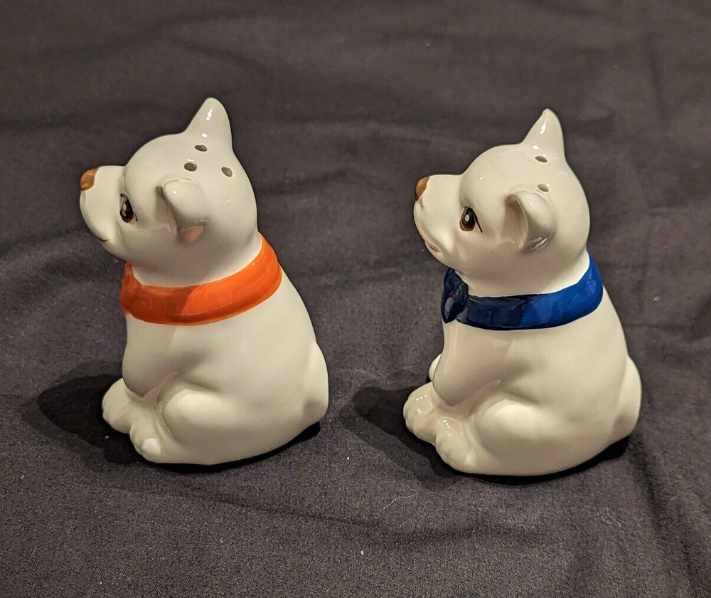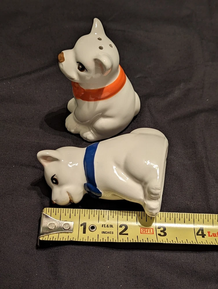 Product Description: One set of a Bulldog salt and pepper shakers. Each one is white and sporting a blue and red bowtie. Measurement each: 3.5"H x 2"W x 2.5"D.
