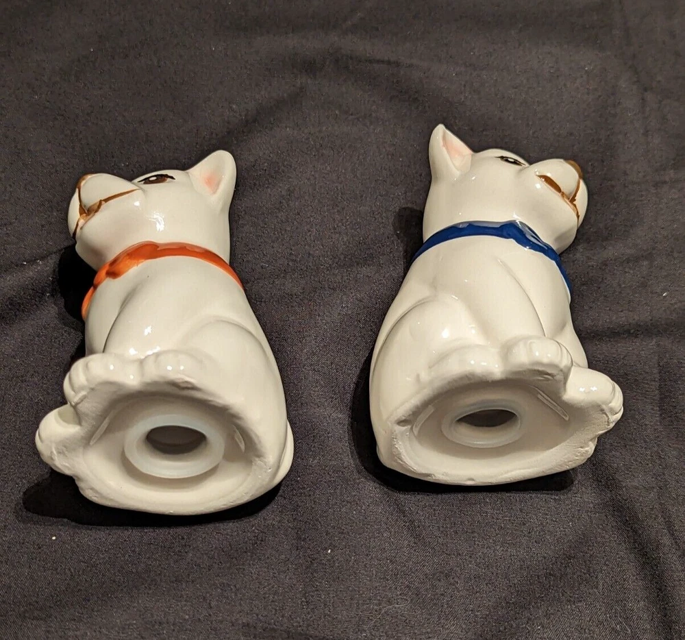 Product Description: One set of a Bulldog salt and pepper shakers. Each one is white and sporting a blue and red bowtie. Measurement each: 3.5"H x 2"W x 2.5"D....