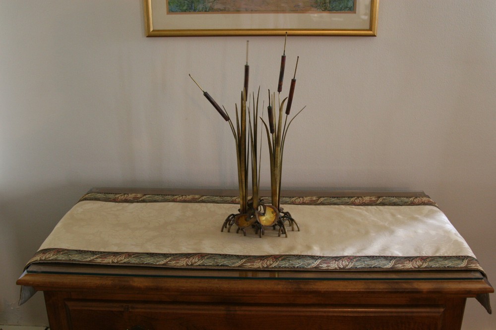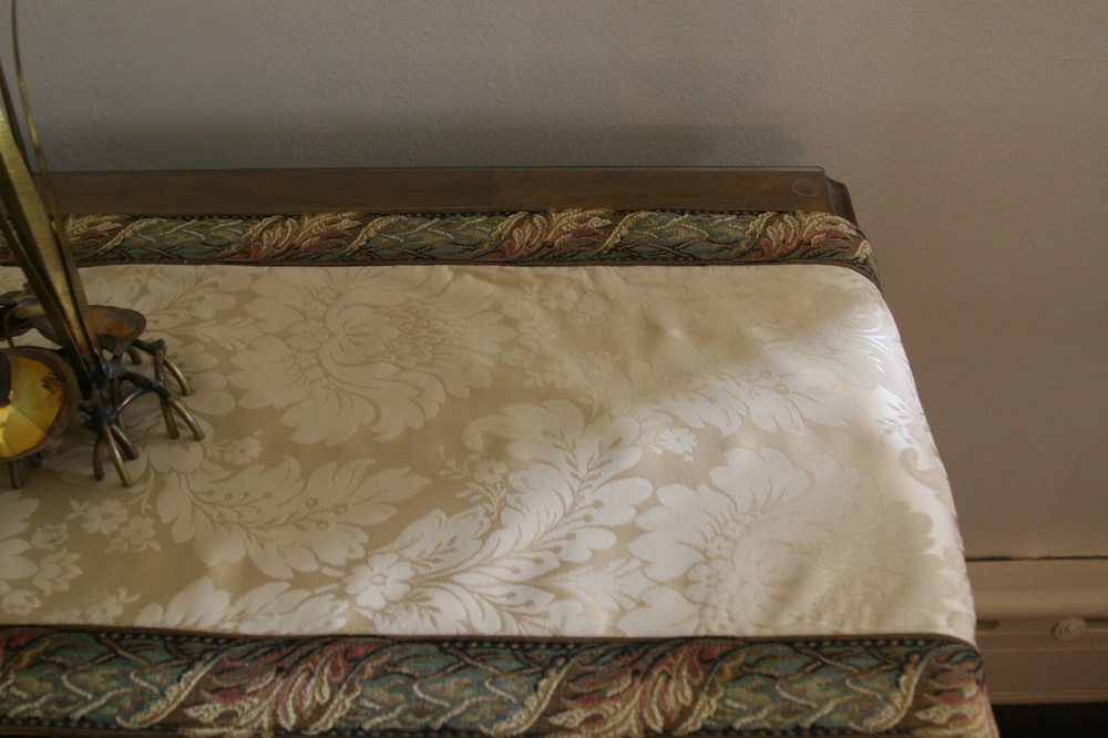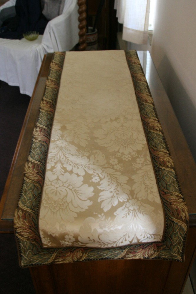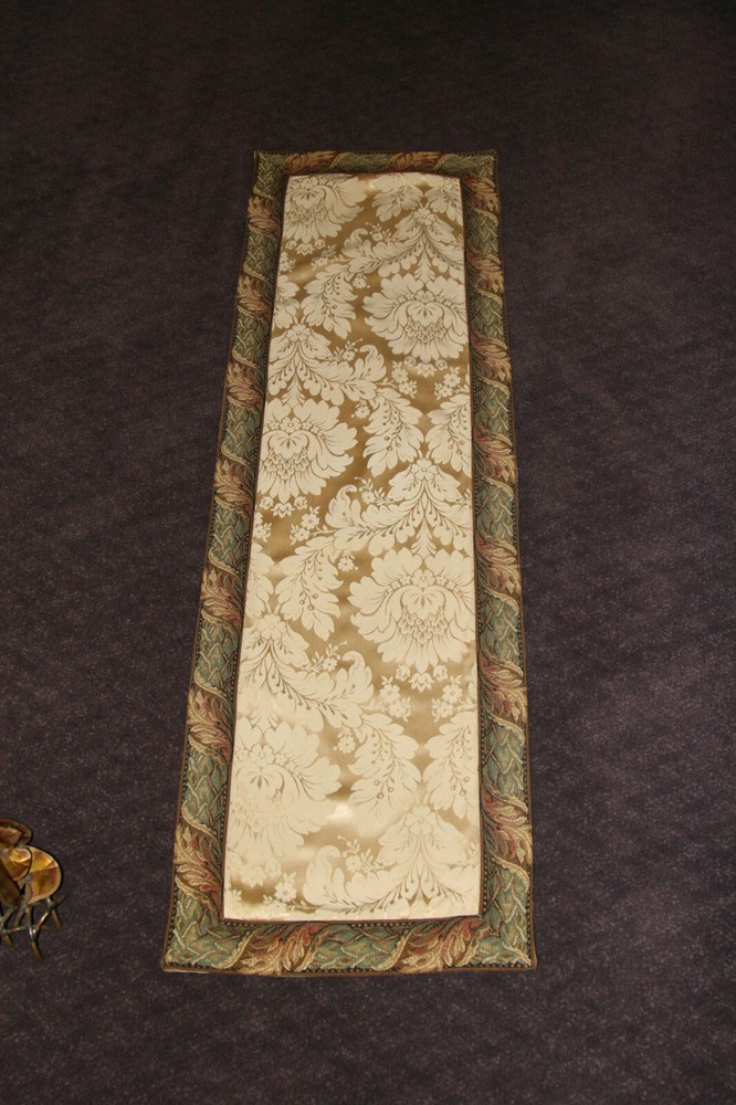 An excellent way to enhance the look of your room with some French style! This table runner was custom/hand made by San Remy - a very famous store on the upper East Side of NYC that specialized in imported glamorous old-world fabrics, furnishings and curios from France - tapestry fabrics, throw pillows, ottomans and even weekenders! For sale is a lovely damask table runner in an ivory/champagne color. The runner is edged in a tapestry band with a floral design in greens, white,cream, toast, rose, teal and light brown - the fabric design is floral with a floral/acanthus design. The fabric is a silk/rayon/cotton blend. Measures approximately 48" long and 15" wide. Comes from a non-smoking home. Please ask any questions before bidding.