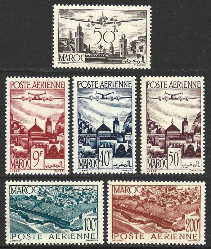 French Morocco 1945, 1947-48 Airmail Plane over view Sets #C33, C34-C38 F/VF-NH. CV $15.65 Take your collection to the next level with this philatelic artwork depicting picturesque aerial landscapes. Authentic and unhinged, this set is a treasure trove for any postal enthusiast and a rare find for collectors seeking authenticity and finesse. Pursuant to the guidelines for all sales of tangible goods, taxes will be collected and remitted to the appropriate tax authorities. Possible Customs charges, depending on the rules in force in the country of destination. All lots are guaranteed. If you consider that the lot is not as described, you can send it back for full refund (except certification and registration cost) within 30 days of purchase. Member: The Royal Philatelic Society of Canada The Christmas Seal & Charity Stamp Society Haiti Philatelic Society The British North America Philatelic Society