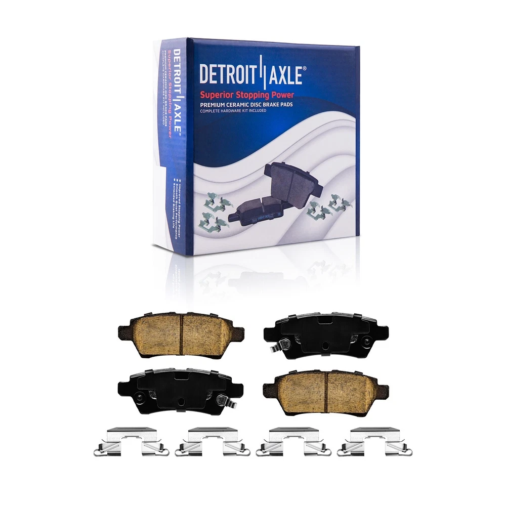 Warranty Details Click here for Warranty Details Questions? Call us! Monday-Friday 8am - 6pm ET Saturday 8am - 4pm ET Complete Front & Rear Disc Brake Rotor + Ceramic Brake Pad Kit Fits Driver and Passenger Side Kit Includes: 2x - Both Front Drilled & Slotted Disc Brake Rotors: S-31412 2x - Both Rear Drilled & Slotted Disc Brake Rotors: S-31429 2x Front Ceramic Brake Pads (Hardware Included): P-1094 2x Rear Ceramic Brake Pads (Hardware Included): P-1101 Specifications: Zinc Dichromate Coated for Rust Prevention For Both Driver & Passenger Side Fits Both Front & Rear Position Cast from OE Grade Alloy Machined to OE Specs 6-Lug Wheel Holes Direct Replacement FITS: MAKE MODEL YEAR RANGE SPECIFIC DETAILS NISSAN PATHFINDER 2005 - 2007 All Models NISSAN PATHFINDER 2008 - 2012 V6 Models Only; 11.65 Inch (296mm) Front Rotor Not what you were looking for? Search our Store Page to find the right part! Wear and Tear This item is backed by a warranty against defects in materials and workmanship under its intended use. The warranty does not cover normal wear and tear. 10 Year Warranty If this item fails due to manufacturing defects for intended use, we will replace the part (excluding shipping charges) for the original purchase. Brand Information Detroit Axle offers parts and accessories for the perfect combination of quality and value. Detroit Axle offers cost-conscious customers a full range of parts to a broad range of application. Provides extensive coverage of bearings for a broad range of automotive and heavy-duty 4x4 wheel applications. Manufactured in ISO 9000 / ISO 9001 / ISO 9002 certified facilities gives the fit, performance Reliability and durability of OE. Detroit Axle offers an extensive lineup of Wheel Bearings, CV Axles, Power & Manual Steering Rack & Pinions, Gear Boxes, Ready Struts, Drive Shafts, Prop Shafts and much more. Manufacturer Information Detroit Axle offers an extensive coverage of bearings for a large range of automotive and heavy-duty wheel end applications. Our Products are manufactured in ISO 9000 / 9001 / 9002 certified facilities. Detroit Axle products deliver the look, feel, fit and performance of OE. Manufactured with Internal bearing seals that are specifically designed to combat all types of road conditions to keep debris out and keep the bearing turning. With an OE design, simple installation and long life as a guarantee. Payment Paypal, Visa, and MasterCard are the accepted forms of payment. Please use the eBay checkout system when paying for your order. Immediate payment is required for all orders. Shipping All orders placed before 2pm (Eastern Standard) will be shipped the same business day. Orders made after 2pm (Eastern Standard) will be shipped the following business day. All orders in the continental 48 States will be shipped FREE of charge via UPS or USPS at our discretion. Orders outside the continental 48 States (Alaska, Hawaii, Puerto Rico, US territories, or International) will be required to pay a surcharge for shipping. International orders will be shipped via USPS Priority Mail International. Return Policy Customer must contact Detroit Axle within 30 days of receiving shipment for approval of any return or exchange. Returns or exchanges will be subject to a 15% restocking fee of the original item purchased plus cost of return shipping and replacement shipping. Exchanges due to shipping errors by Detroit Axle will not be subject to a restocking fee or shipping charges. Track Page Views With Auctiva's FREE Counter