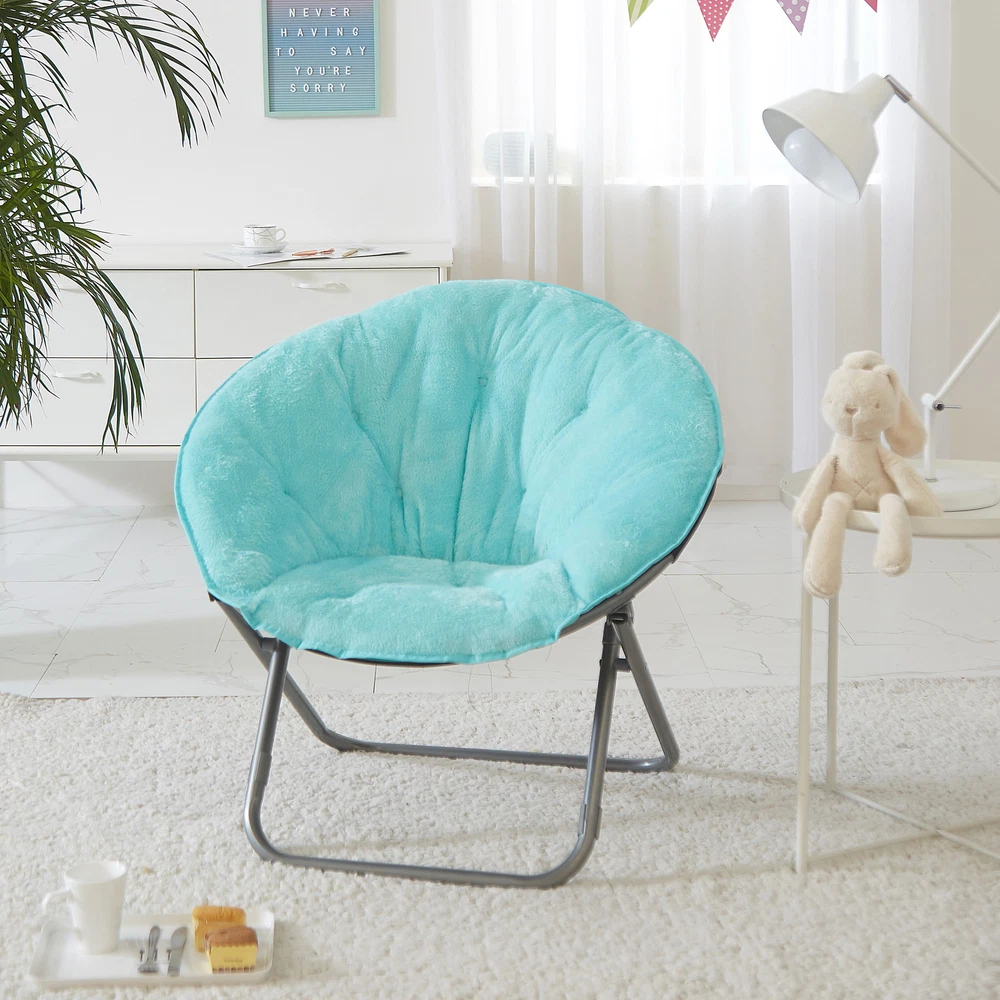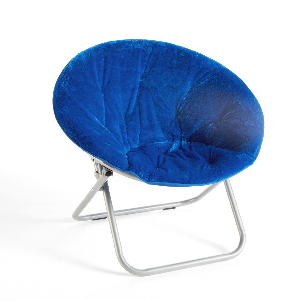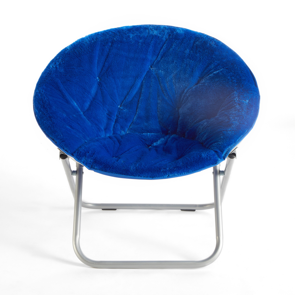 Fur Faux Saucer Chair Folding Steel Frame Portable for Living Room Bedroom, Blue Hinged The Mainstays saucer chair's cushion is made from durable, plush 100 percent polyester upholstery. The faux-fur material is soft and cuddly to the touch. A foldable steel frame supports up to 225 lbs and folds flat when not in use, making it easy to hide this saucer chair out of sight without taking up a significant amount of room in tight spaces. Add additional seating to living rooms, bedrooms, rec rooms and other areas of your home or apartment with this fun furniture piece. The Mainstays faux fur saucer chair's selection of multiple colors makes it simple to choose the right design for any space. Add a fun, cozy touch to dorm rooms, lofts, reading nooks and more with this comfy seat. Provide a convenient place for friends to sit while visiting with this Mainstays saucer chair. No assembly is required, just fold open and sit down to start using this comfortable, portable furniture piece. Mainstays Faux-Fur Saucer Chair, Multiple Colors: Soft, wide seat Foldable steel frame Cool faux fur fabric Great for lounging, dorms or any room 100 percent polyester upholstery Weight capacity: 225 lbs No assembly required Dimensions: 30"L x 28"W x 29"H Available in various colors Faux fur chair adds a colorful and cozy decorative touch to rooms Directions Fabric Care Instructions: Spot clean Assembled Product Dimensions (L x W x H) 30.00 x 28.00 x 29.00 Inches Color Blue Brand Mainstays Actual Color Blue Manufacturer Part Number WK659842 Lifestage Child. Teen Recommended Location Indoor Set Includes Chair Upholstery Fabric Faux Fur Room Living Room, Home Office/Study, Bedroom, Hallway Frame Material Steel Features Armless, Padded Seat, Upholstered Indoor/Outdoor Indoor Additional Parts Required N Assembly Status Fully Assembled MPN WK659842