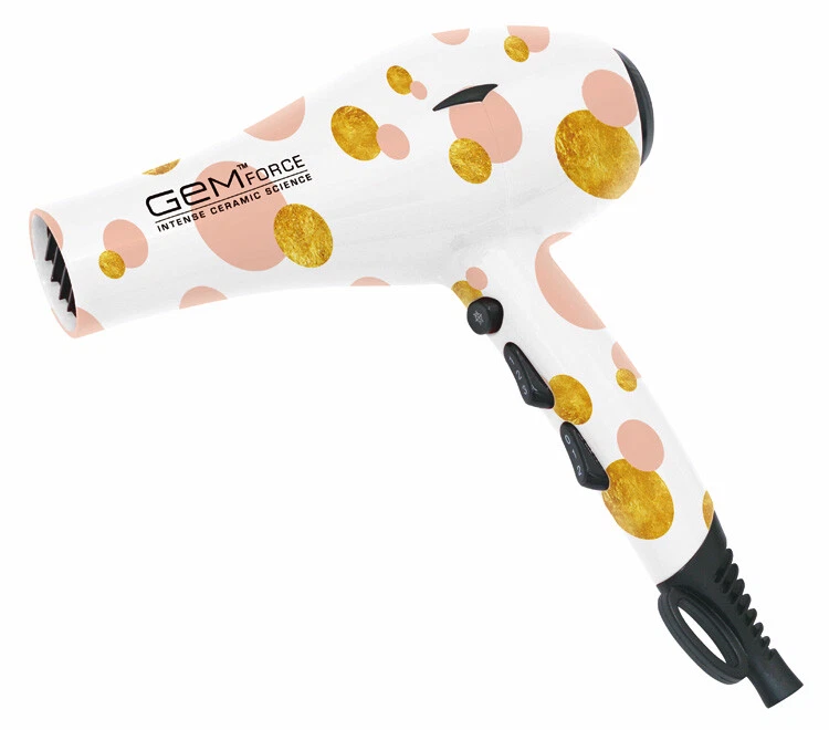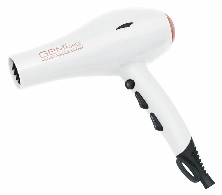 BRAND NEW GEM Force Intense Ionic Ceramic Science Hair Dryer 1 Year Manufacturer Warranty Intense Ionic Ceramic Science Super Heat & Air Flow Hair Dryer Far Infrared . Low EMF . Superior Technology Low EMF Ionic Ceramic Science Super Heat & Intense Air Flow Even Heat Distribution Dries hair evenly in almost half the time Dual Air Control Setting Cool Shot Button Produces Negative lons and Far Infrared to seal in vital moisture and repel humidity Professional Light Weight Hair Dryer with DC Motor Ergonomically Balanced and quiet performance Nozzle and Finger Diffuser Included 12 Foot Professional Cord 1 Year warranty
