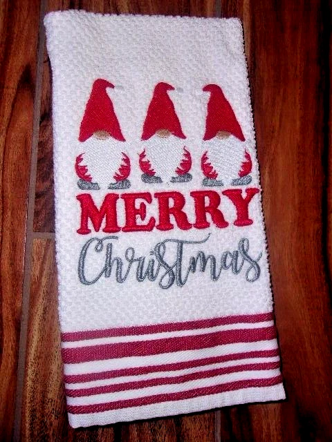 Three Gnomes in a row "Merry Christmas" Machine embroidered Hand Towel with red stripes Measures 16" x 25" These are top quality Machine wash and dry Comes from a smoke free home Thank you for looking