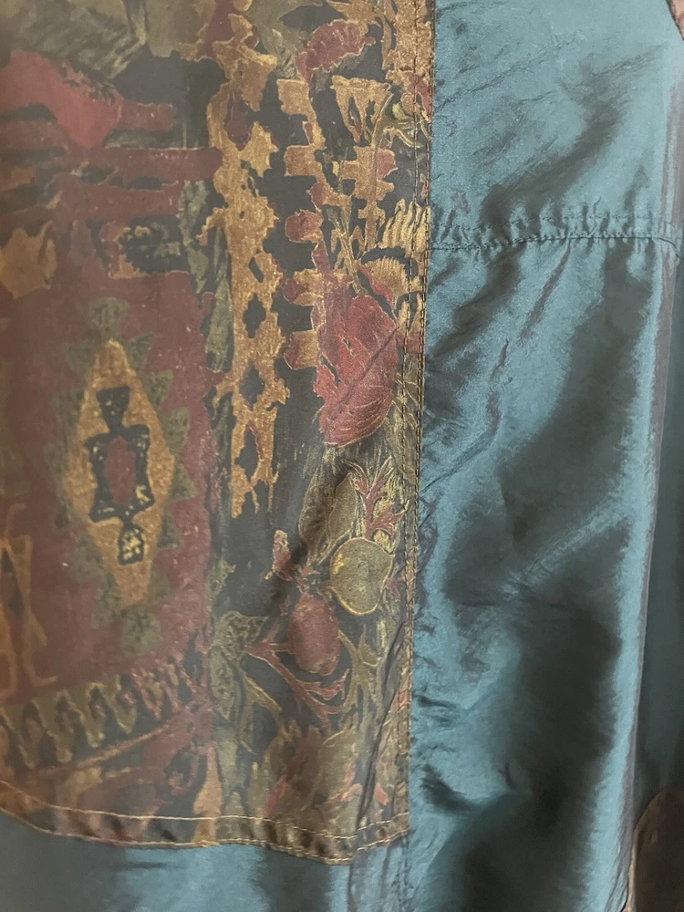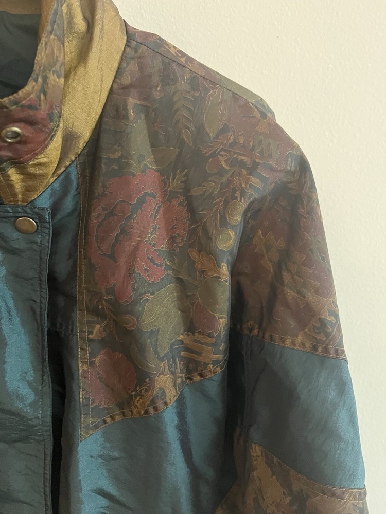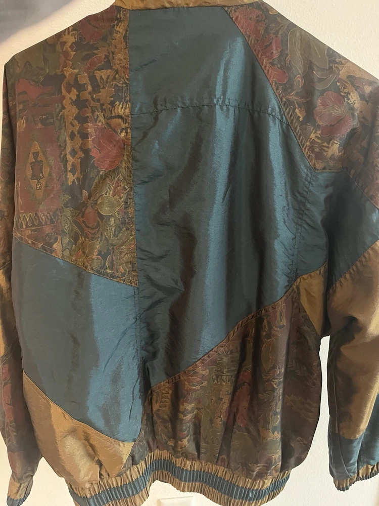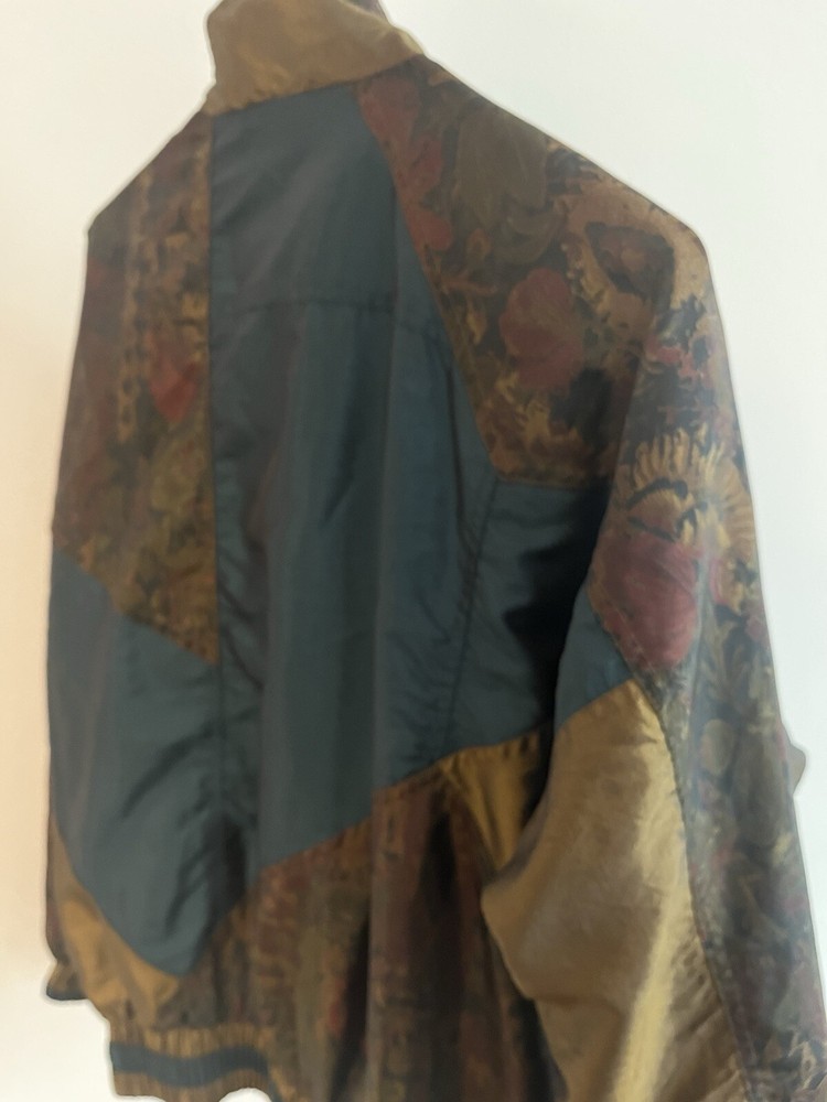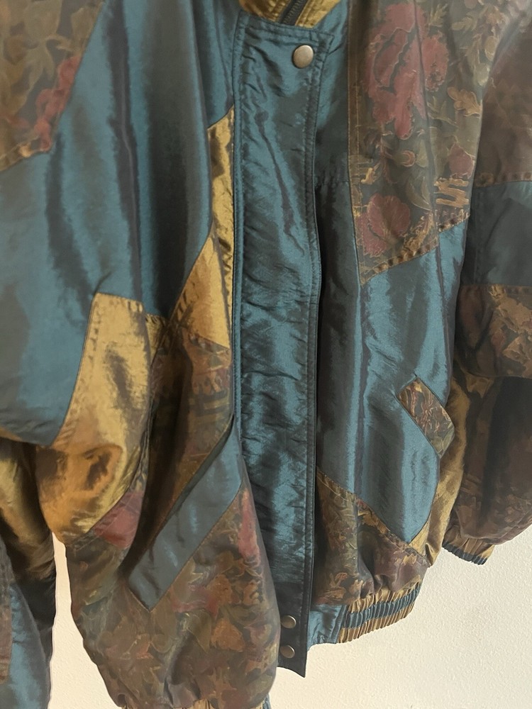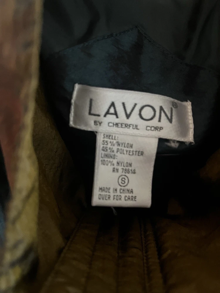 This vintage Lavon windbreaker jacket features a unique Aztec geometric pattern in shades of purple and teal, giving off 80s costume cosplay movie prop vibes. Made of nylon with polyester and cotton lining, this short jacket has long sleeves, a zip closure, and is machine washable. The jacket is accented with quilted detailing, embroidered logos, and a vintage Lavon brand tag, embodying a retro look. With features like elastic waist, shoulder pads, and wind-resistant properties, this limited edition jacket is a stylish and functional piece for all seasons.