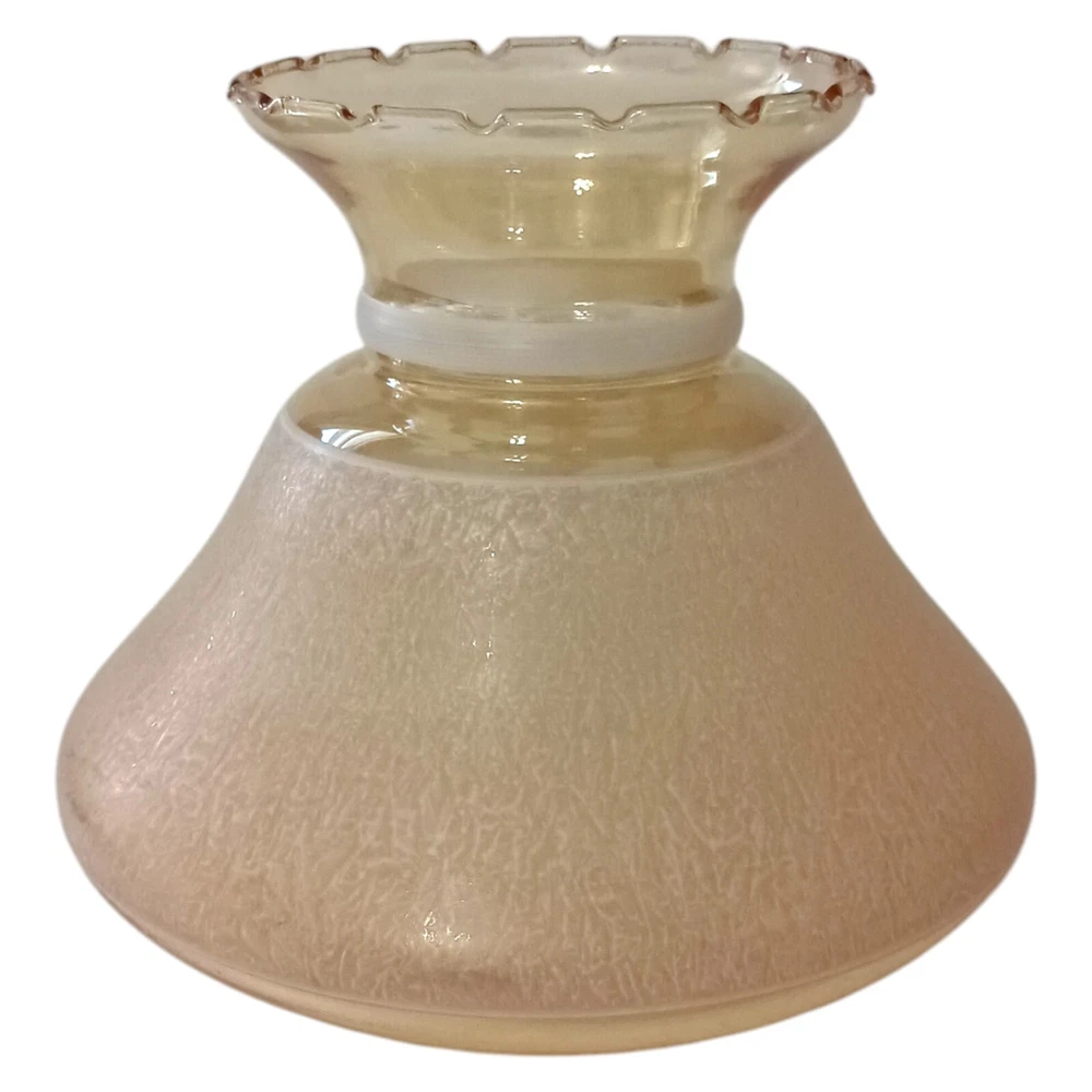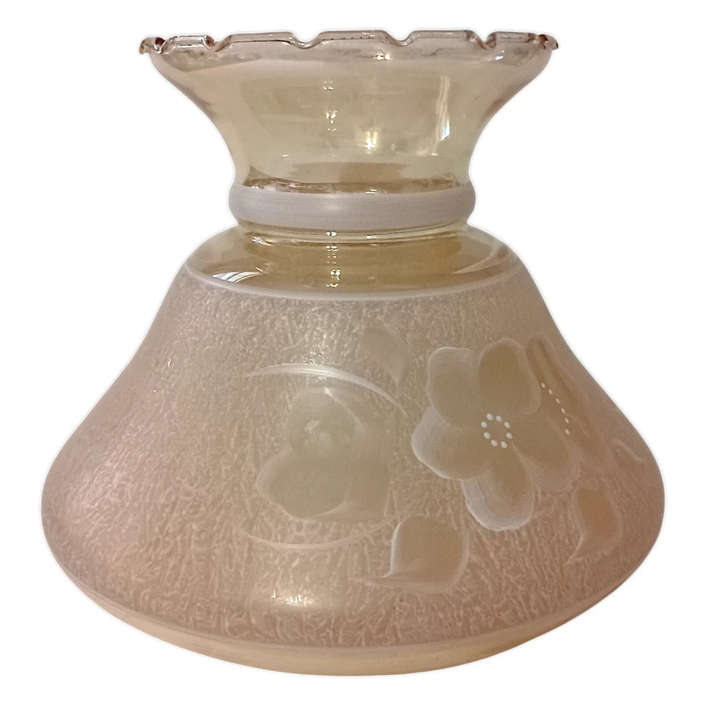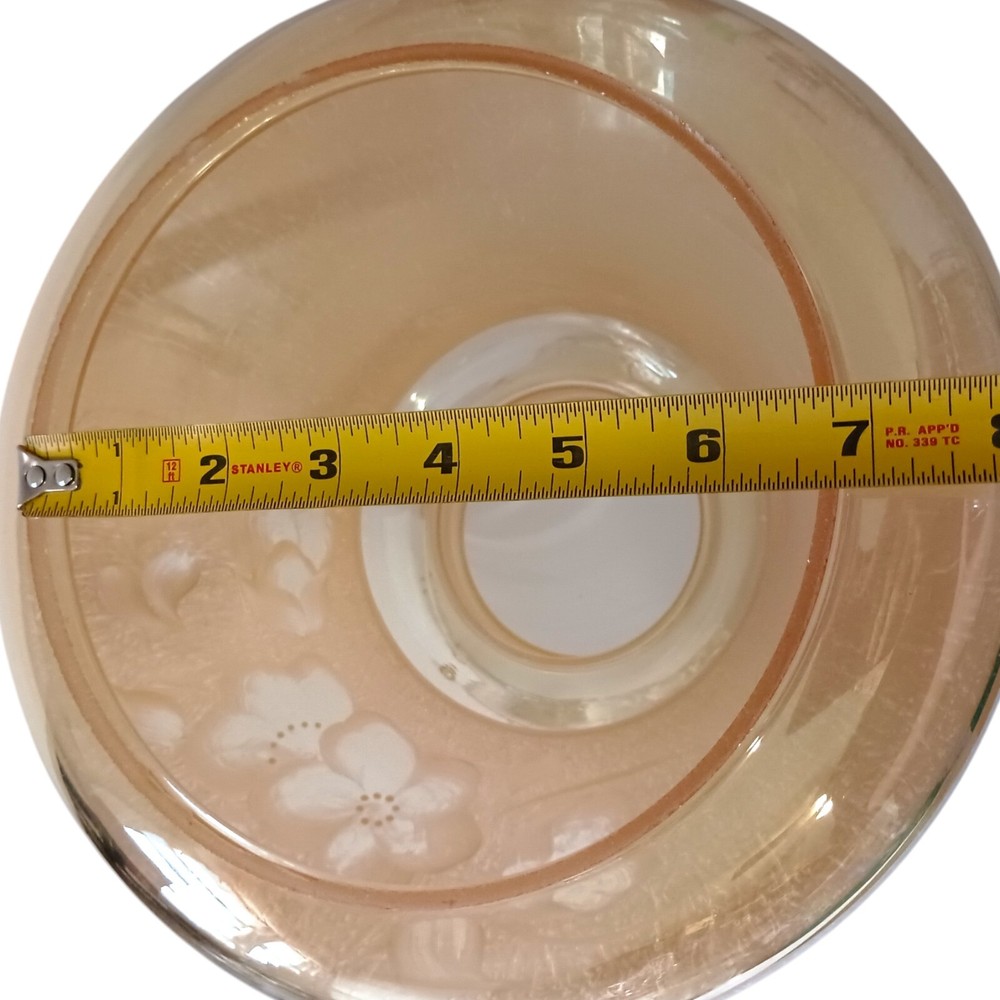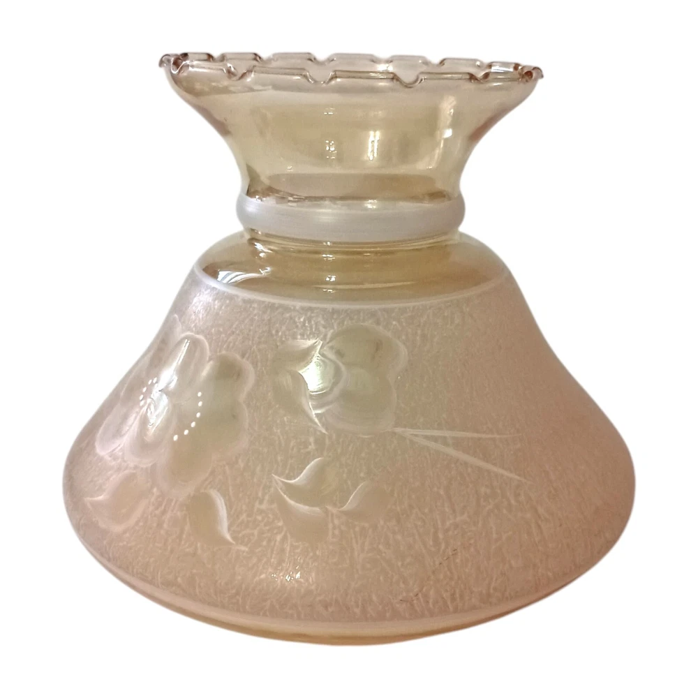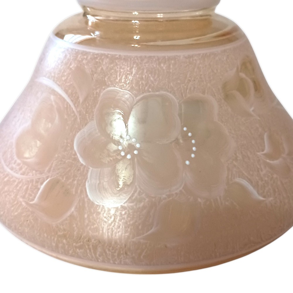 Handpainted Hurricane Lamp Shade Fitter Peach Glass Vtg Iridescent GWTW Floral. Condition is pre-owned and EXCELLENT condition. No chips or cracks. Handpainted white floral design. The glass is a peach color with an iridescence. Measures about 8" tall x 6.75' base rim. Unbranded. Please see all photos for detailed condition. Adorn your space with a touch of vintage charm with this exquisite GWTW Peach Glass Lamp Shade Fitter. Crafted in the late 1940s, it boasts a stunning iridescent peach hue, complemented by a delicate floral hand-painting that encapsulates the elegance of the Victorian era. Designed to fit oil lamps, this bell-shaped shade measures 8 inches in height and 6.75 inches in diameter, making it a perfect complement to a variety of lighting fixtures. The shade's frosted glass material ensures a soft, diffused light that creates a cozy atmosphere in any room. Its unique artistry reflects a period when lamp shades were as much a functional item as they were a decorative piece. Whether you're aiming to enhance your home decor with a shabby chic vibe or simply appreciate the craftsmanship of bygone days, this lamp shade fitter is a testament to the intricate designs of the past.