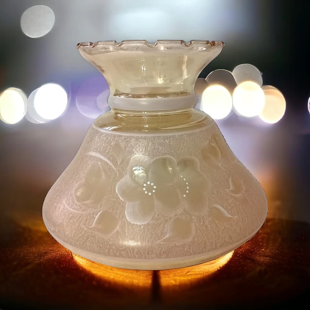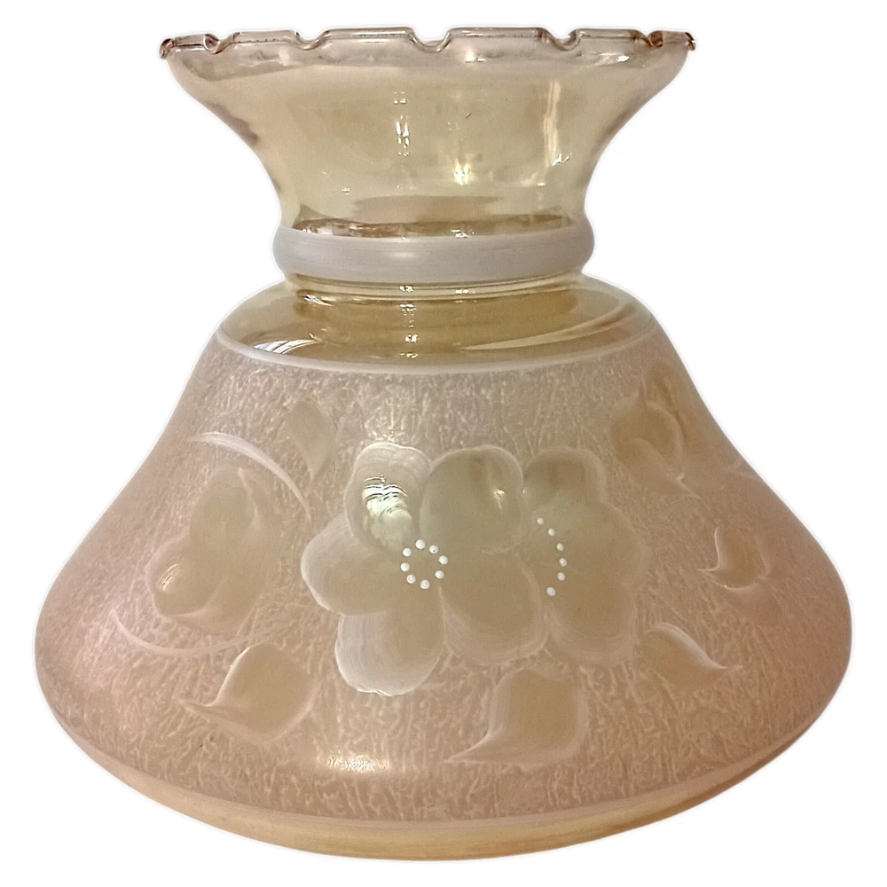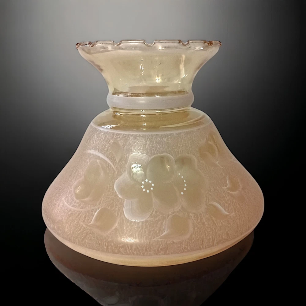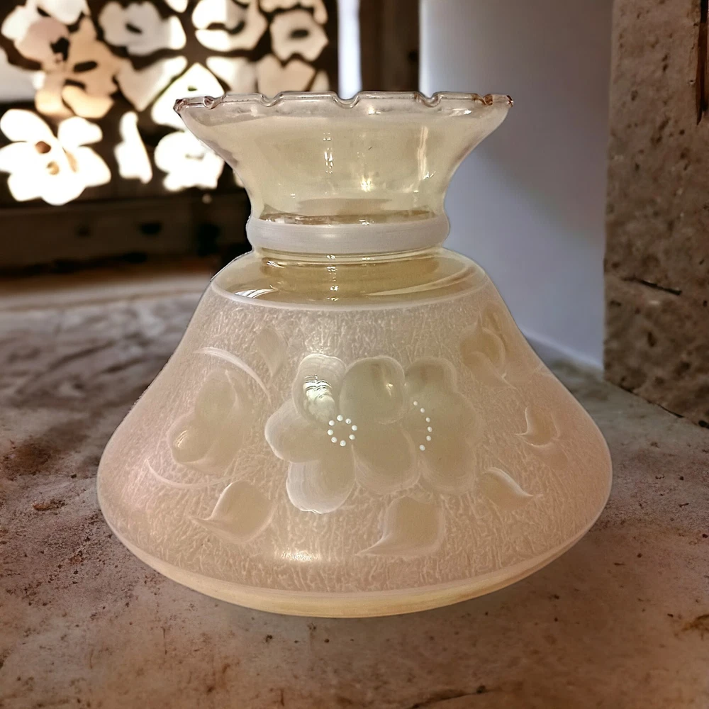 This gorgeous vintage hurricane lamp shade is a true treasure! The iridescent peach glass shimmers beautifully, and the delicate hand-painted white florals add such elegant charm. It's in flawless condition—no chips or cracks—and the perfect size to add a warm, nostalgic glow to any room. The craftsmanship is stunning, and you can tell it was made with care. A fantastic find for collectors or anyone who loves unique vintage decor!