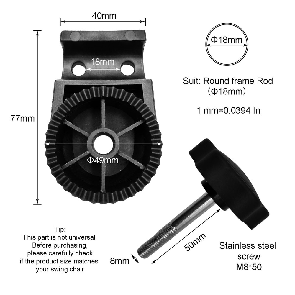 Timyrimy Garden Swing Plastic Fitting (Type 6) for Mainstays Belden Park Swing Version III, Canopy Bracket to Attach Canopy Frame to Swing Frame, Swing Canopy Bracket Replacement Part. ✅ Compatibility: this swing canopy frame connector only fits Mainstays Belden Park Swing Version III with manufacturer's model #MSS436247917029(beige); MSS436247917038(red); MSS436247917037(green); MSS436247917036(blue). Timyrimy only guarantees this tilt adjustment fitting fits based on these manufacturers' model numbers. ✅ Product advice: Walmart sold three versions of Belden Park Swing, especially Version III canopy attachment brackets that look identical to Version II, but these three plastic fittings are NOT interchangeable. This canopy connector clip only fits a round canopy rod with a diameter of Φ18mm (Φ0.71 inches), NOT a rectangular frame. Please compare our size information with your existing frame before ordering to ensure compatibility. ✅ Tips: toothed clamp disc diameter is 49mm (approximately 1.93 inches), adjusting turn knob size is M8 * 50 (diameter 8mm, length 50mm) ✅ Packaging: Each order includes 1 PCS/CTN (1 swing canopy bracket with M8 fixing screw). ✅ More options: Explore additional swing replacement parts and customization services at our Timyrimy store for a wider range of options.