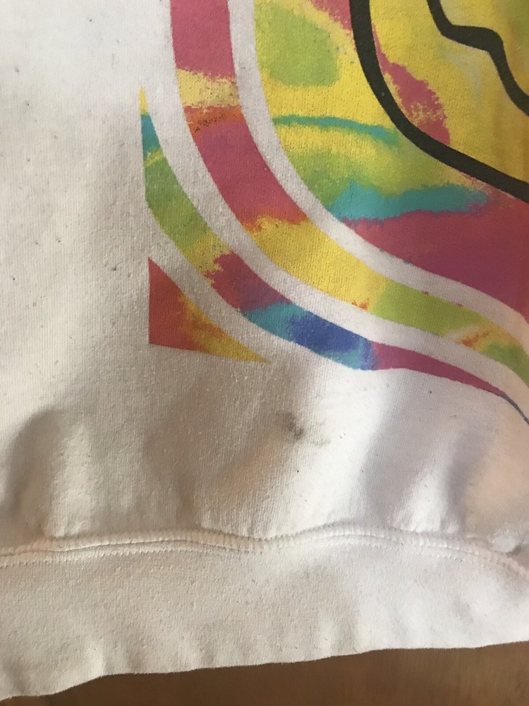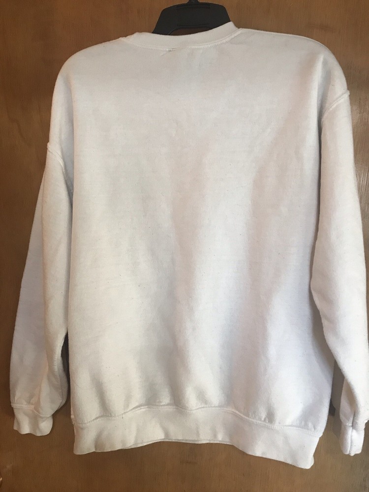 This Gilden sweatshirt in size L features a crew neck, long sleeves, and a pullover style. It is designed with a multicolor pattern and is suitable for unisex adults. The sweatshirt is themed around rock and music from the 90s, providing a comfortable fit for the wearer. Has some fuzzies and a stain as seen in pictures Chest 48 inches Length 26.5 inches