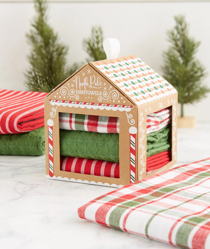 Gingerbread House Gift Set includes one of each dishtowel shown, folded inside a decorative house-shaped box. There are 4 Sets/pk The Dishtowels are 16 x 26-inches and are 100% Cotton. These dishtowels are machine washable in cold water separately and on gentle cycle • Tumble dry low • Low iron NOTE: THE PRICES SHOWN ARE PRE-TARIFF PRICES. WE HAVE BEEN NOTIFIED BY THE MANUFACTURER THAT TARIFFS WILL TAKE EFFECT VERY SHORTLY AND PRICES WILL INCREASE. WE SUGGEST THAT IF YOU DESIRE THIS ITEM, THAT YOU PURCHASE BEFORE THE TARIFF INCREASES TAKE EFFECT. AS A RETAILER WE ALREADY ARE ABSORBING MUCH OF THE SHIPPING BUT CANNOT ABSORB THE INCREASE IN COST AS WELL. THANK YOU FOR YOUR UNDERSTANDING.