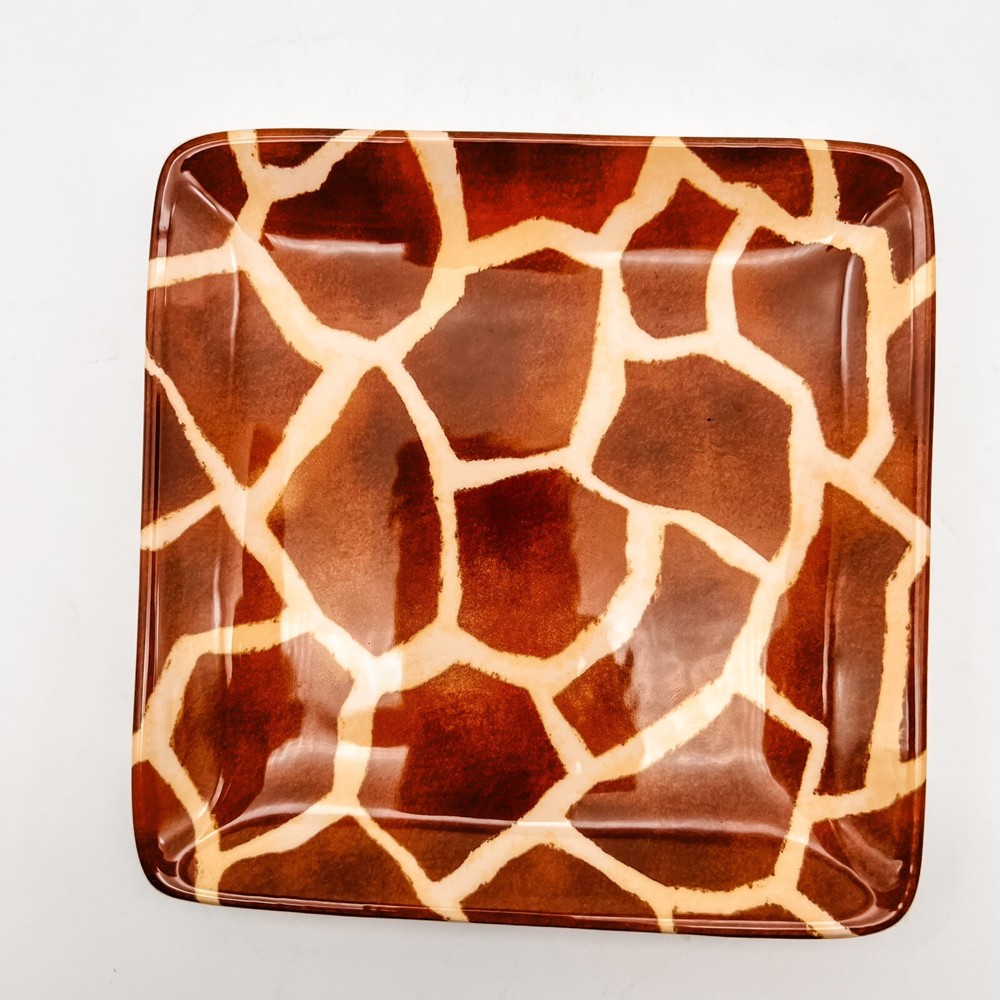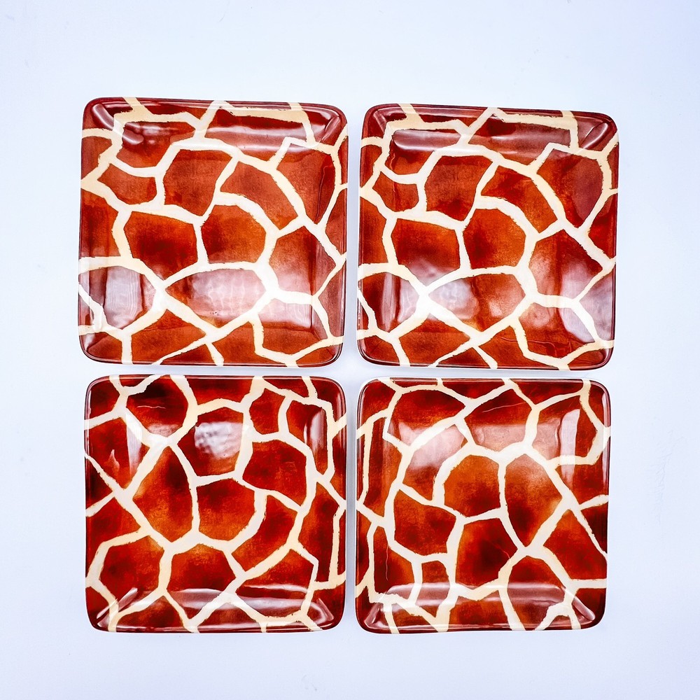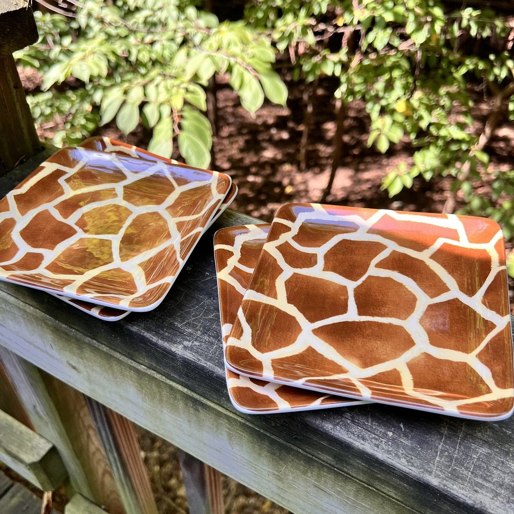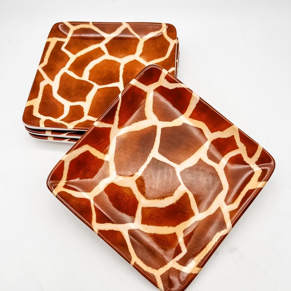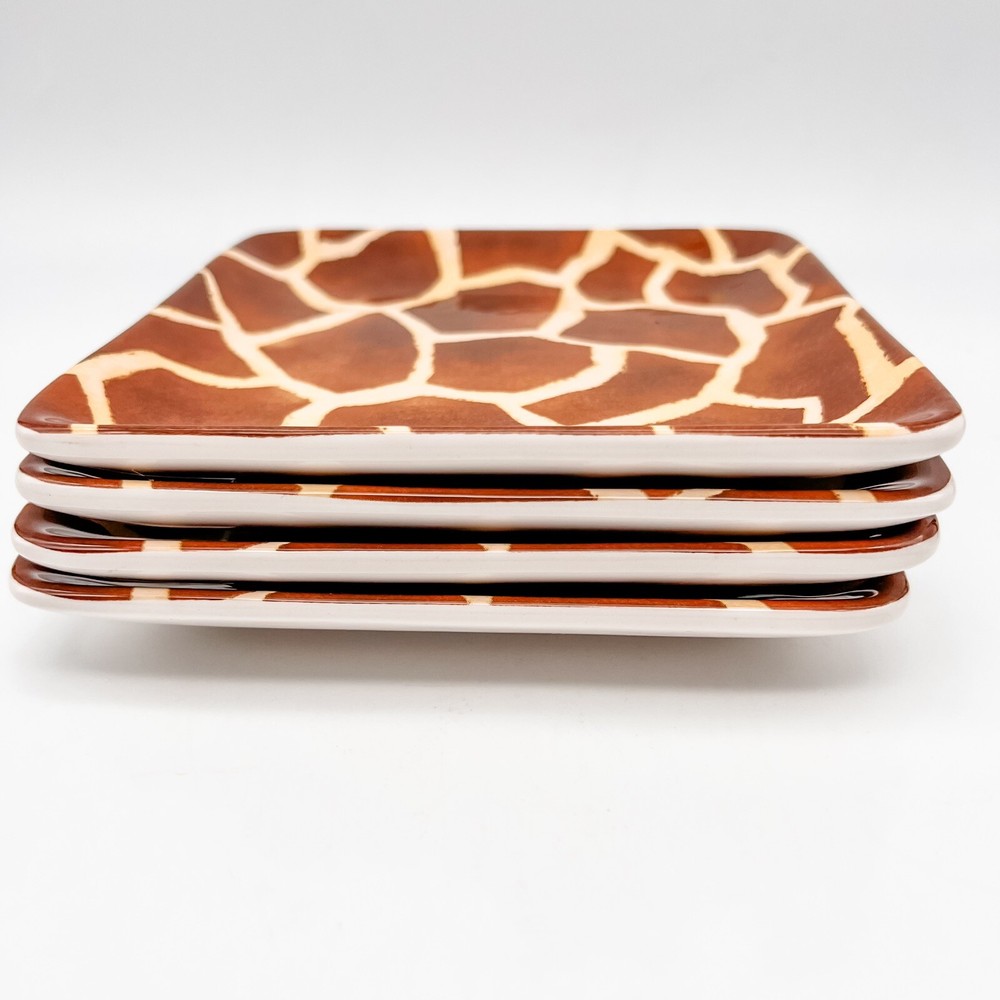 I don't know about you, but I still miss Pier One! They had so many unique and fun items for the home, just like this set of four small plates (6" square) that can be used for appetizers, bread, or desserts. Or use them as small serving plates on your buffet table for canapes or relishes. The giraffe print pattern would pair well with cream or dark green dinner plates for a stunning table setting. They are in excellent condition and will be wrapped and packed carefully for safe shipping.
