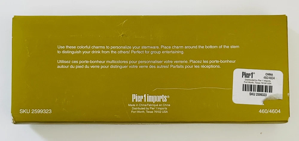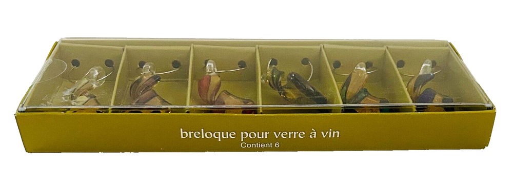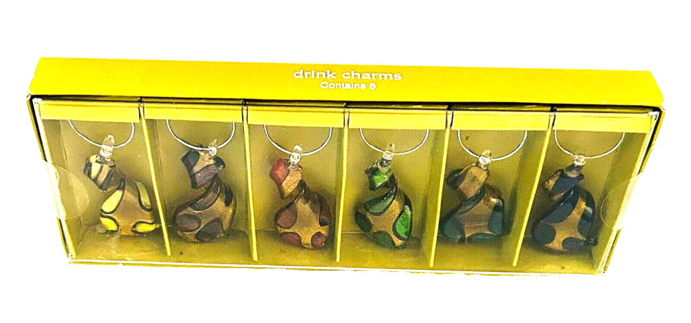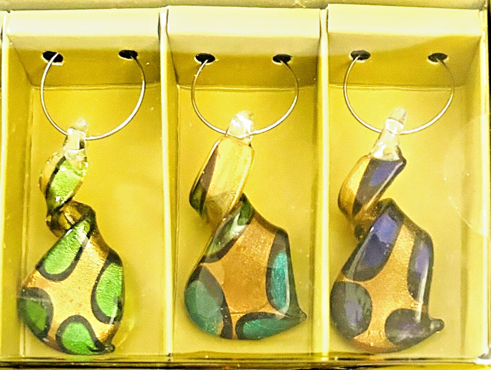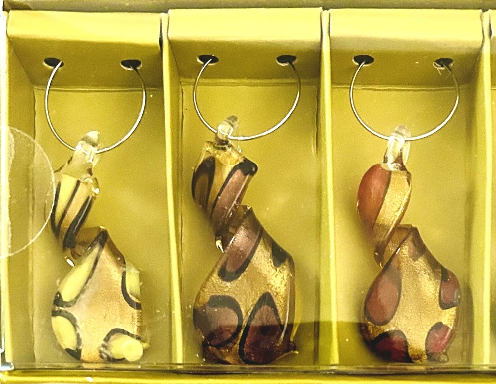 Glass Wine Charms Pier One Imports Set of 5 Multicolor Swirl Design. These glass wine charms are fun and whimsical and quite beautiful. They are an almost metallic gold color with each one featuring a different color design. They are in very good condition and are still in their original and unopened box. The charms measure approximately 2 inches long by .75 inches wide. Including their ring they measure about 2.5 inches long. Such a fun way to help your guests remember what glass belongs to them.
