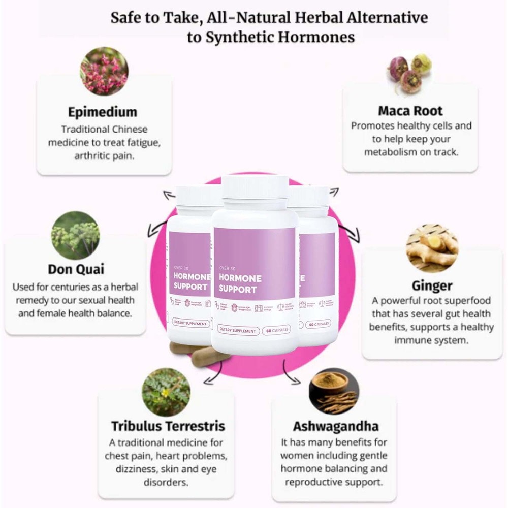 WHAT’S INSIDE? Over 30 Hormone Support is an all natural, easy to swallow capsule that contains a powerful and precise blend of ancient hormone balancing Golden Ratio of herbs including Don Quai, Maca Root, Ginger, Tribulus Terrestris and Ashwagandha. WHY SHOULD YOU TAKE OVER 30 HORMONE SUPPORT? The woman's body has three key hormones: cortisol, insulin and estrogen. At the age of 25 these hormones peak. By age 30 they start to naturally decrease resulting in the body’s metabolism to slow down. HORMONE BALANCE - Over 30 Hormone Support provides relief from uncomfortable symptoms such as hot flashes, mood swings, irritability, and more. It also suppresses fat storing hormones and supports fat burning hormones in days. HIGH QUALITY - Over 30 Hormone Support is made with all natural ingredients and is a more Safe & Natural Herbal Solution to Synthetic Hormone Therapy. GET YOUR OLD SELF BACK - Over 30 Hormone Support helps reduce brain fog, and improves mental clarity.