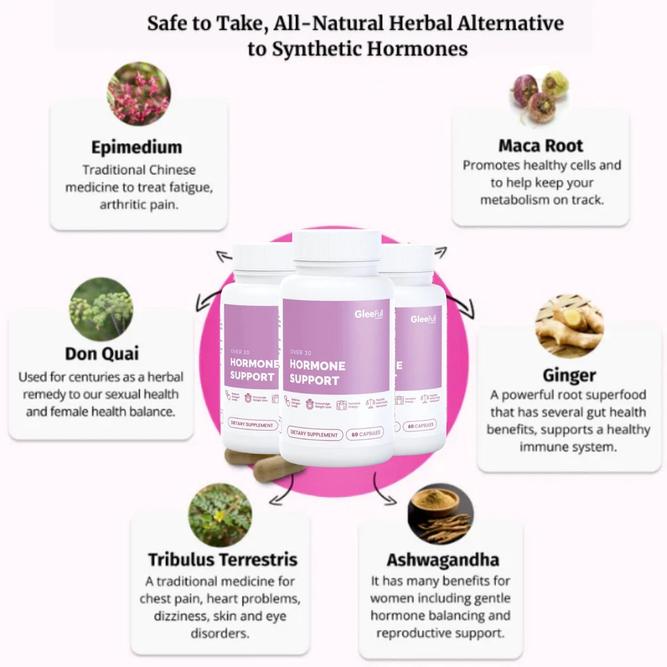 WHAT’S INSIDE? Over 30 Hormone Support is an all natural, easy to swallow capsule that contains a powerful and precise blend of ancient hormone balancing Golden Ratio of herbs including Don Quai, Maca Root, Ginger, Tribulus Terrestris and Ashwagandha. WHY SHOULD YOU TAKE OVER 30 HORMONE SUPPORT? The woman's body has three key hormones: cortisol, insulin and estrogen. At the age of 25 these hormones peak. By age 30 they start to naturally decrease resulting in the body’s metabolism to slow down. HORMONE BALANCE - Over 30 Hormone Support provides relief from uncomfortable symptoms such as hot flashes, mood swings, irritability, and more. It also suppresses fat storing hormones and supports fat burning hormones in days. HIGH QUALITY - Over 30 Hormone Support is made with all natural ingredients and is a more Safe & Natural Herbal Solution to Synthetic Hormone Therapy. GET YOUR OLD SELF BACK - Over 30 Hormone Support helps reduce brain fog, and improves mental clarity.