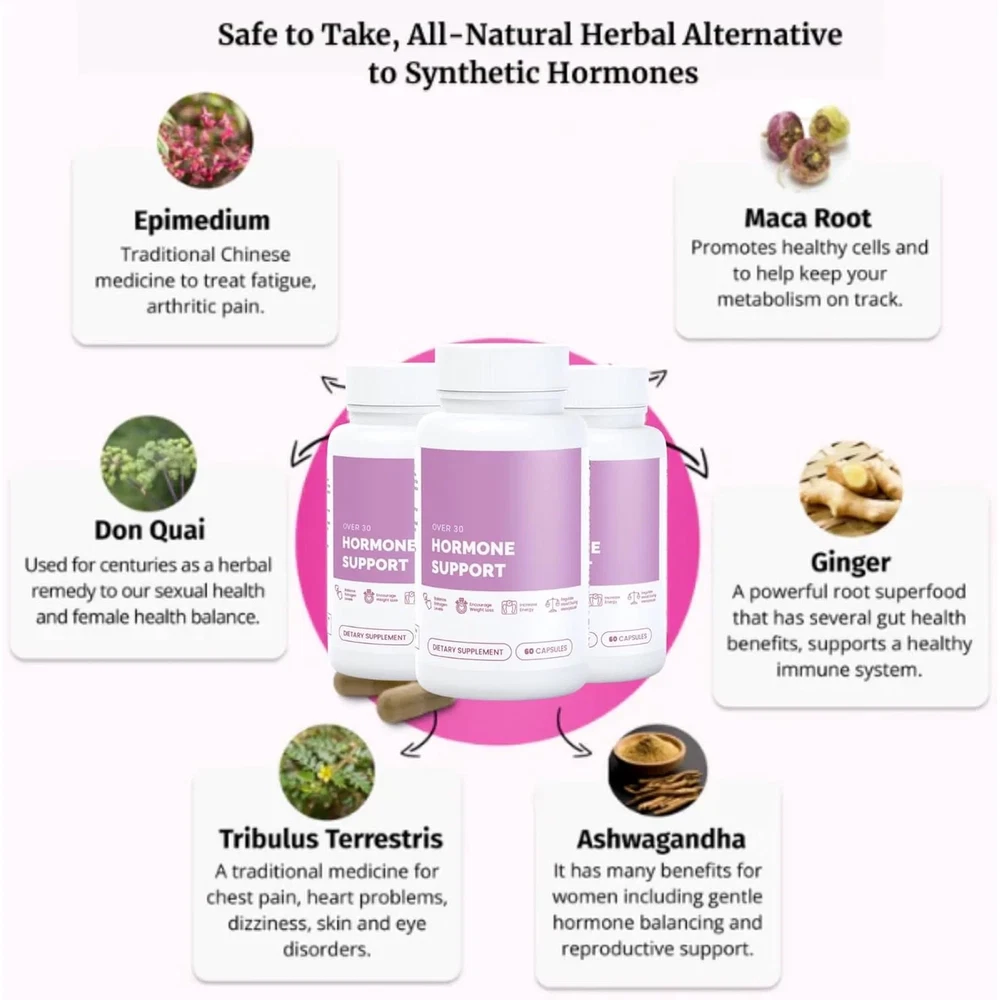 WHAT’S INSIDE? Over 30 Hormone Support is an all natural, easy to swallow capsule that contains a powerful and precise blend of ancient hormone balancing Golden Ratio of herbs including Don Quai, Maca Root, Ginger, Tribulus Terrestris and Ashwagandha. WHY SHOULD YOU TAKE OVER 30 HORMONE SUPPORT? The woman's body has three key hormones: cortisol, insulin and estrogen. At the age of 25 these hormones peak. By age 30 they start to naturally decrease resulting in the body’s metabolism to slow down. HORMONE BALANCE - Over 30 Hormone Support provides from uncomfortable symptoms such as hot flashes, mood swings, irritability, and more. It also suppresses fat storing hormones and supports fat burning hormones in days. HIGH QUALITY - Over 30 Hormone Support is made with all natural ingredients and is a more Safe & Natural Solution to Synthetic Hormone Therapy. GET YOUR OLD SELF BACK - Over 30 Hormone Support helps reduce brain fog, and improves clarity.