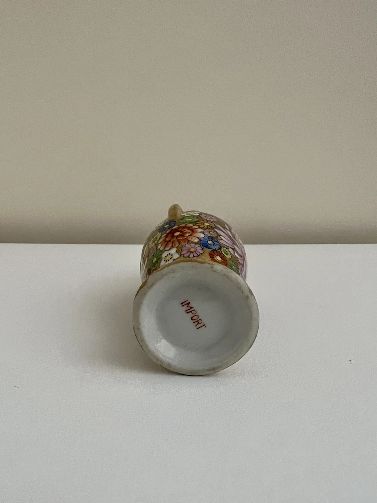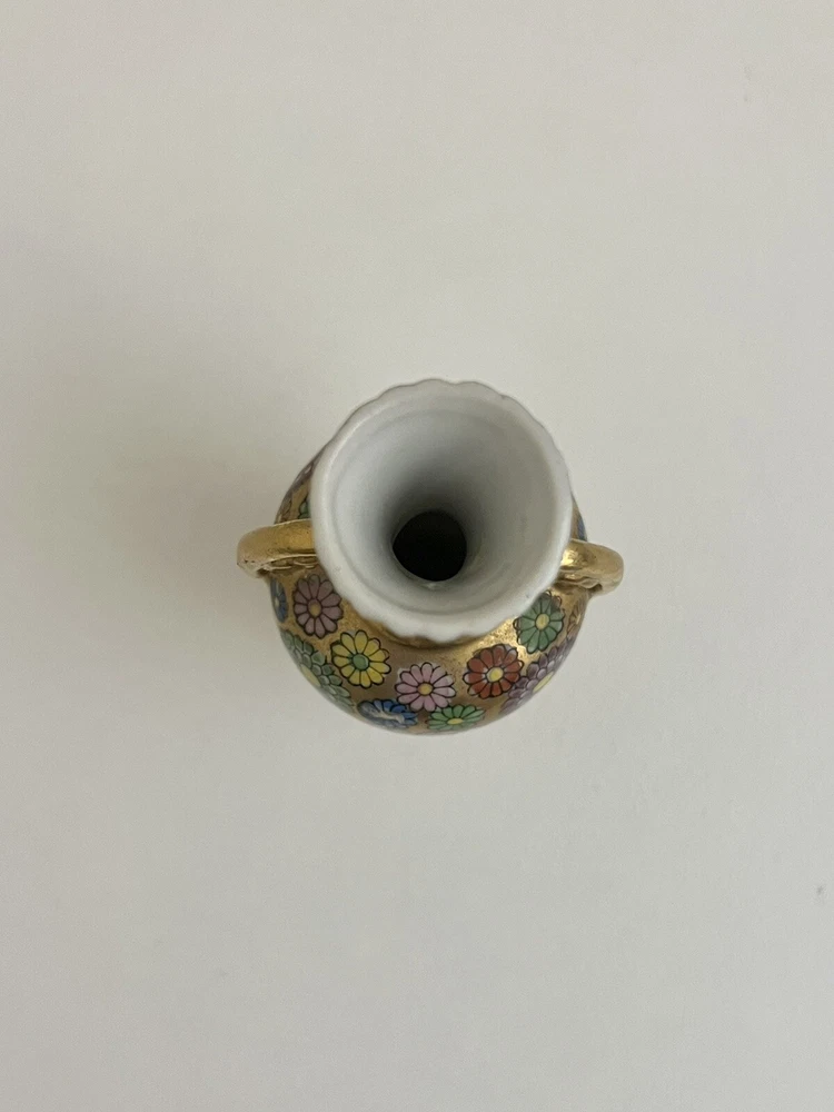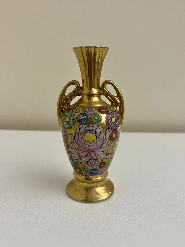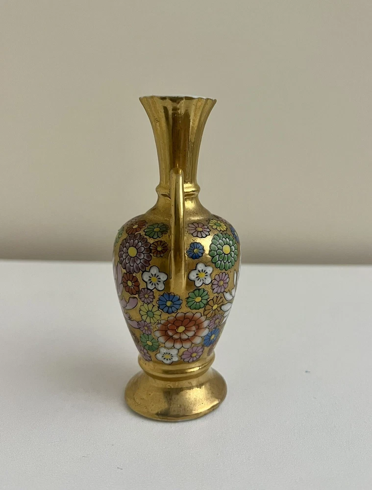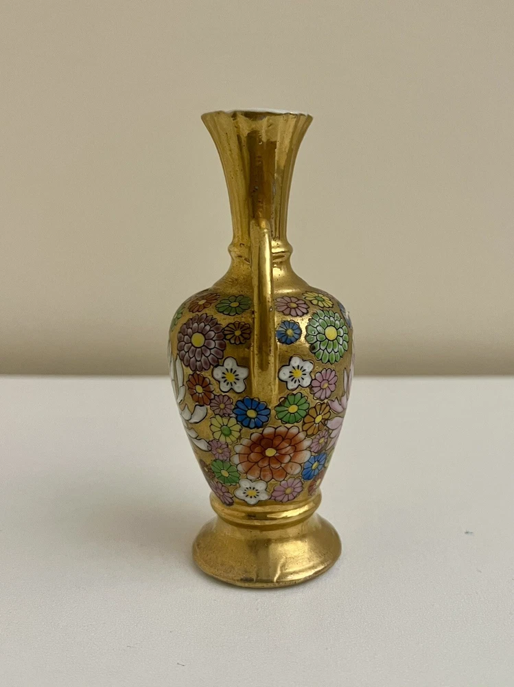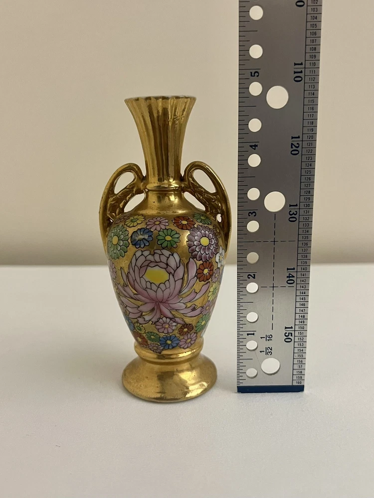 Gold Ceramic Bud Vase Hand Painted Gold Multicolor Floral Design Import Stamp on the bottom Pre-owned in Good Condition No Chips, No Cracks, No Repairs Measurements approx 5" Tall Please see pictures ...