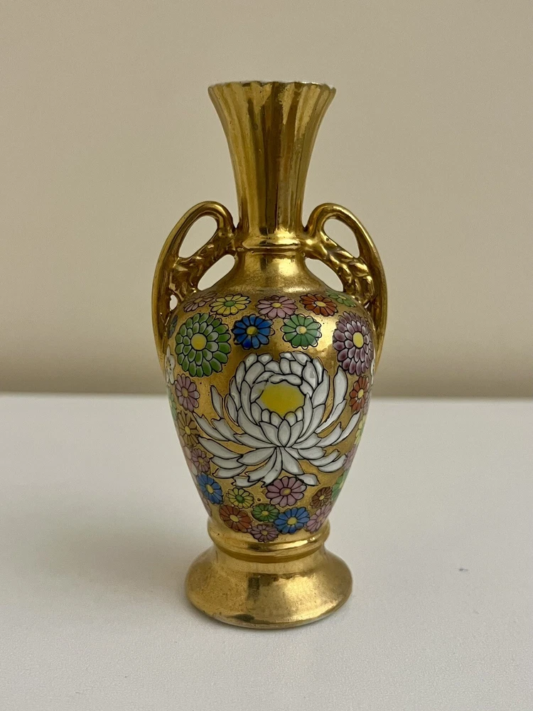 Gold Ceramic Bud Vase Hand Painted Gold Multicolor Floral Design Import Stamp on the bottom Pre-owned in Good Condition No Chips, No Cracks, No Repairs Measurements approx 5" Tall Please see pictures for details and closeups