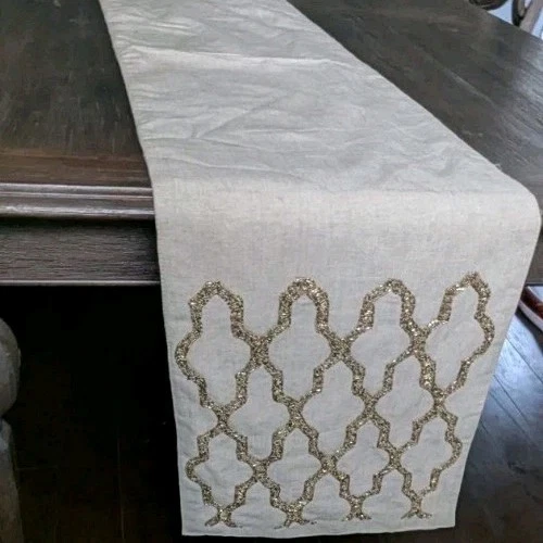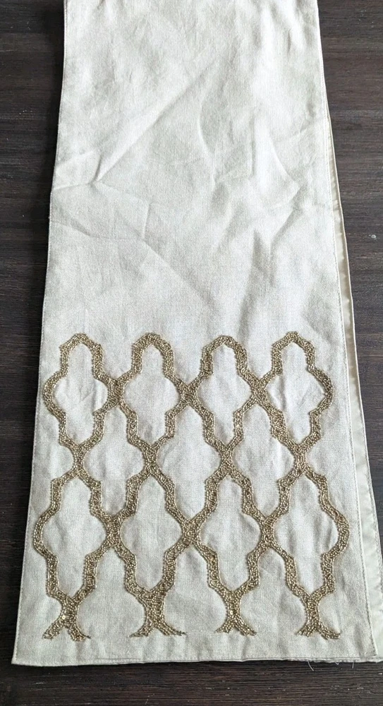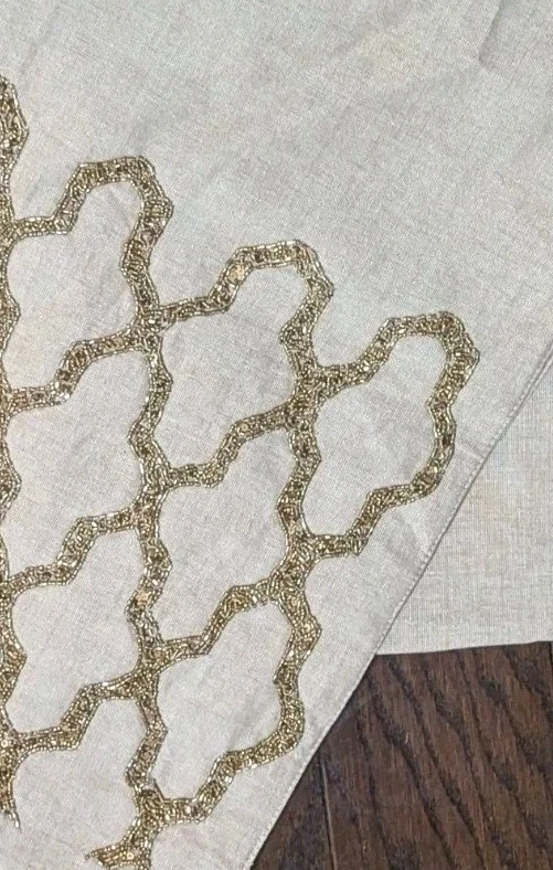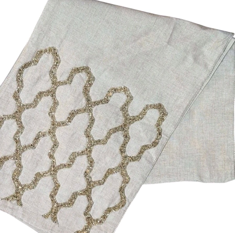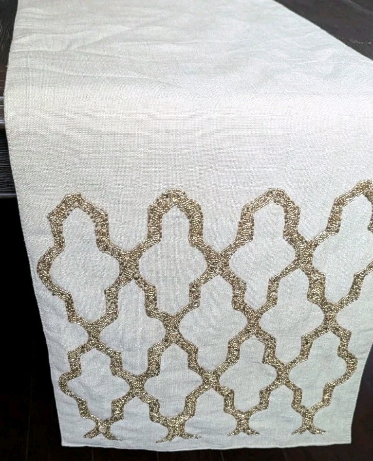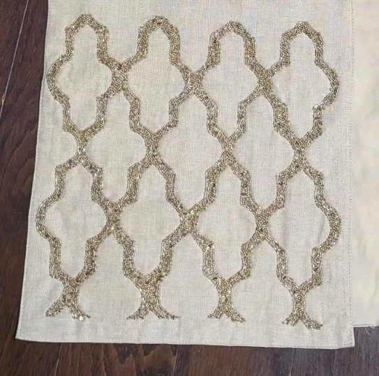 Gold Beaded Linen Table Runner Moroccan Quatrefoil Natural Bohemian Decor 72” x 14”...
