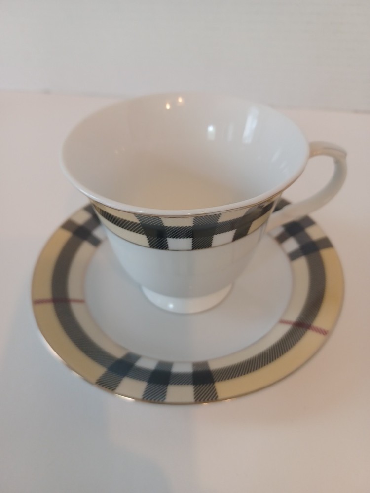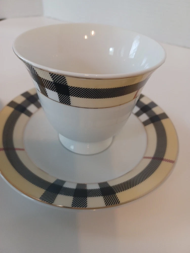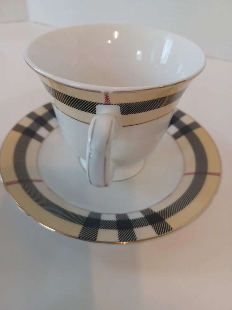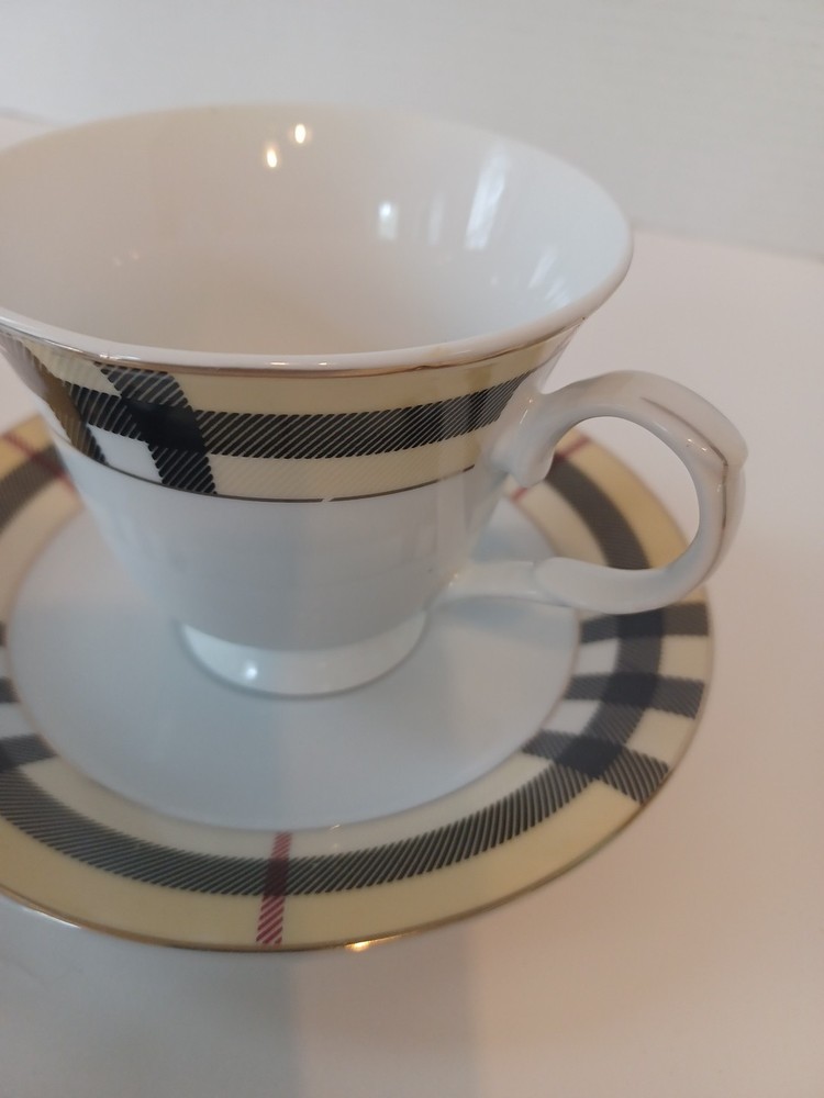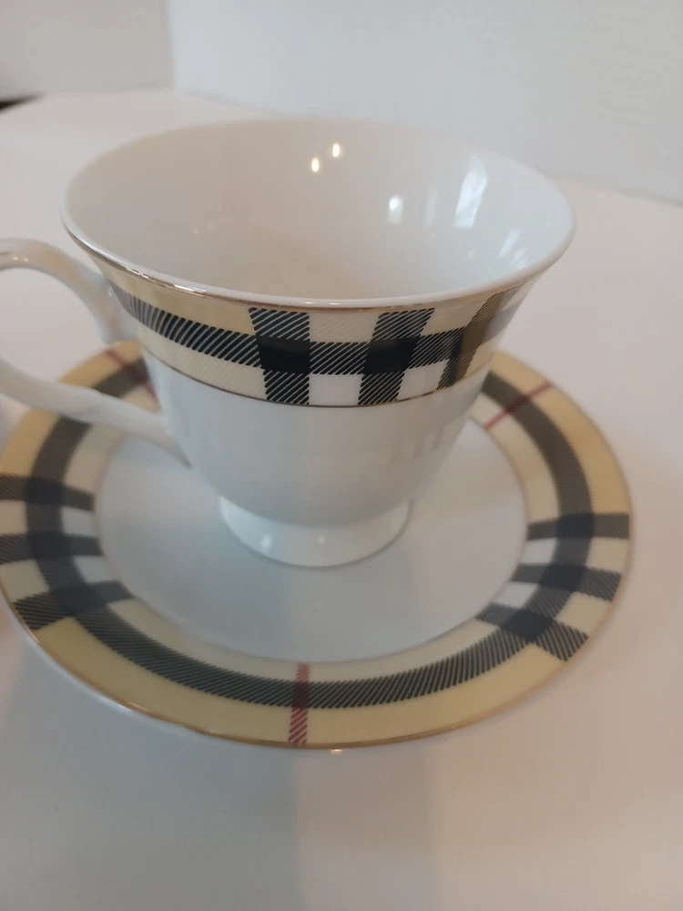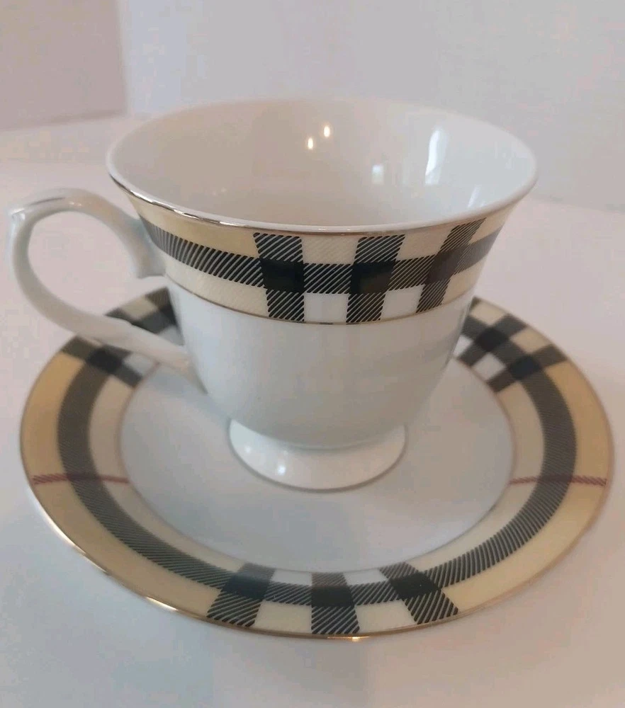 Fine Porcelain Tea cup and saucer set No chips, no cracks or crazing Perfect for all occasions Gold Star Imports Golden Tea Cup and Saucer Set Burberry-like plaid Pattern By German Design...