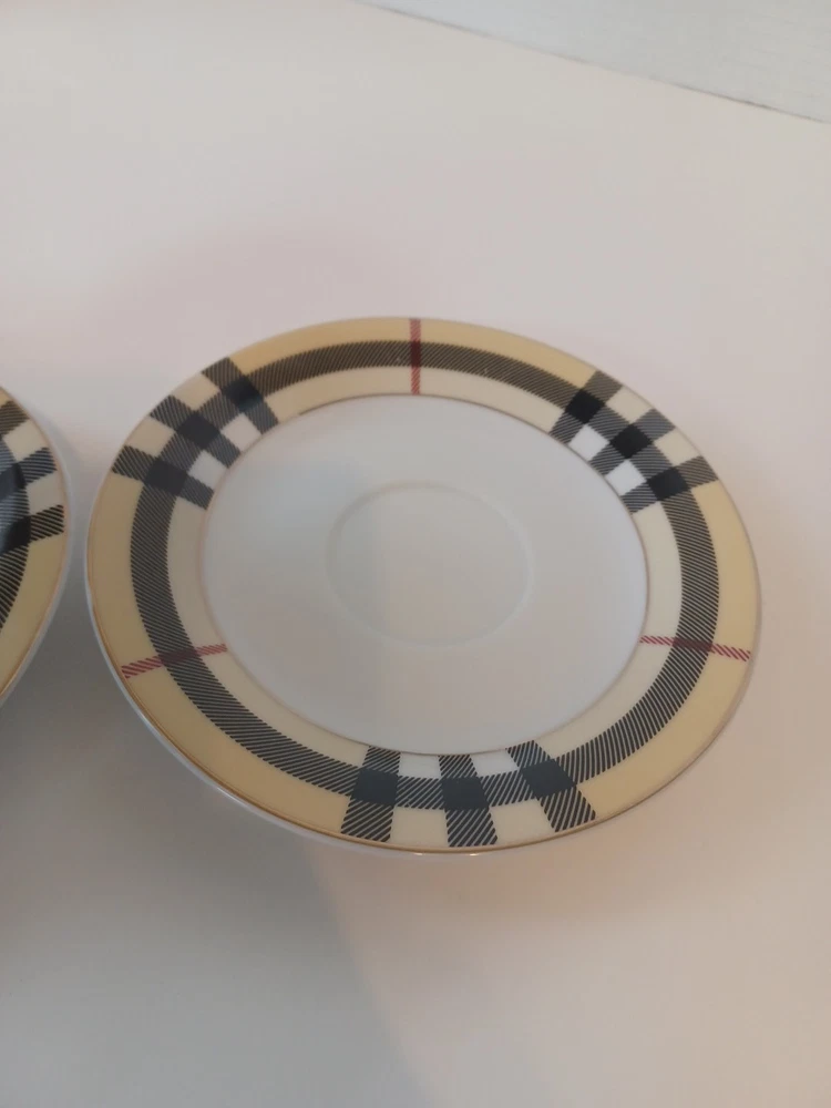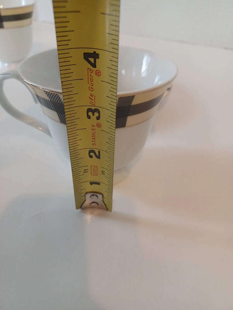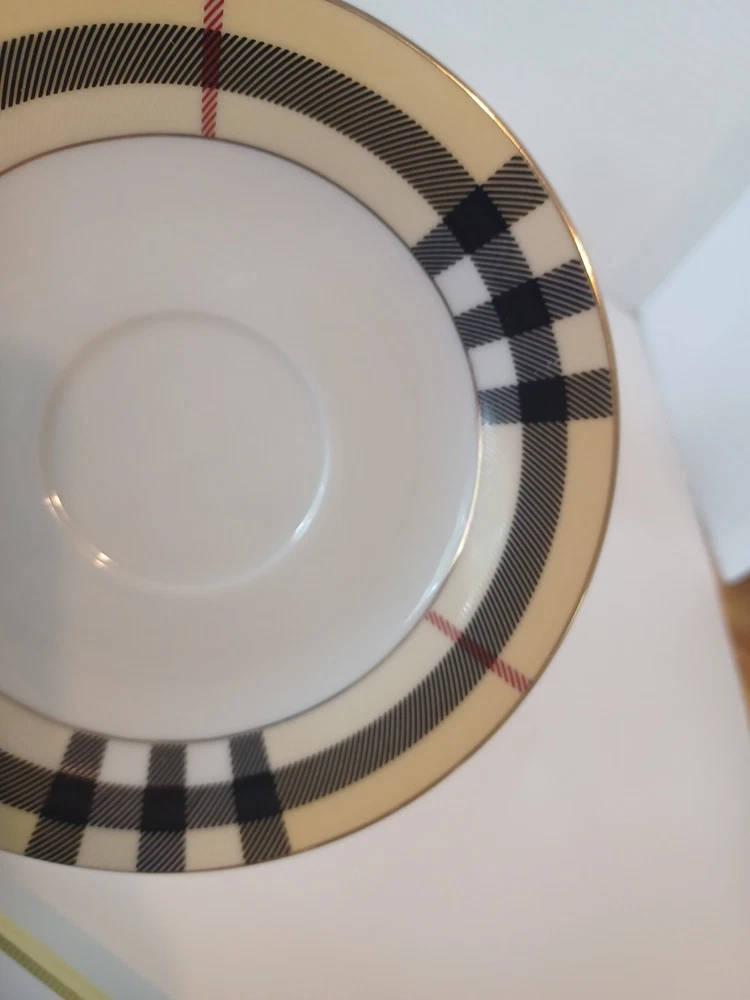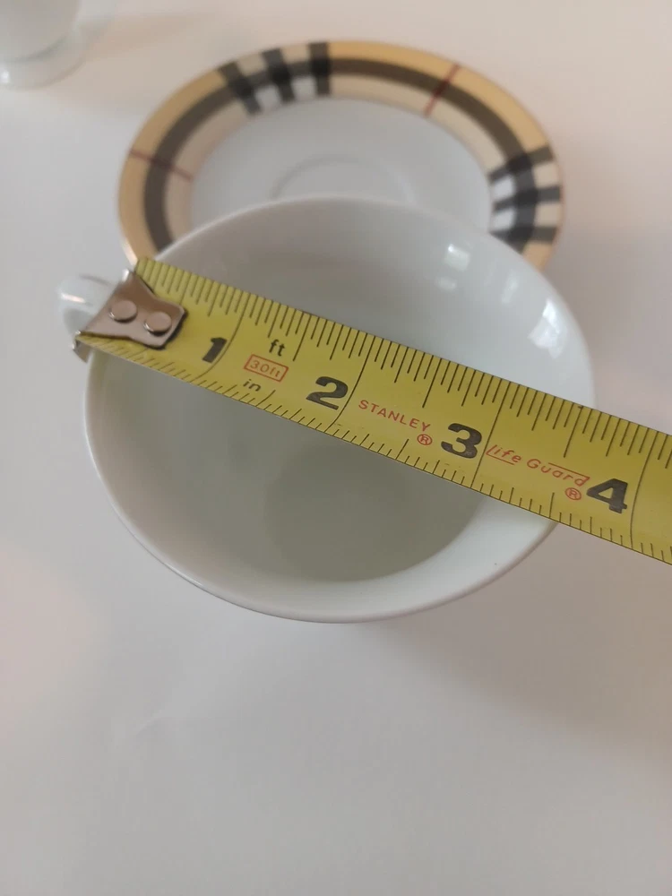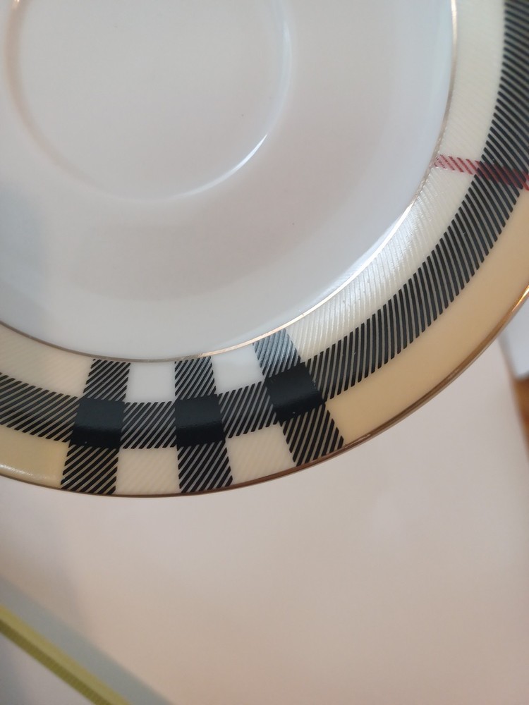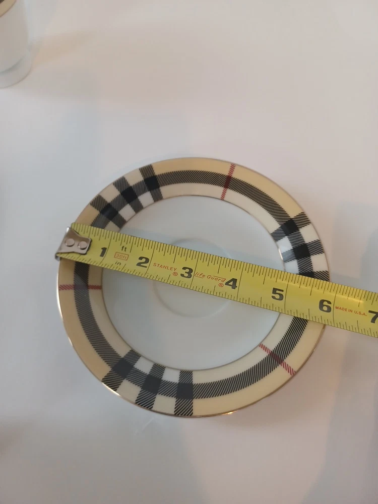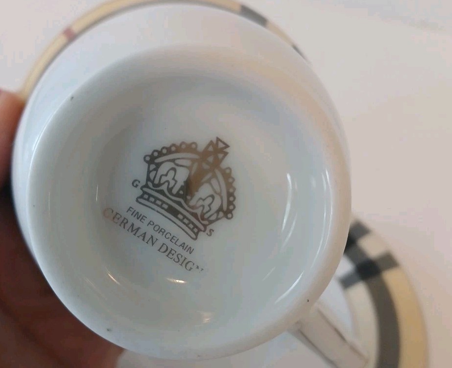Fine Porcelain Tea cup and saucer set No chips, no cracks or crazing Perfect for all occasions Gold Star Imports Golden Tea Cup and Saucer Set Burberry-like plaid Pattern By German Design...