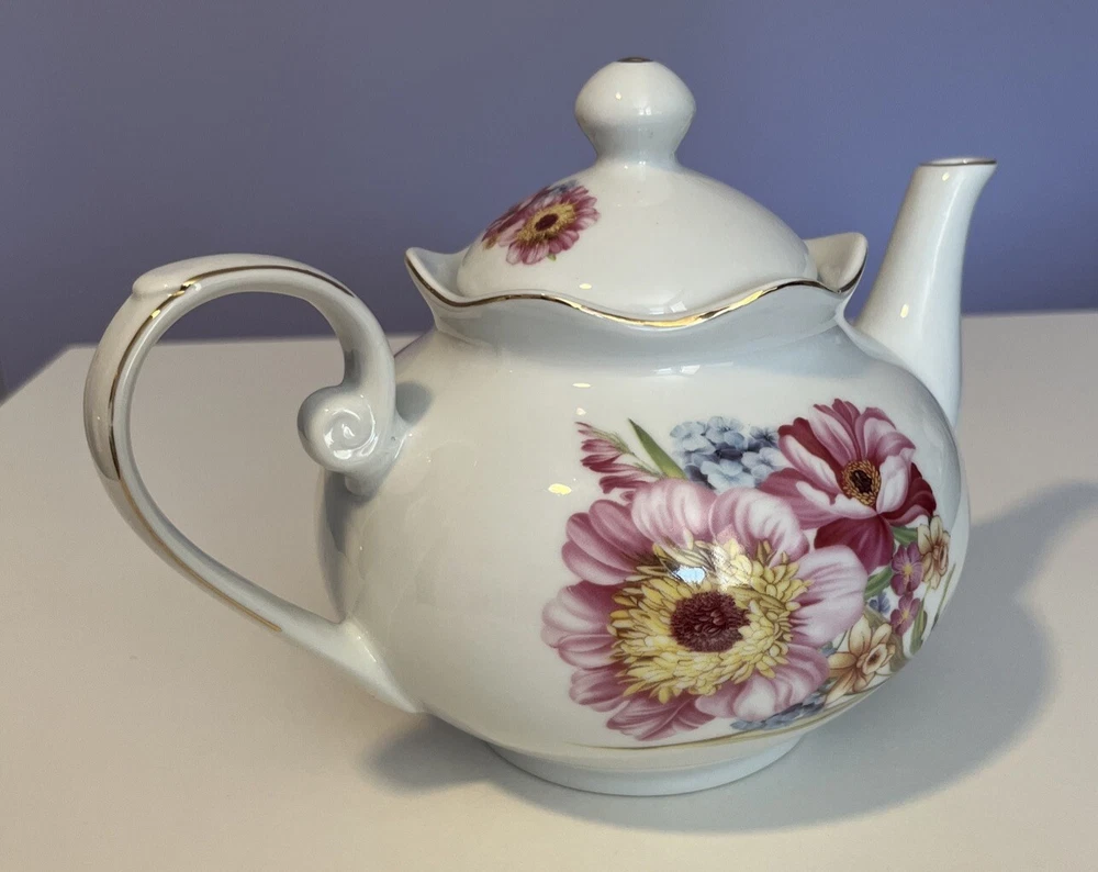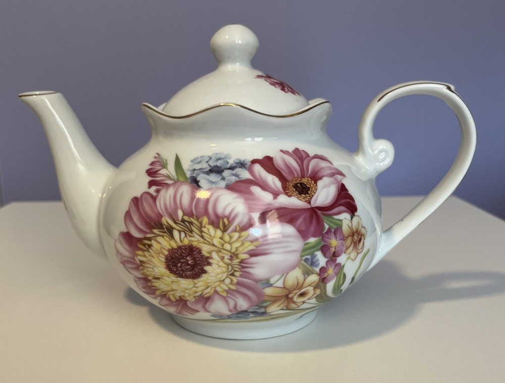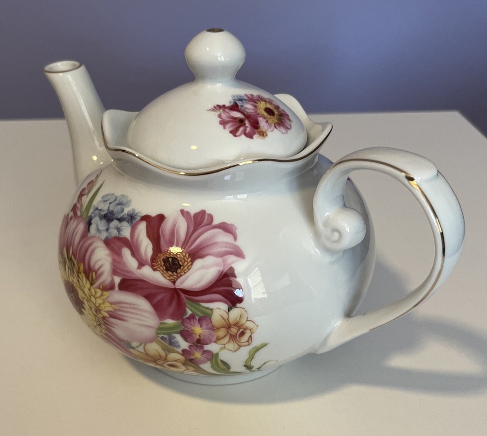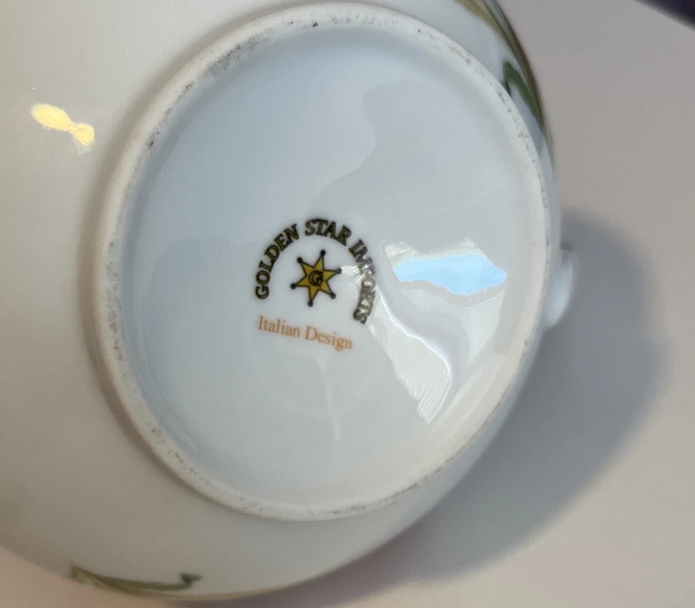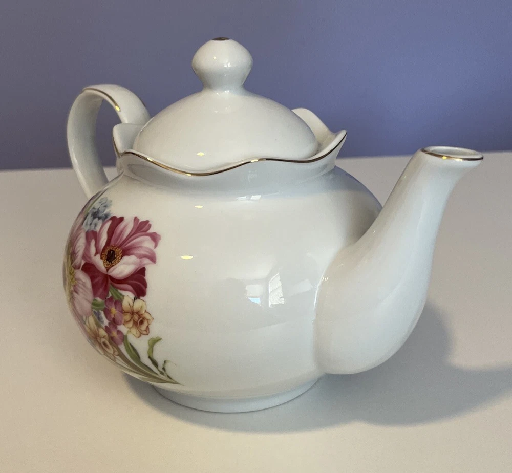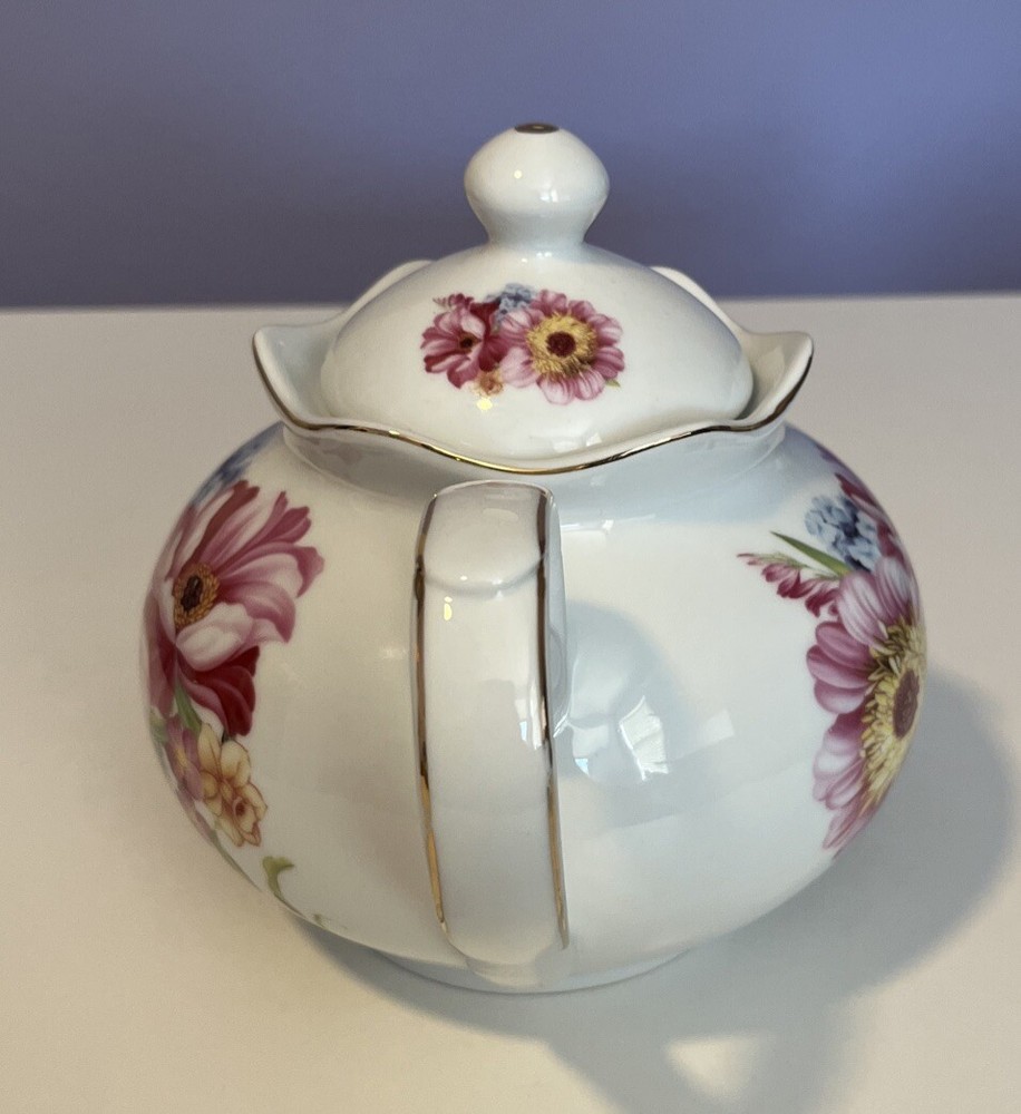 Golden Star Imports Italian Design Teapot White with Flowers and Gold Trim Stands 6" tall with Lid, approximately 8.75" long with spout and handle and 5.75" wide or diameter of pot. Cute squat little pot with pretty flowers in Pinks, Deep Pink/Red, Blue with Gold trim which shows minor wear due to age and use. Lid has not only inside lip to secure it but has it on both ends inside to ensure it stays on when pot is in use, a very nice feature. Please review all pictures carefully as they are part of the description. Questions are welcome.