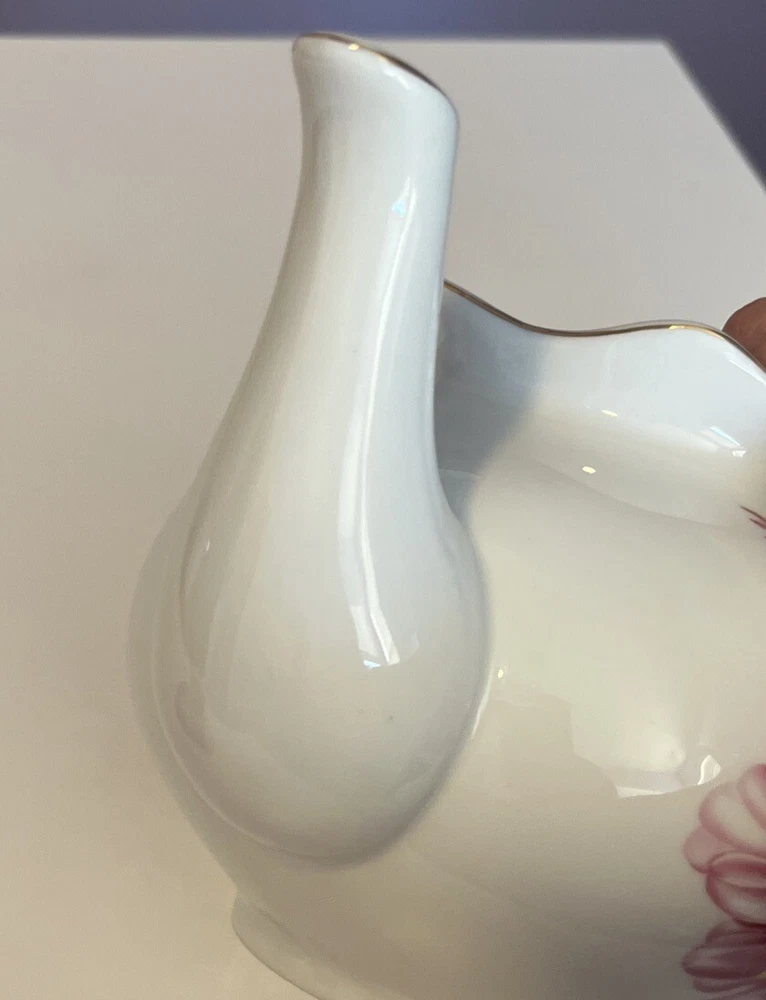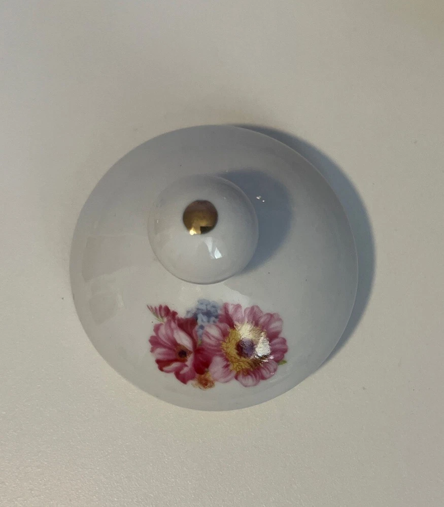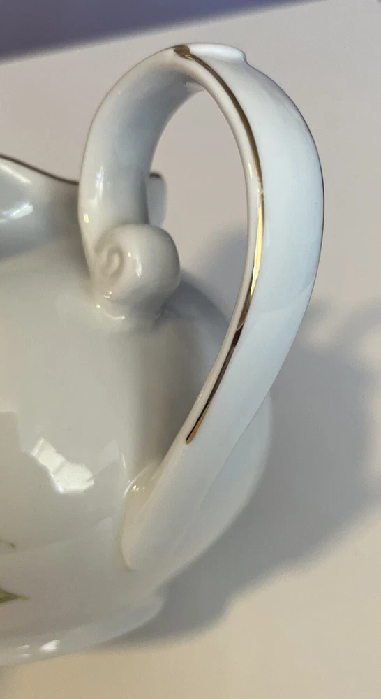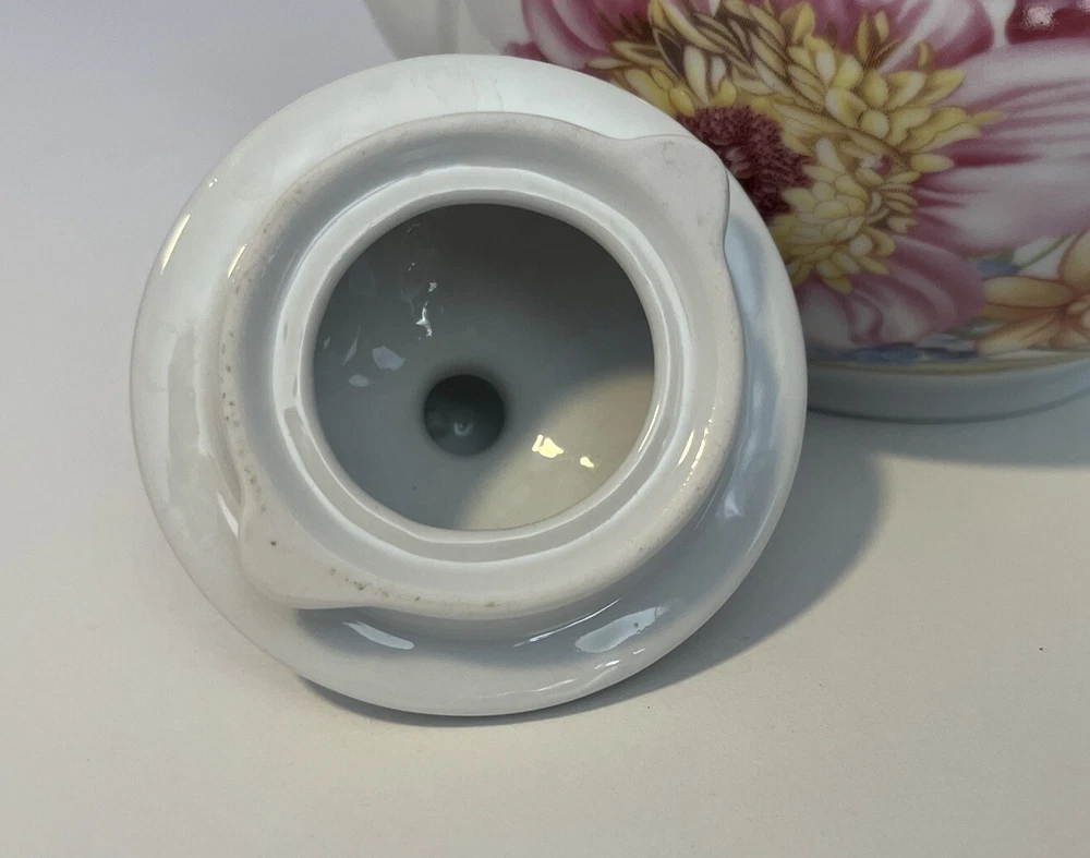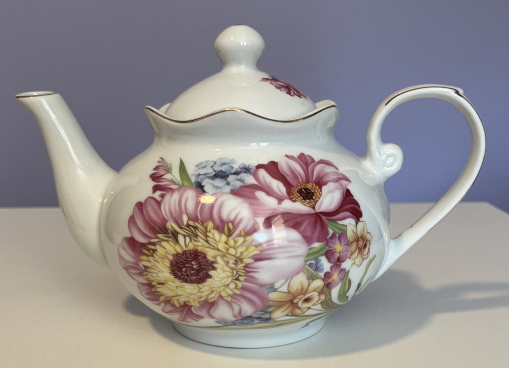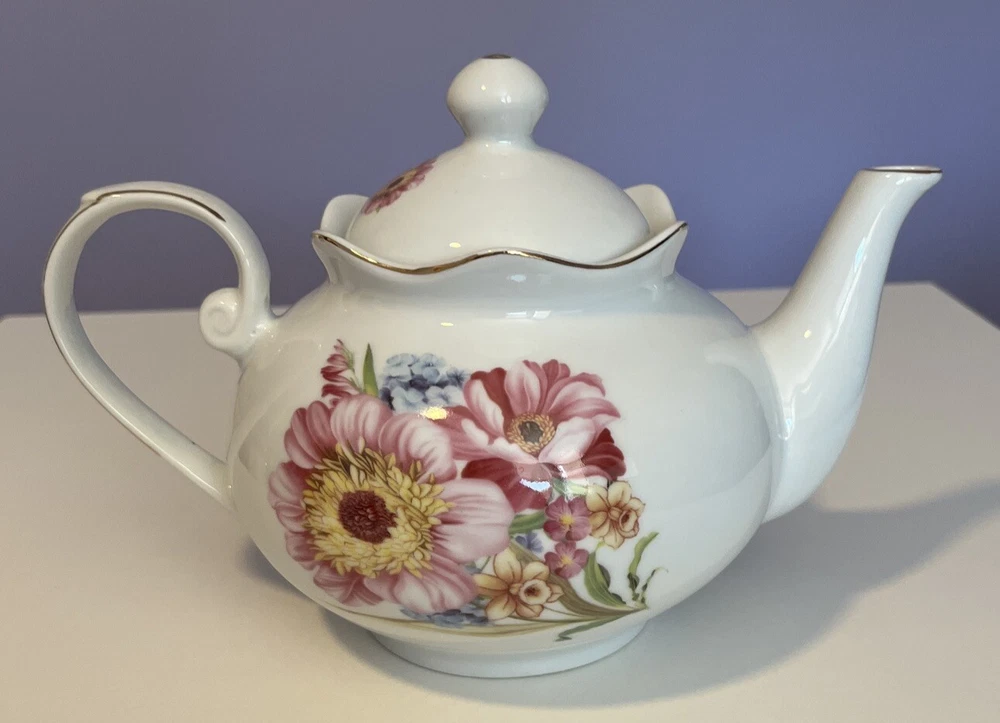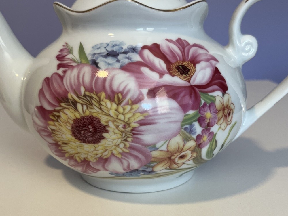 Golden Star Imports Italian Design Teapot White with Flowers and Gold Trim Stands 6" tall with Lid, approximately 8.75" long with spout and handle and 5.75" wide or diameter of pot. Cute squat little pot with pretty flowers in Pinks, Deep Pink/Red, Blue with Gold trim which shows minor wear due to age and use. Lid has not only inside lip to secure it but has it on both ends inside to ensure it stays on when pot is in use, a very nice feature. Please review all pictures carefully as they are part of the description. Questions are welcome.
