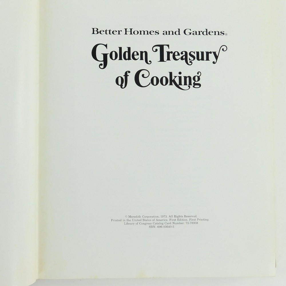 Golden Treasury of Cooking, Better Homes & Gardens 1973 Binding is tight and all pages intact. Spine is clean, not cracked or creased from opening book, but has a bump on the top corner. Cover corners have bumps & dings. Cover has some foxing within the gloden texture - see pics. No writing, rips or tear outs found. Age toning and some light foxing is present. From estate. Find More Exciting and Unique Merchandise in our eBay Store: Seeking Wares #3051.6 Please Note: International Buyers Import duties, taxes, and charges are not included in the item price or shipping cost. These charges are the buyer's responsibility. Please check with your country's customs office to determine what these additional costs will be prior to bidding or buying.