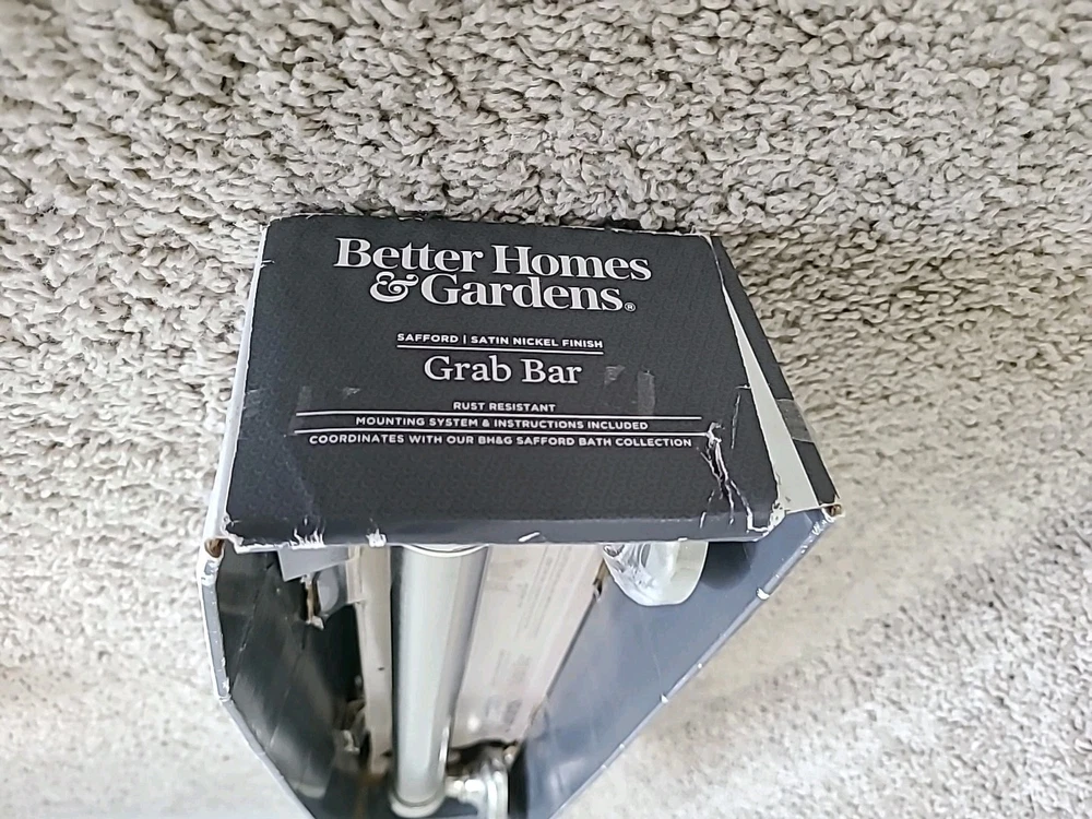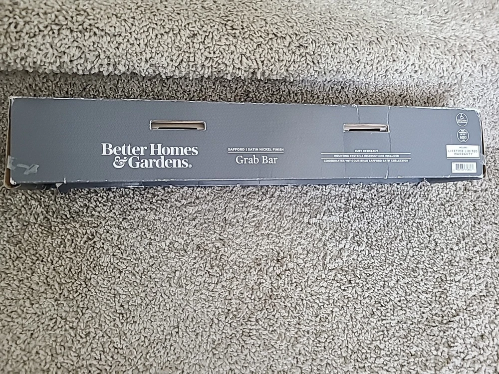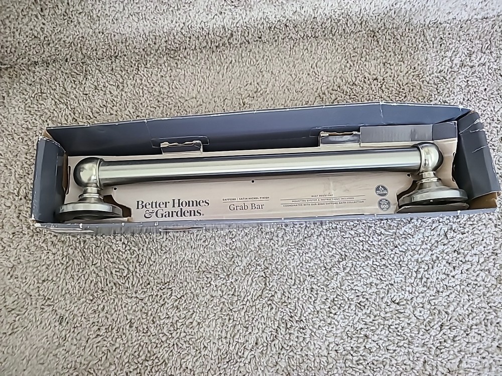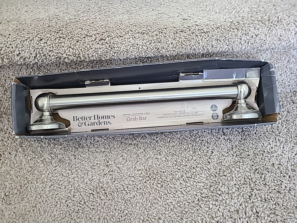 16" Grab Bar / Satin Nickle Finish / Rust Resistant / Safford Collection by Better Homes and Gardens / Open box - item never installed, still has clear protective cover on left and right covers / Promptly shipped
