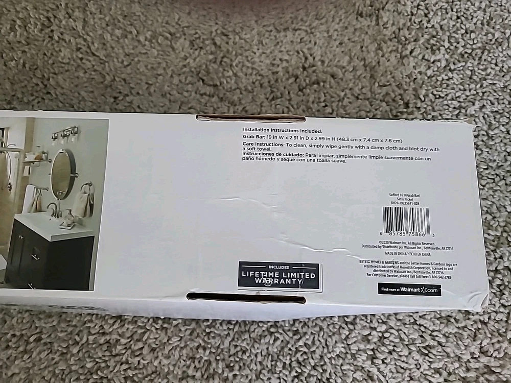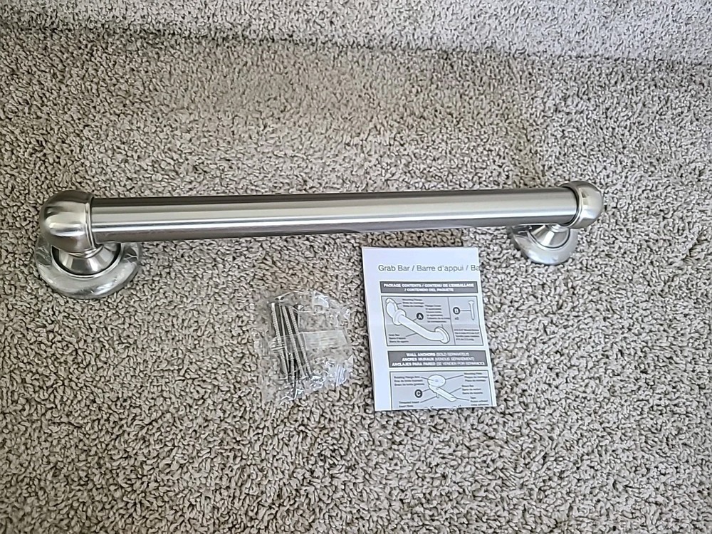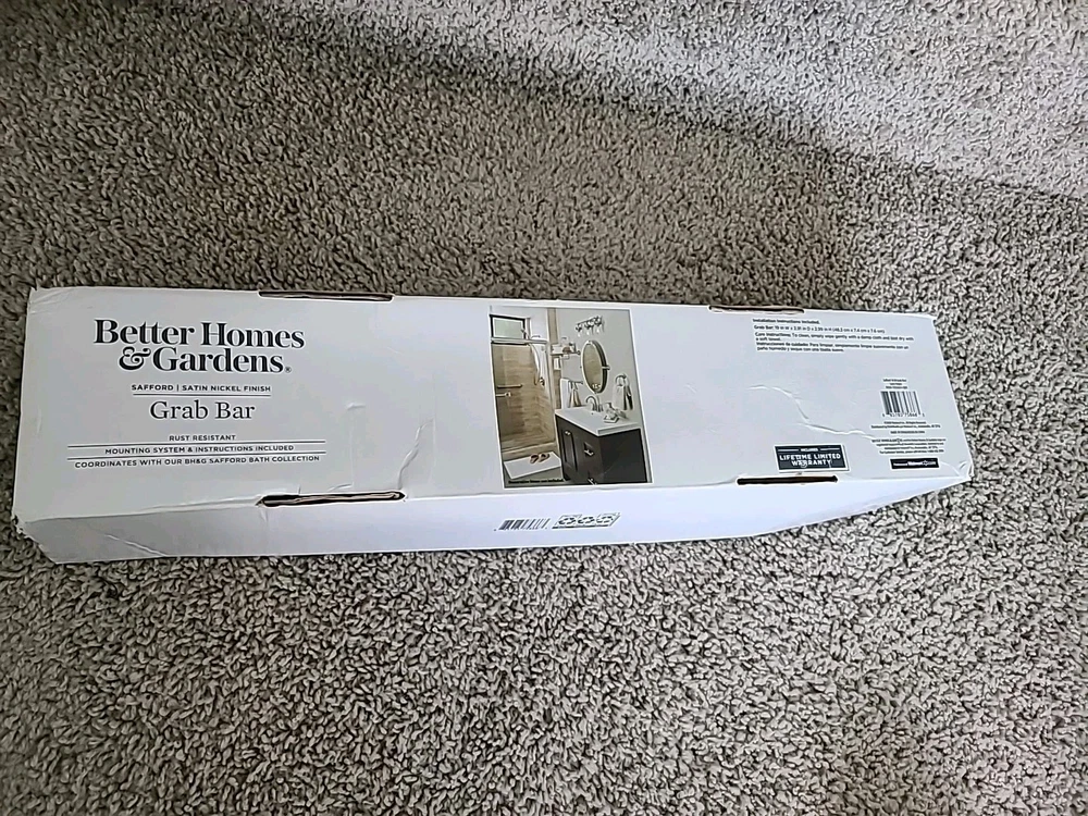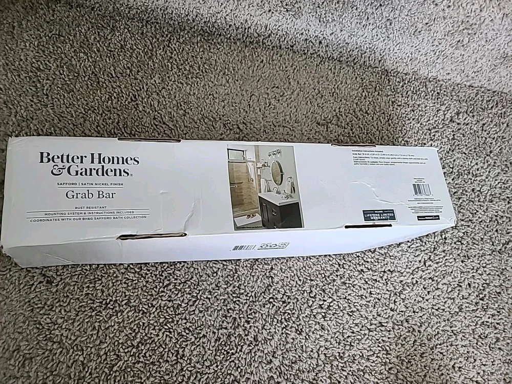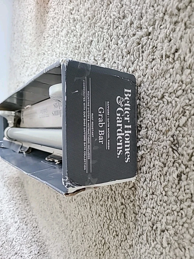 16" Grab Bar / Satin Nickle Finish / Rust Resistant / Safford Collection by Better Homes and Gardens / Open box - item never installed, still has clear protective cover on left and right covers / Promptly shipped