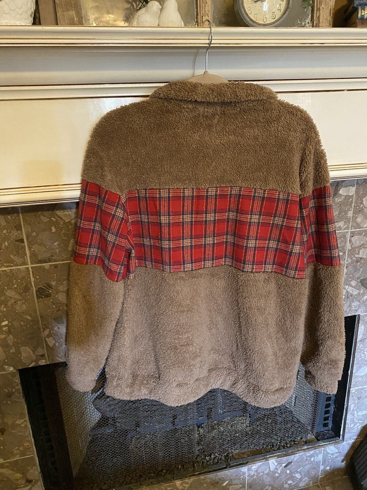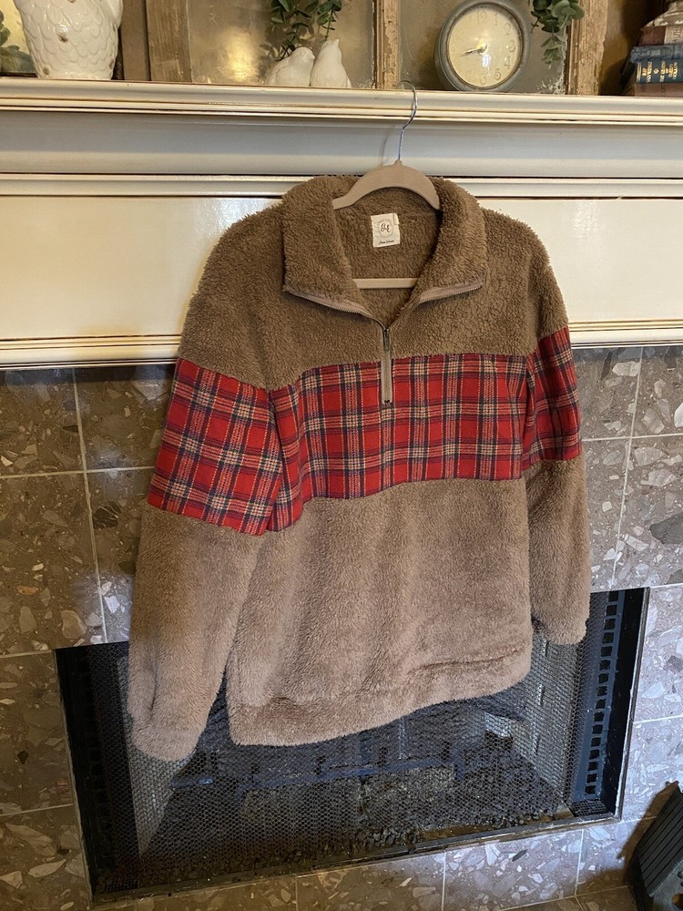 This Grace & Emma G+E sweatshirt is perfect for any cold weather occasion. The cozy brown Sherpa and red plaid flannel make it a stylish and comfortable choice for winter, fall, or spring. The oversized fit and 1/4 zip accent add to the unique design of this pullover, while the collared neckline and long sleeves ensure warmth and comfort. Whether you're lounging at home or out and about, this sweatshirt is sure to keep you cozy and fashionable. The 100% polyester material is durable and easy to care for, making it a great addition to any wardrobe. Don't miss out on this trendy piece from Grace and Emma!